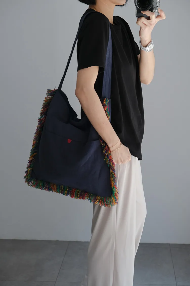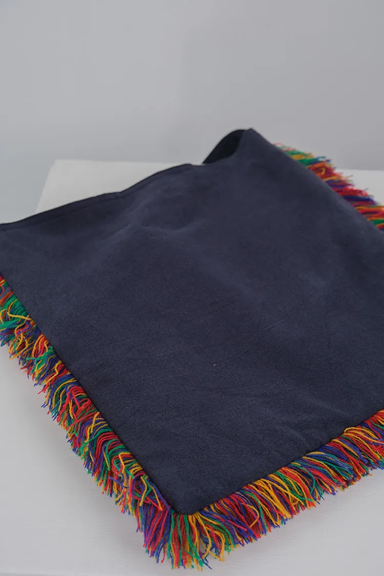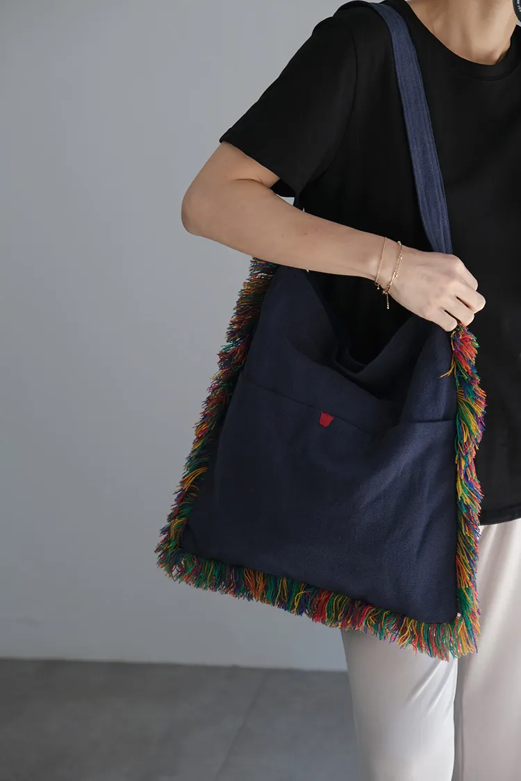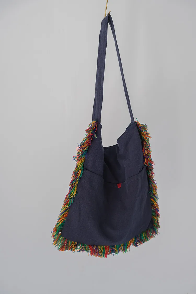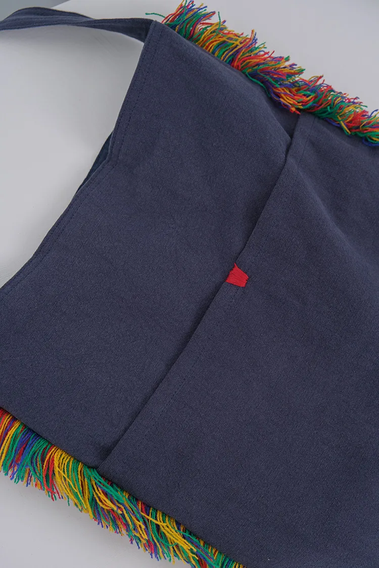 [成份] 100%棉[內裡] 純棉帆布,1格拉鍊內裡,2格收納空間(可收納手機或小物)[特點] 柔軟丹寧藍綿布,彩色毛線抽鬚滾邊,外側2小格收納空間,古銅磁鐵吸扣。*由於每個包包都是手工製作獨一無二,不會完全一樣,但整體氣質相同。