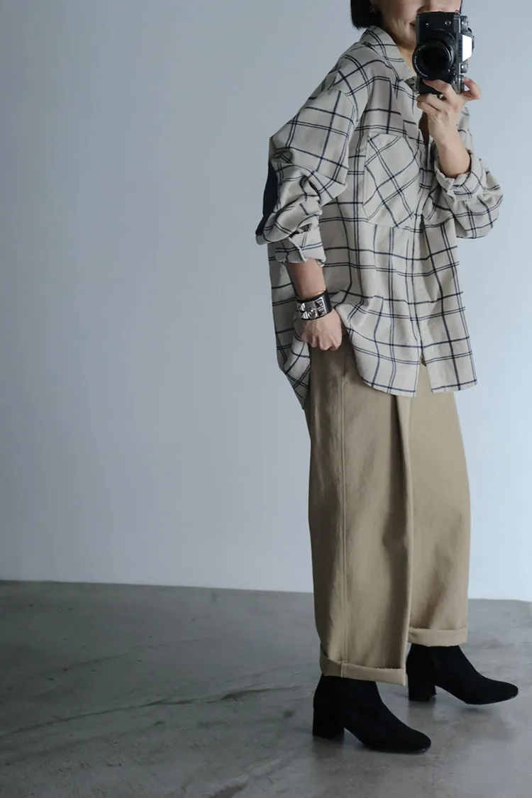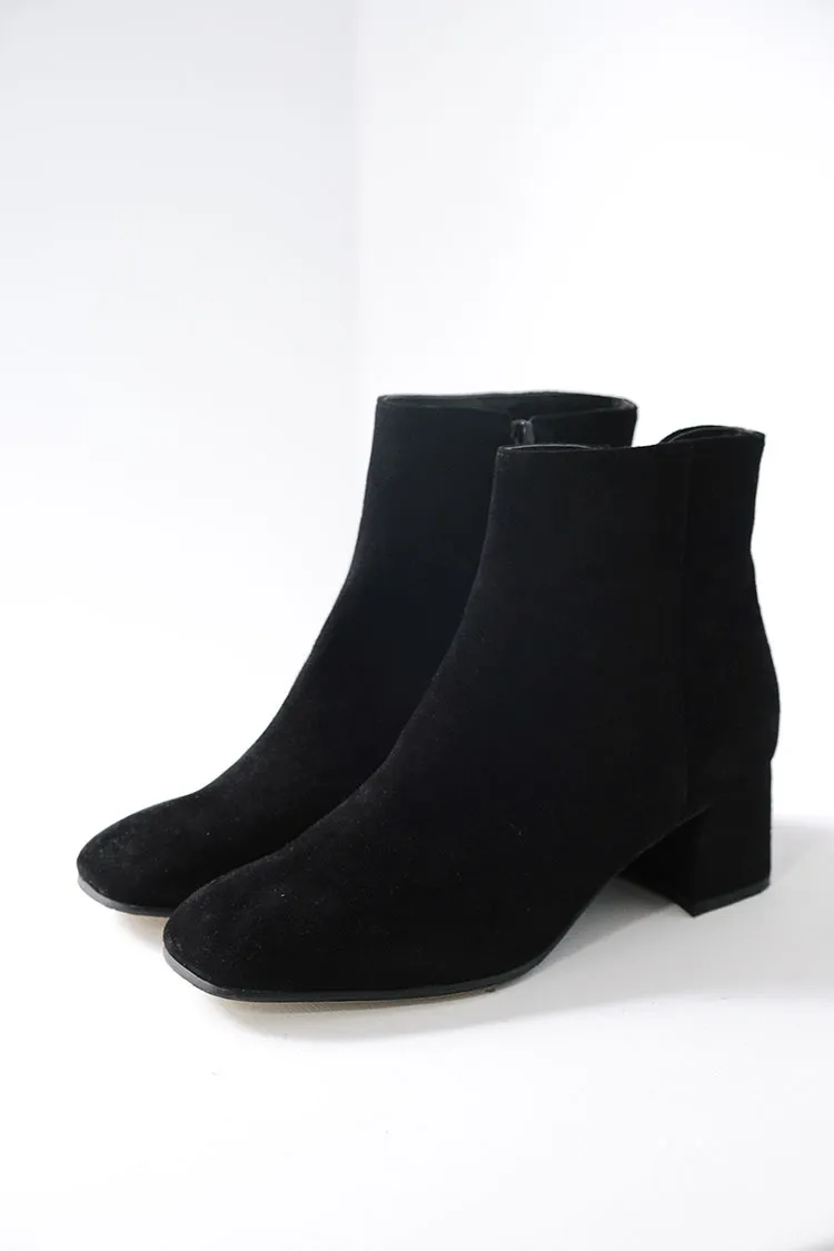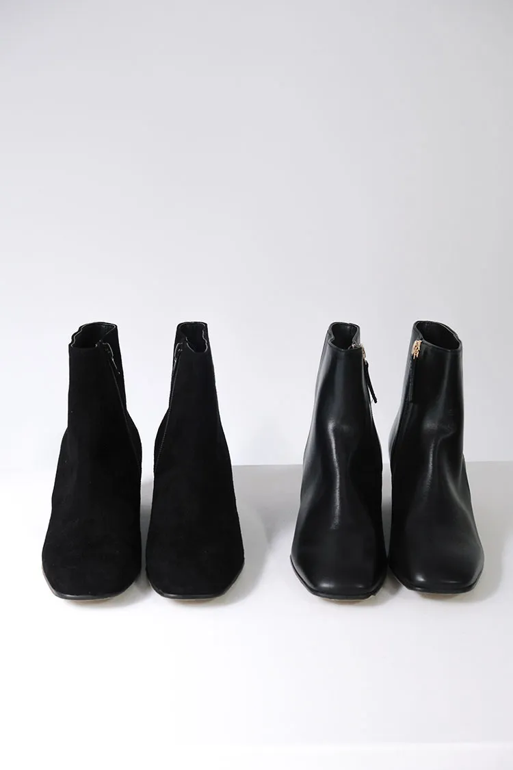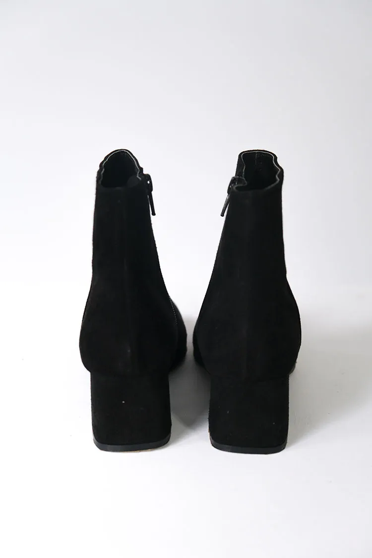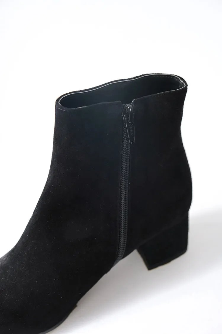 [特點] 使用不同皮革,滑料牛皮皮革及羊皮霧感麂皮,單一內側拉鍊穿脫,木頭底粗跟舒適好走。