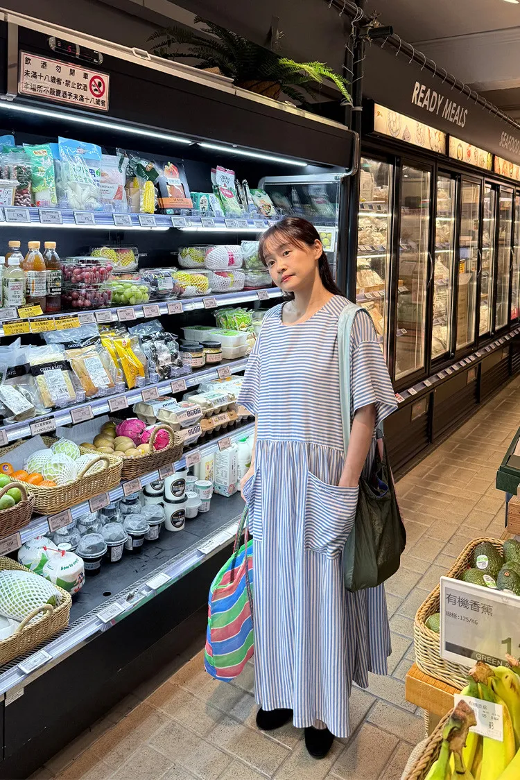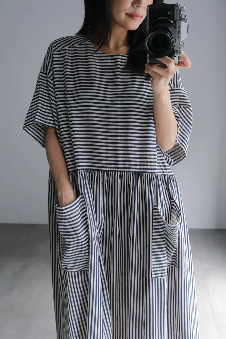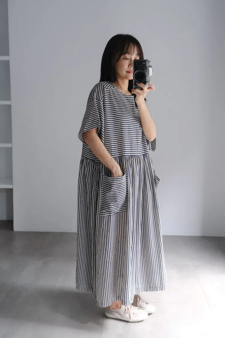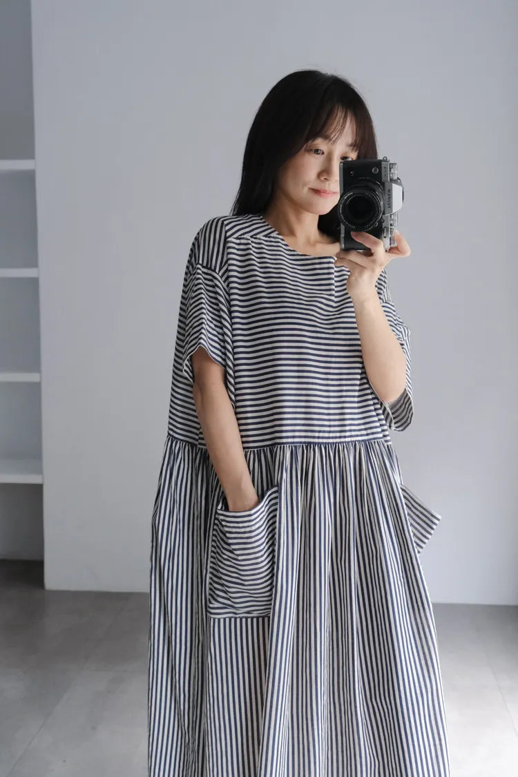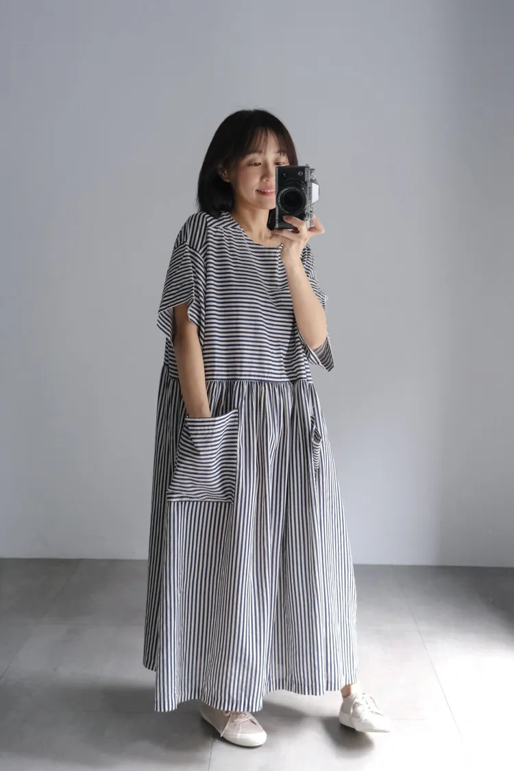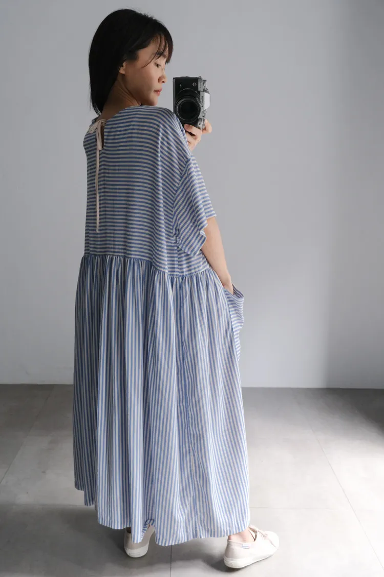 [特點] 後綁帶造型,棉麻手感親膚輕盈不悶熱,上半身橫條、下半身直條拼接設計。