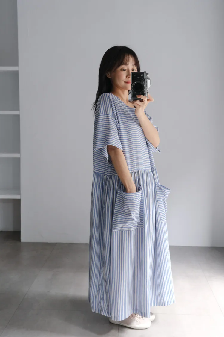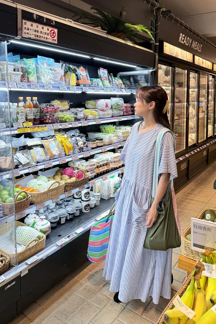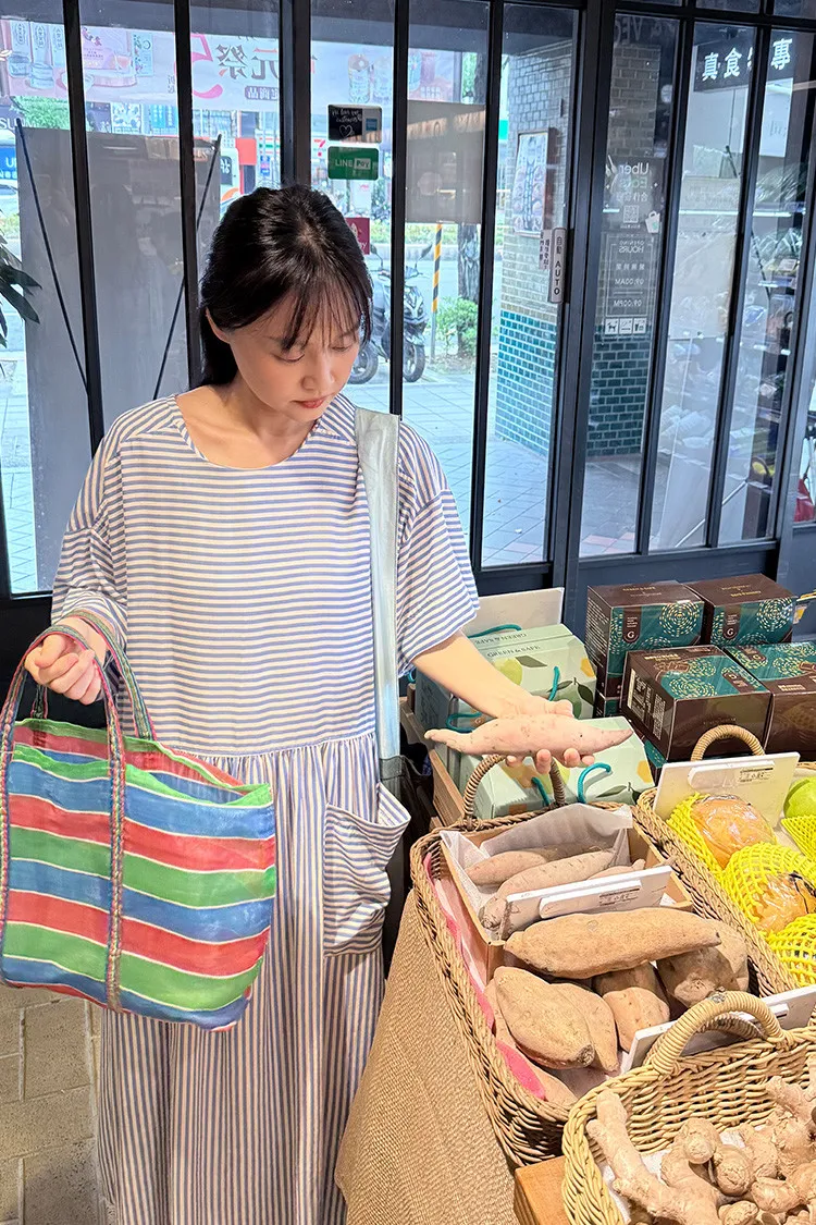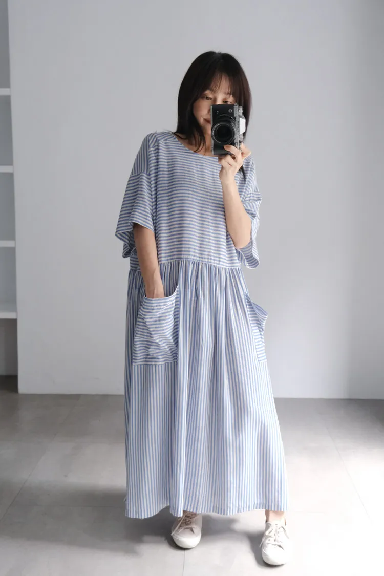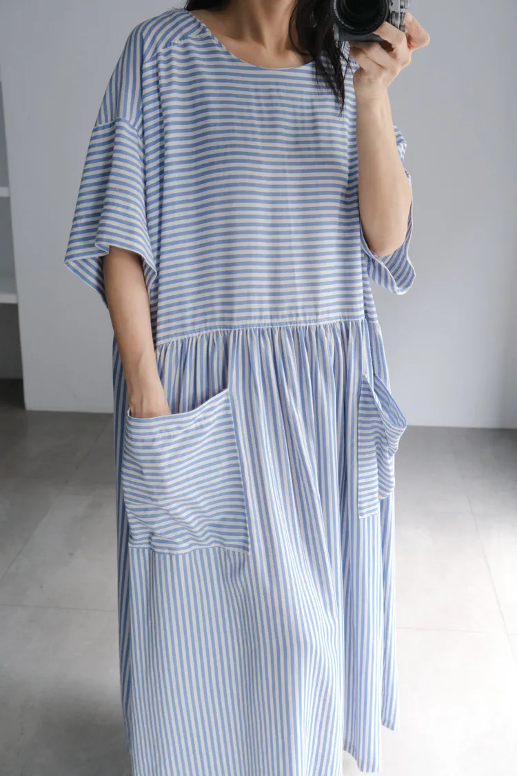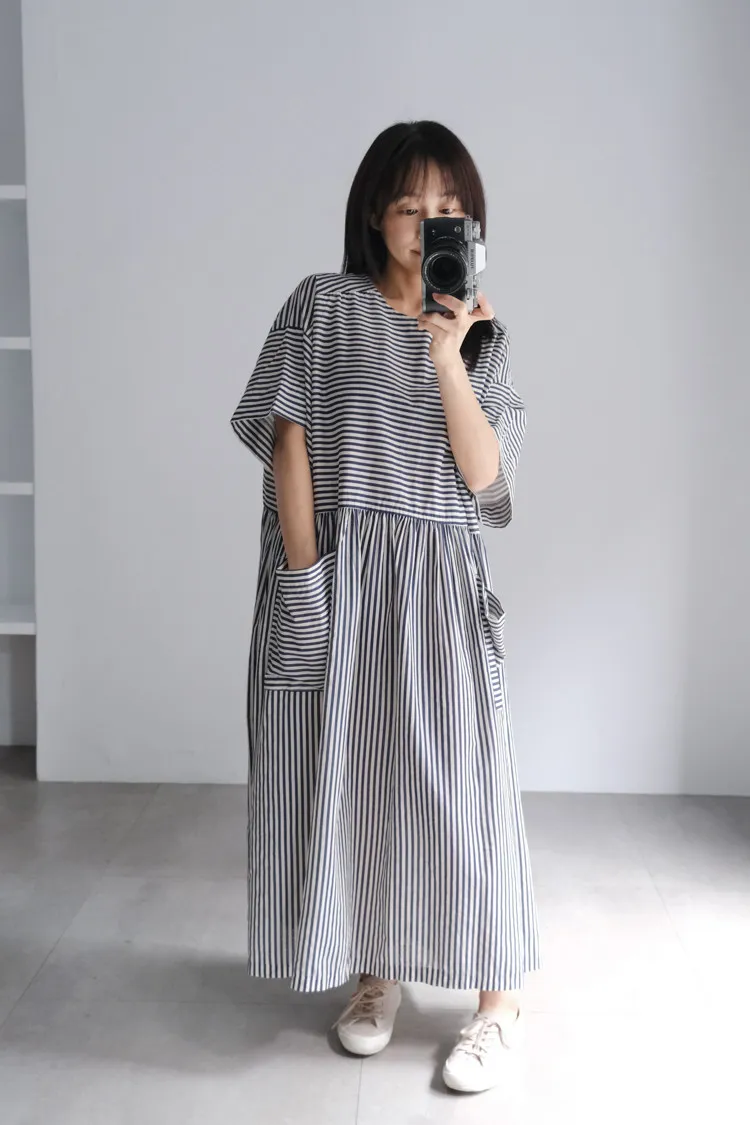 [特點] 後綁帶造型,棉麻手感親膚輕盈不悶熱,上半身橫條、下半身直條拼接設計。