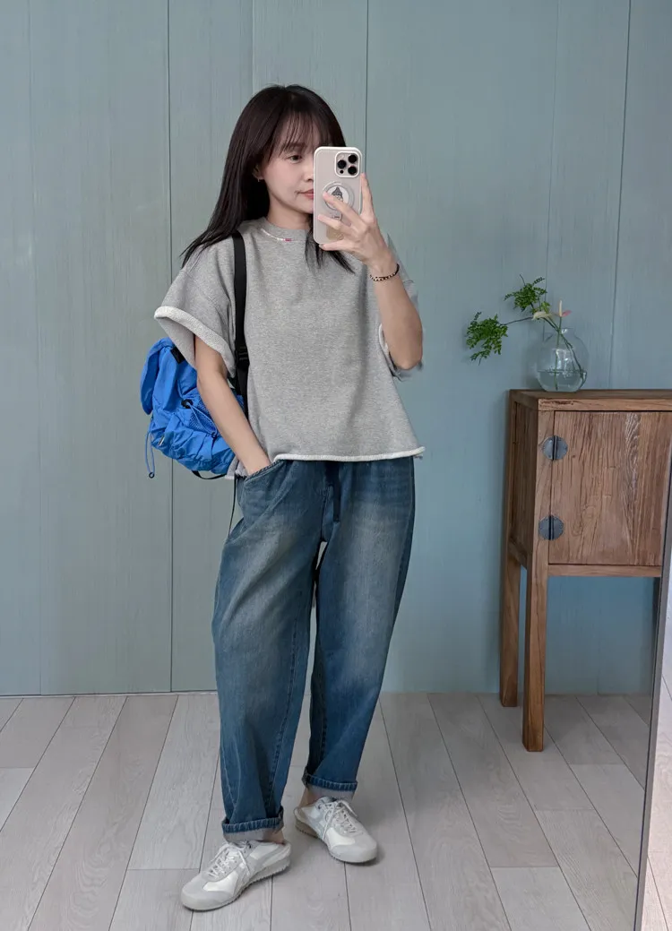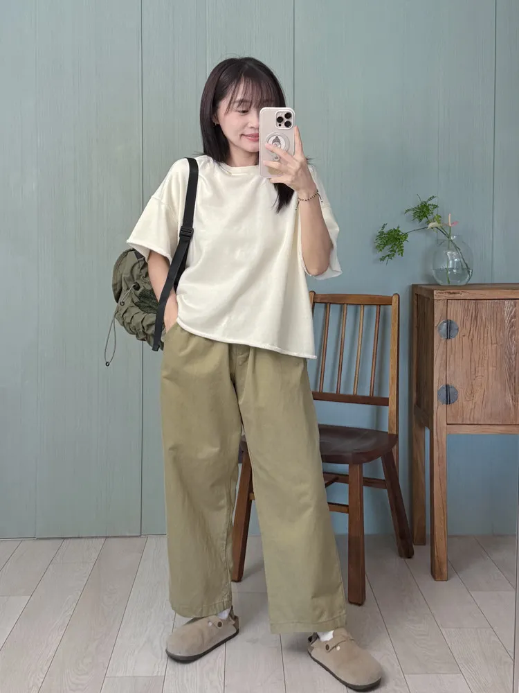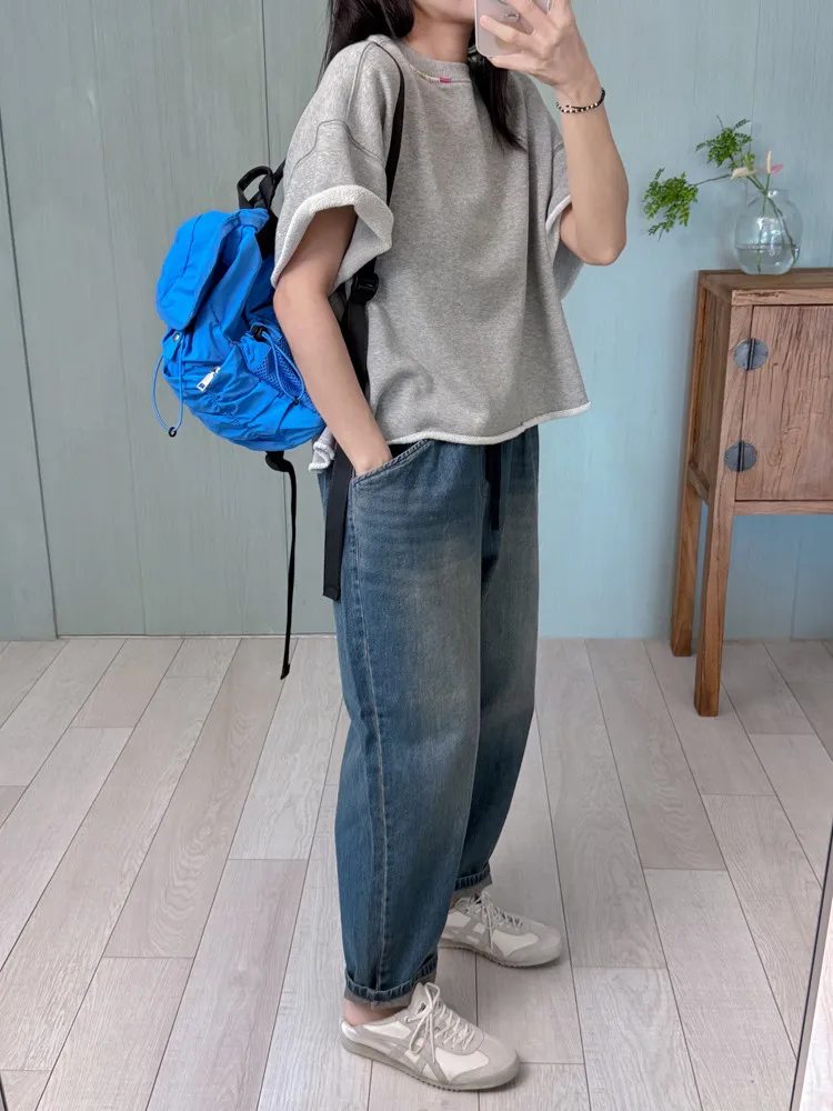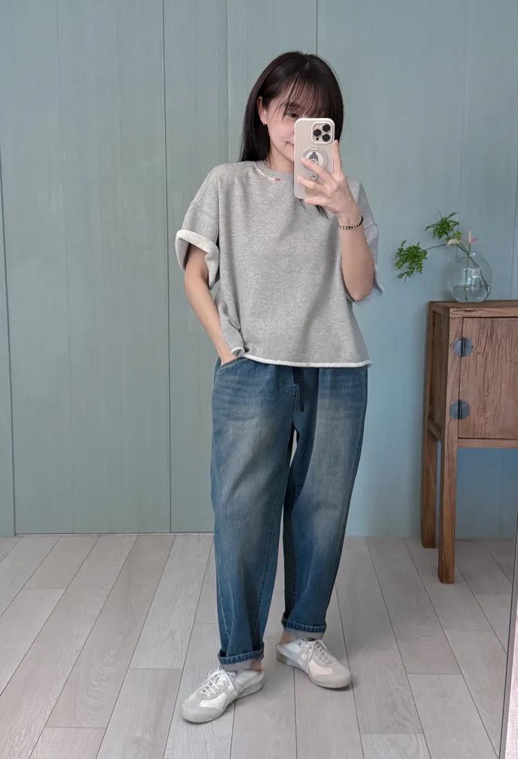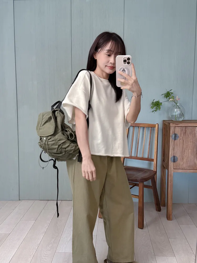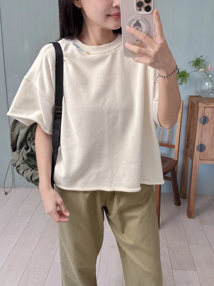 [特點] 舒適的棉料手感,捲邊設計,微落肩剪裁,領邊+側邊縫線造型。
