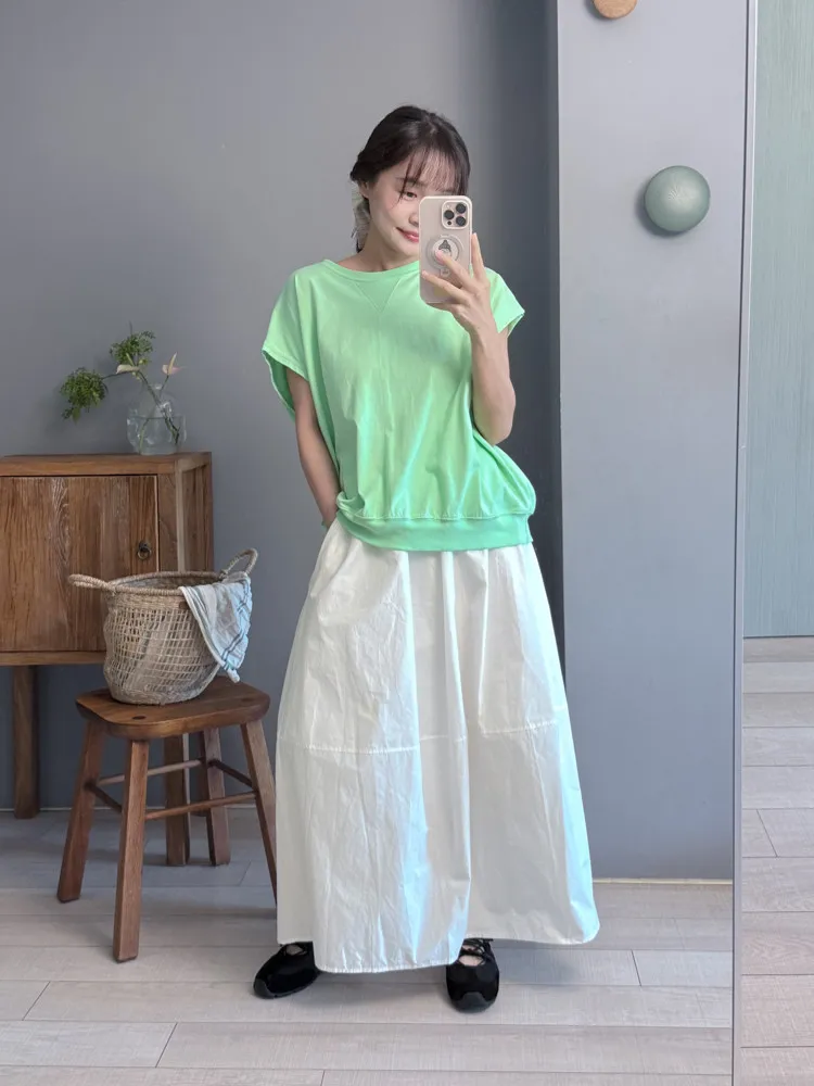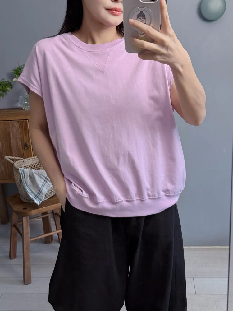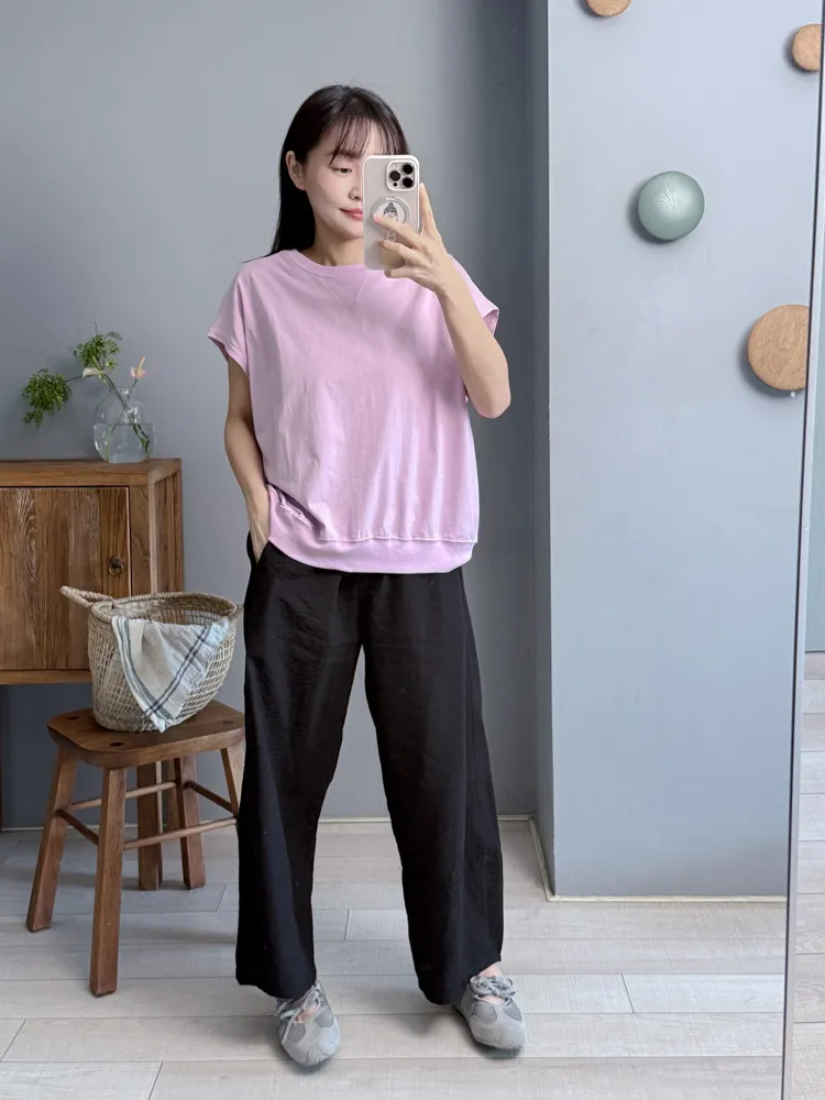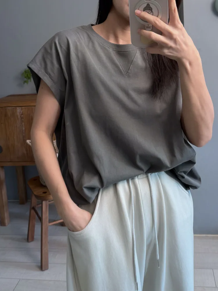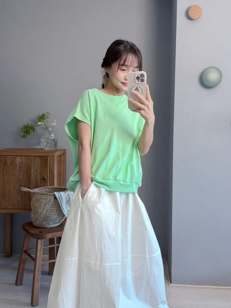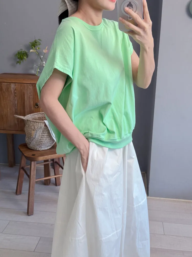 [特點] 偏薄棉手感,領口倒三角設計,落肩半袖剪裁。