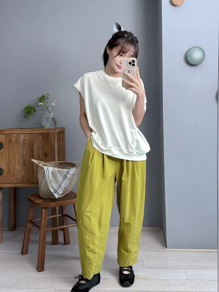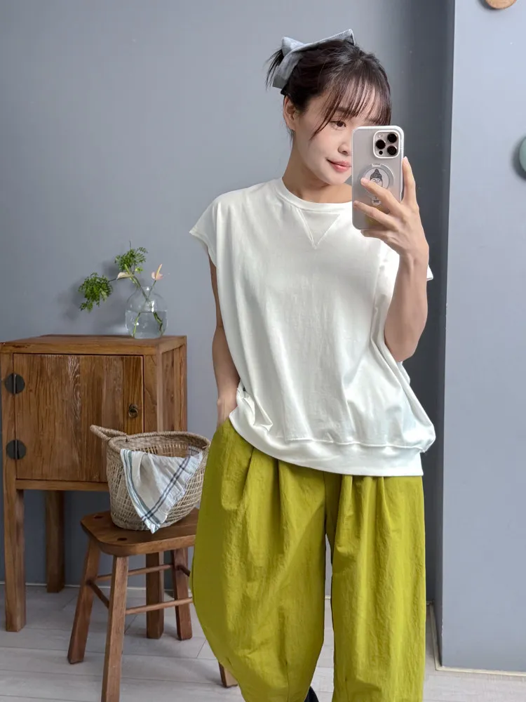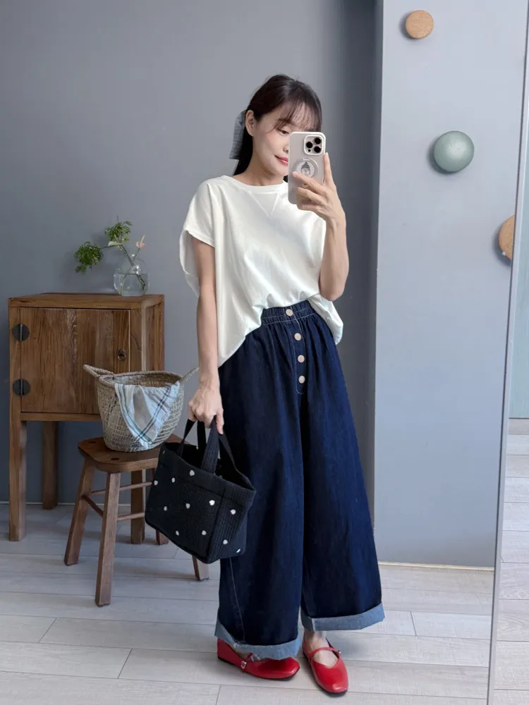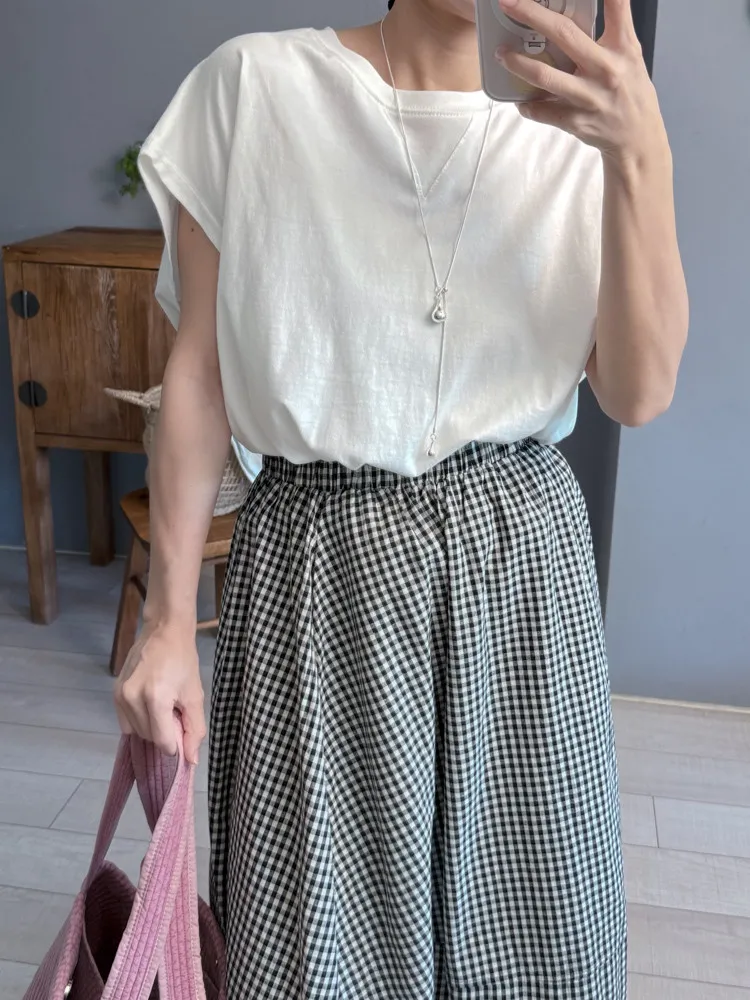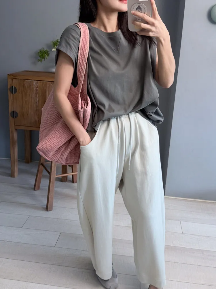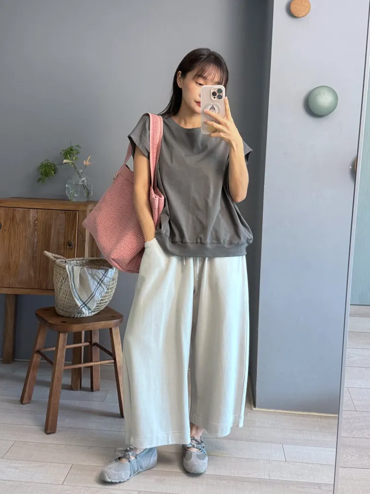 [特點] 偏薄棉手感,領口倒三角設計,落肩半袖剪裁。