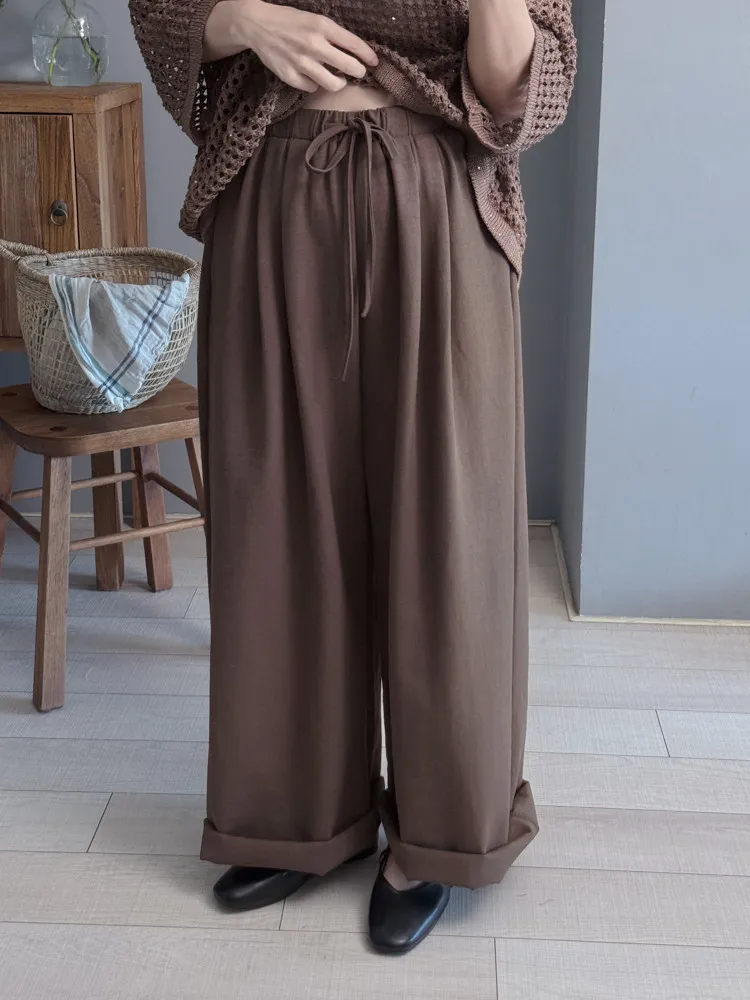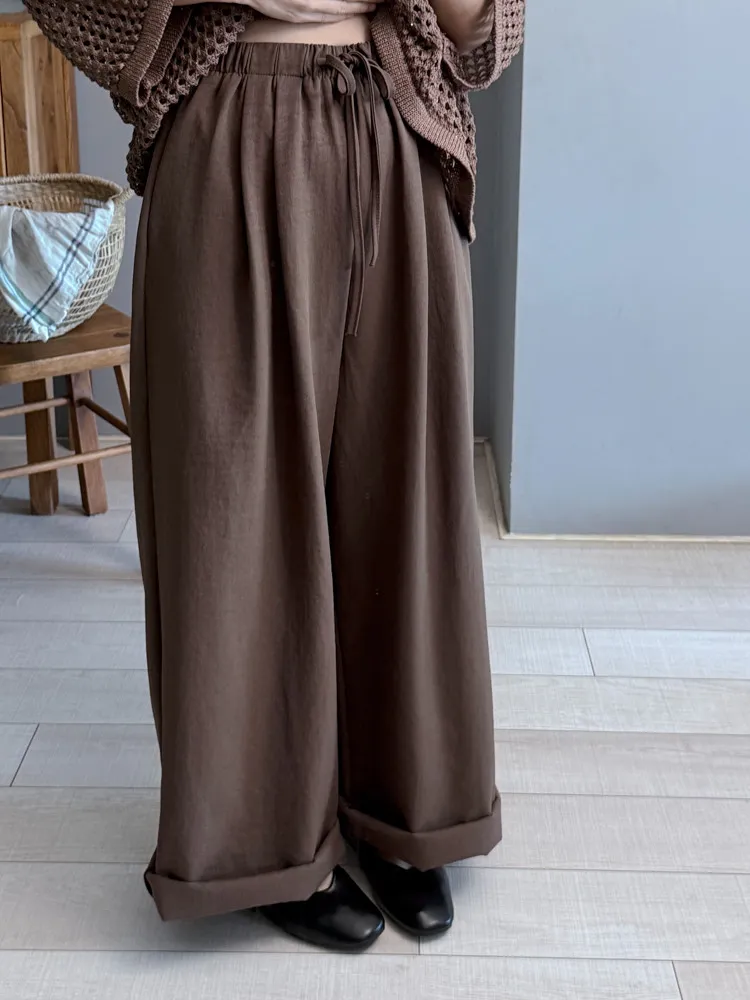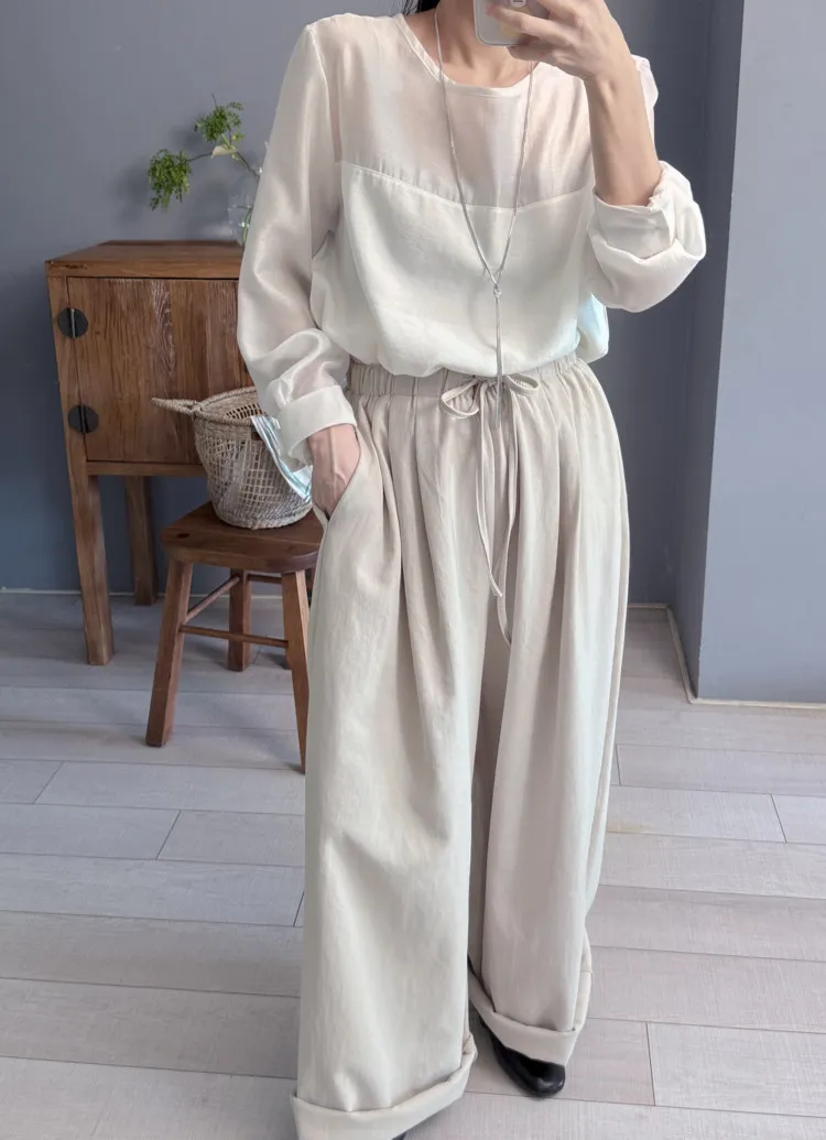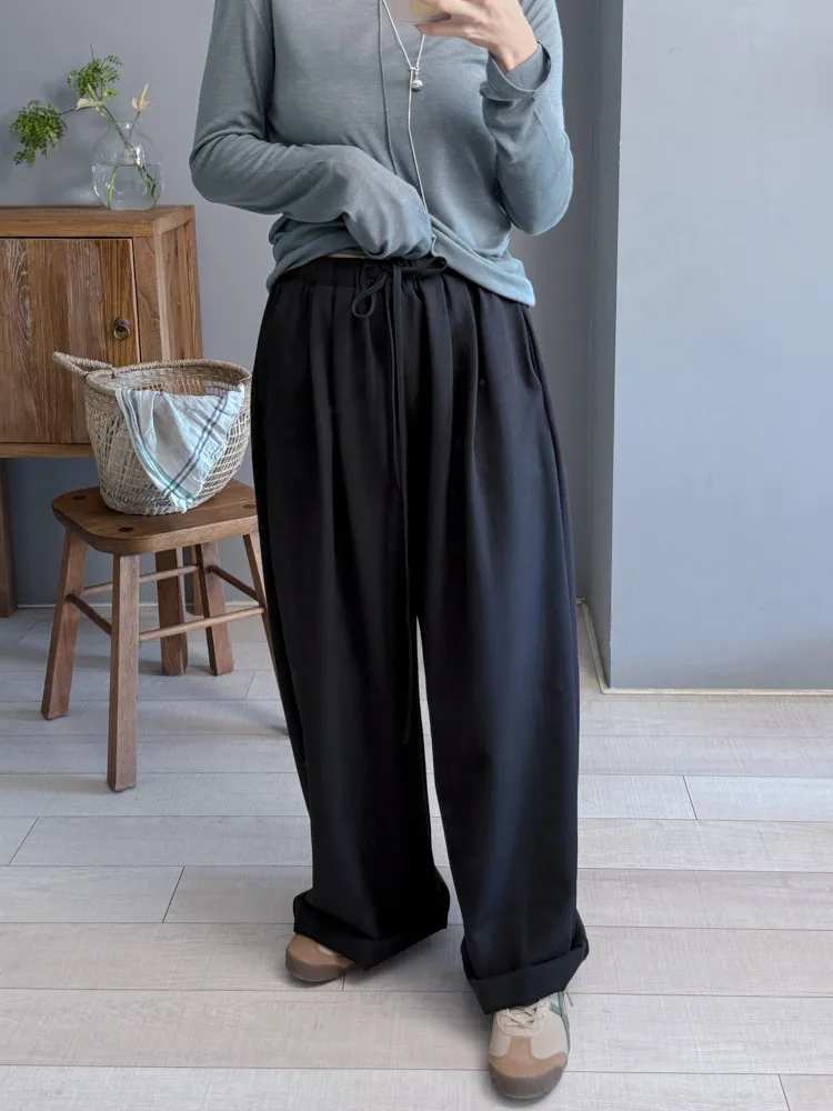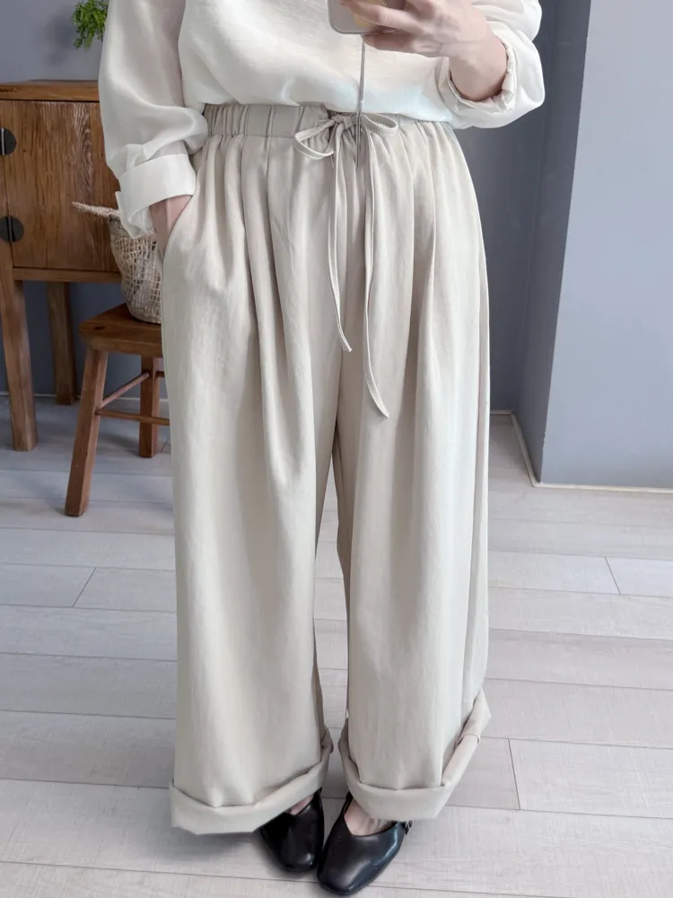 [特點] 抽繩鬆緊彈性腰圍,正面打摺自然垂墜感,滑滑舒適柔軟手感,寬褲版型。