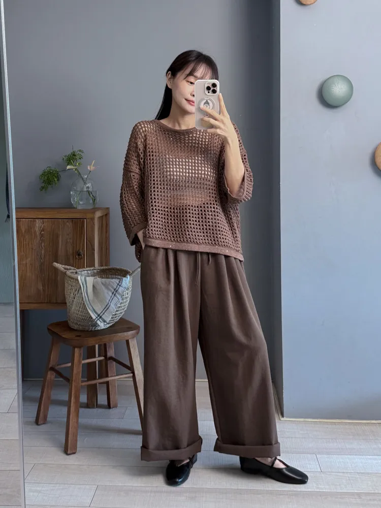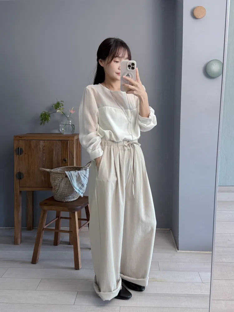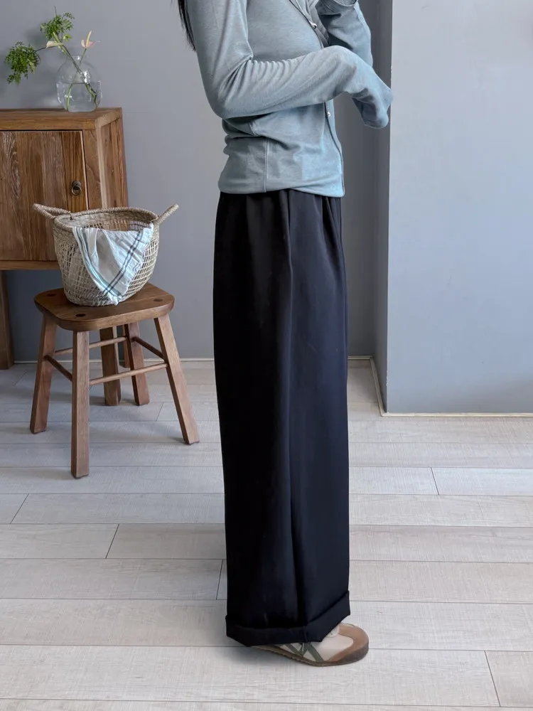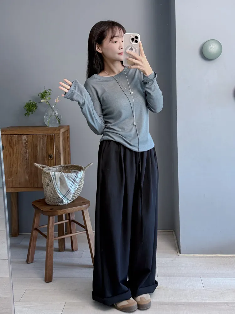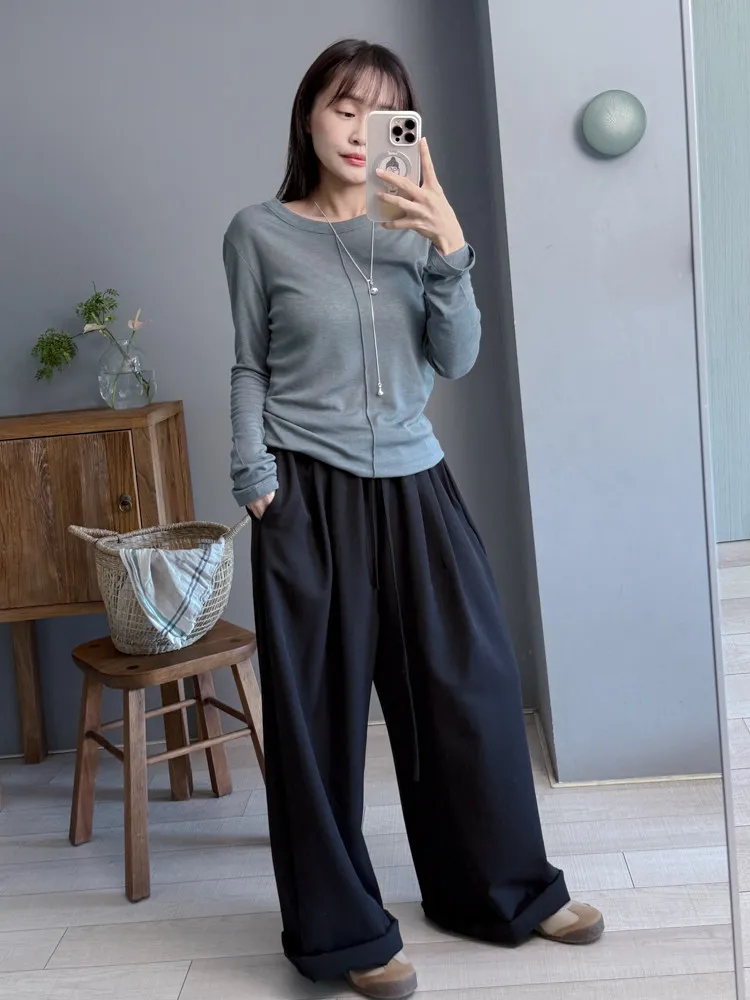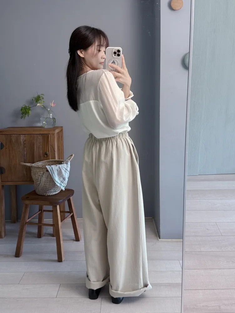 [特點] 抽繩鬆緊彈性腰圍,正面打摺自然垂墜感,滑滑舒適柔軟手感,寬褲版型。