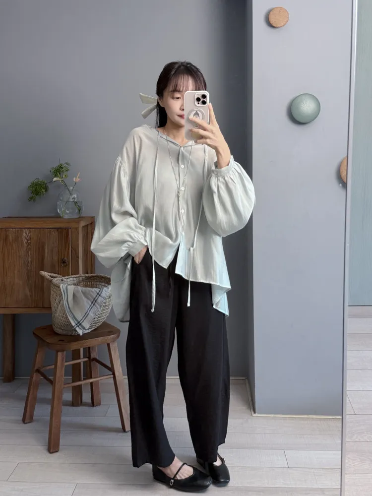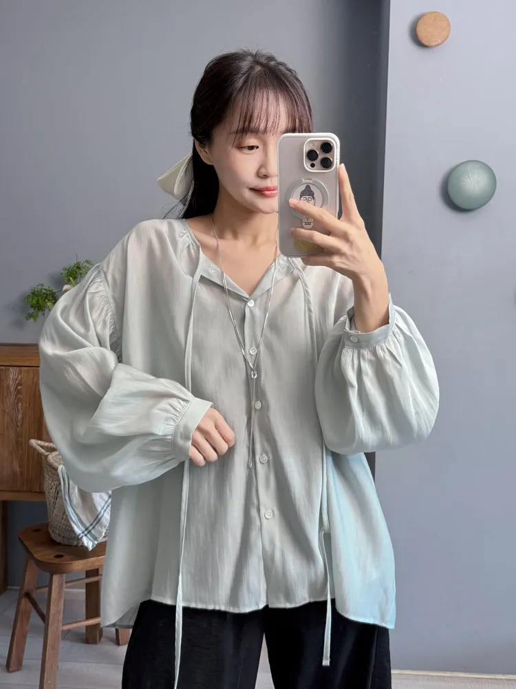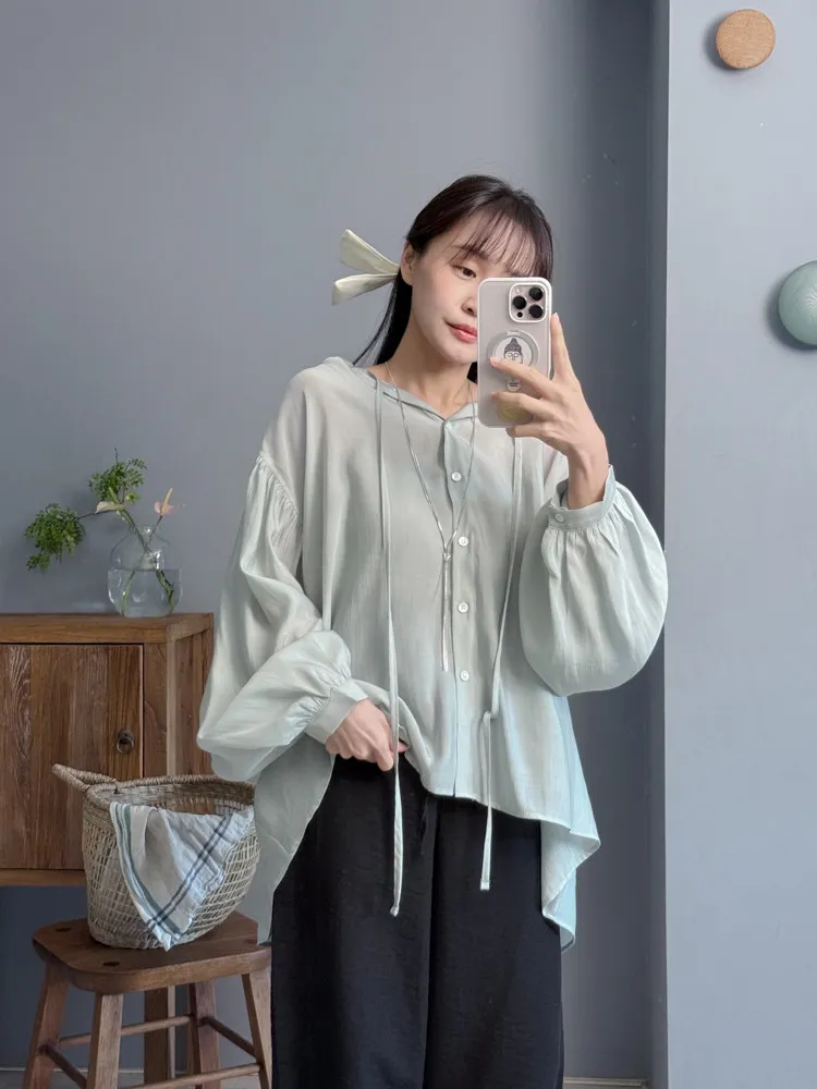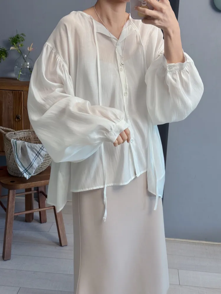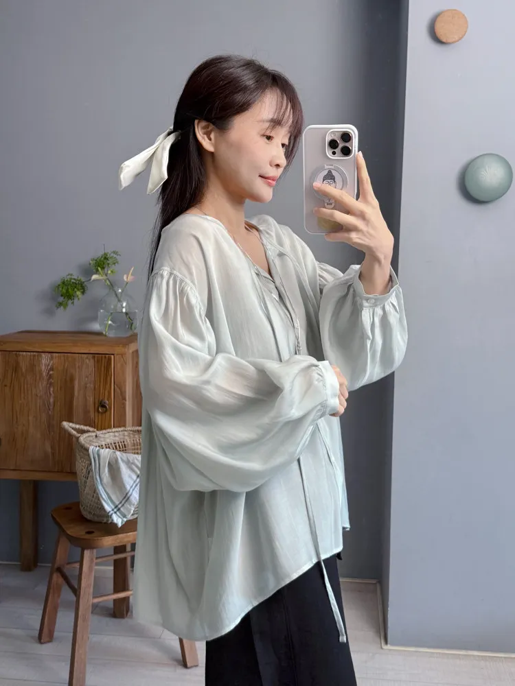 [特點] 天絲特有的絲滑觸感與自然垂墜,澎袖剪裁,排扣+綁繩設計。