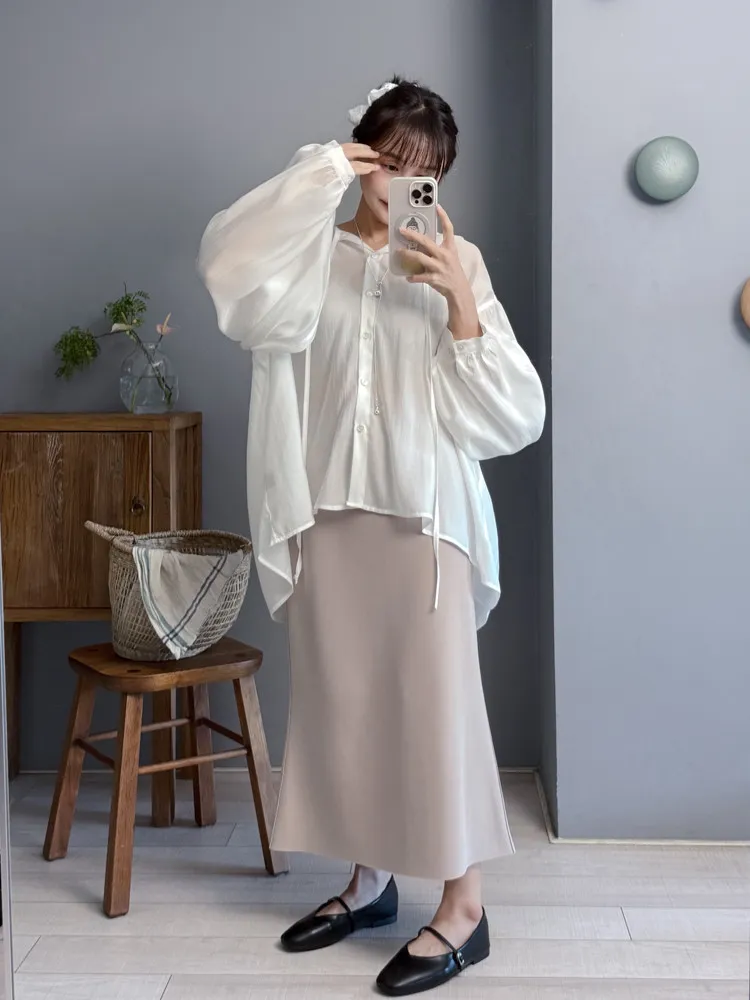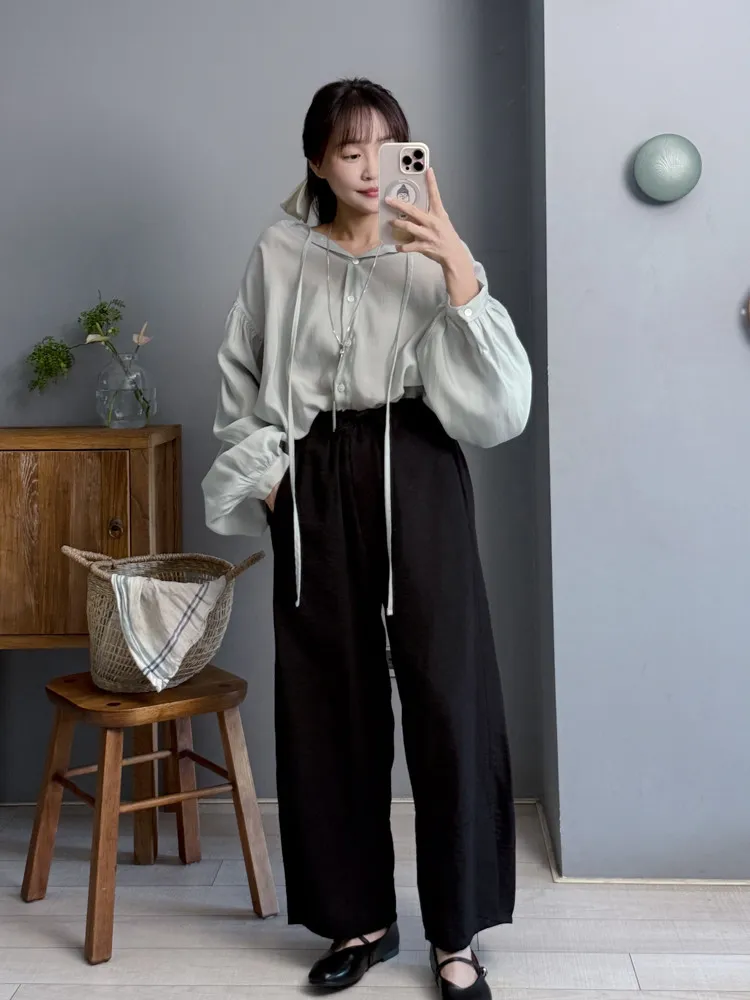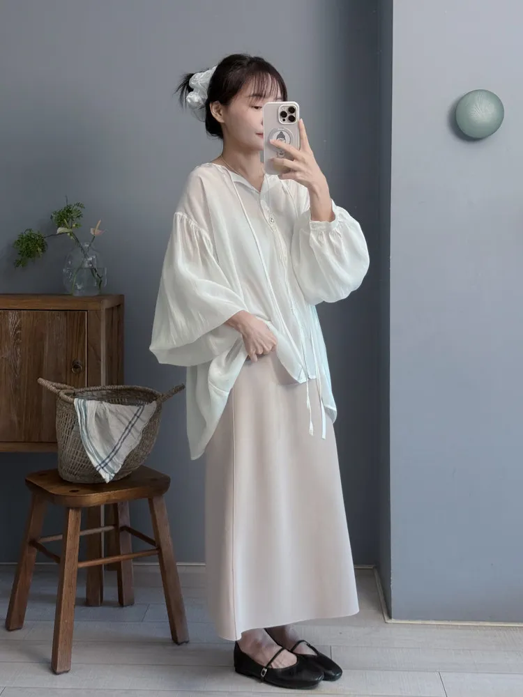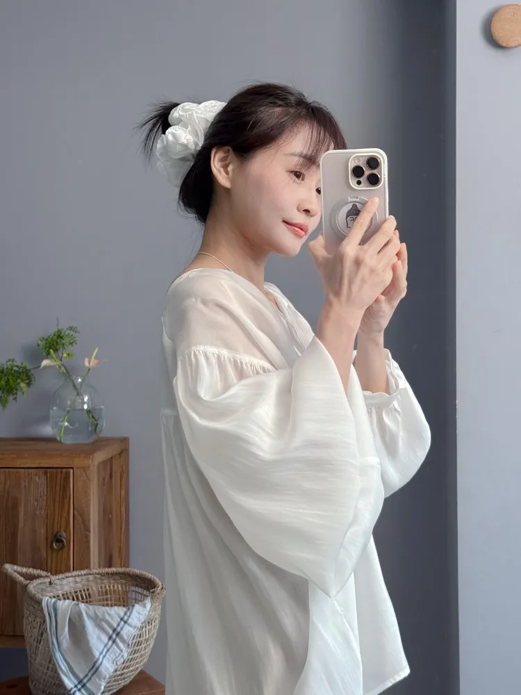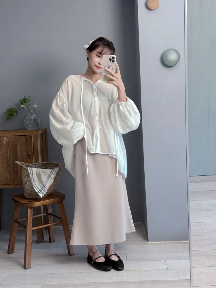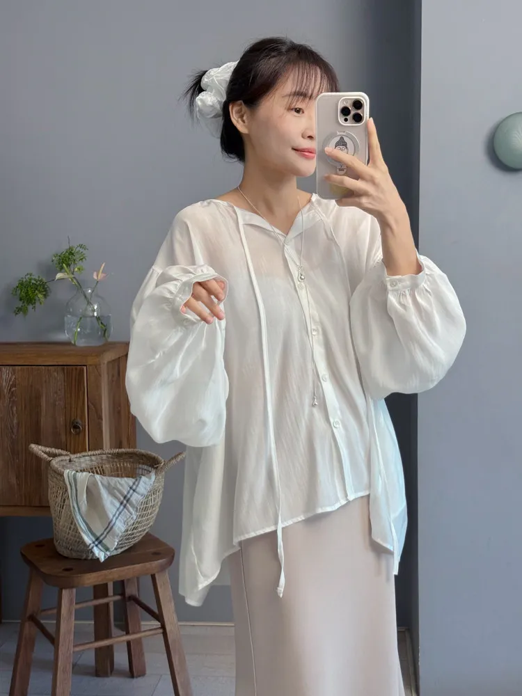 [特點] 天絲特有的絲滑觸感與自然垂墜,澎袖剪裁,排扣+綁繩設計。