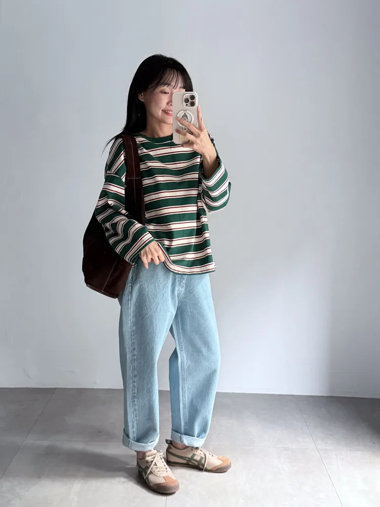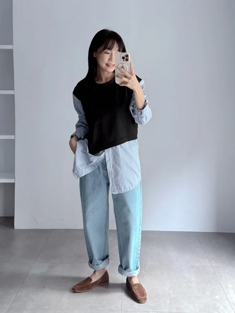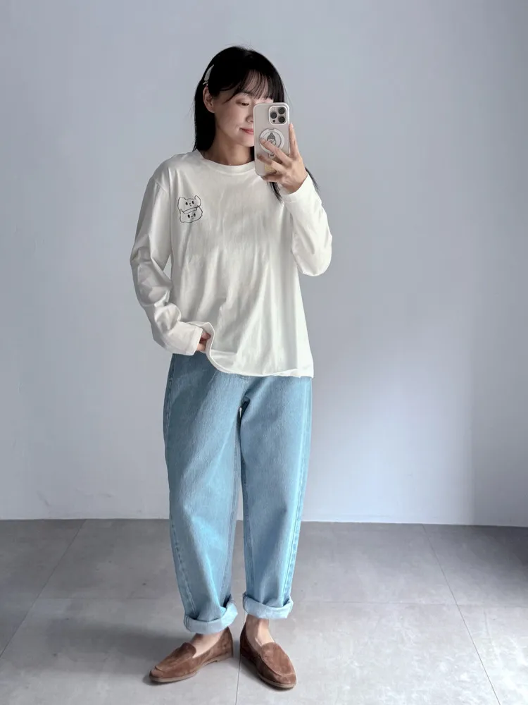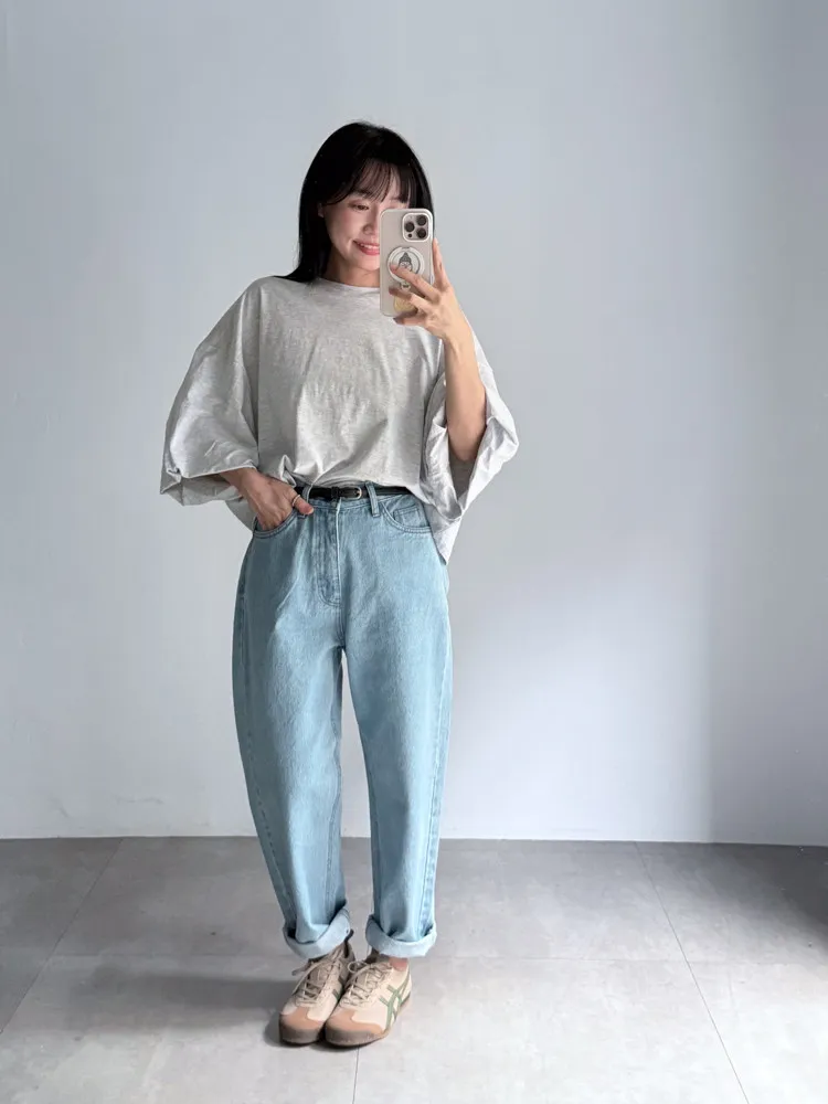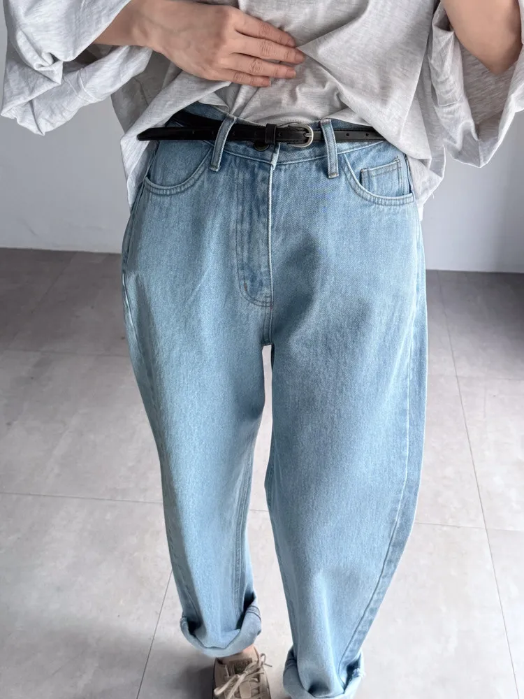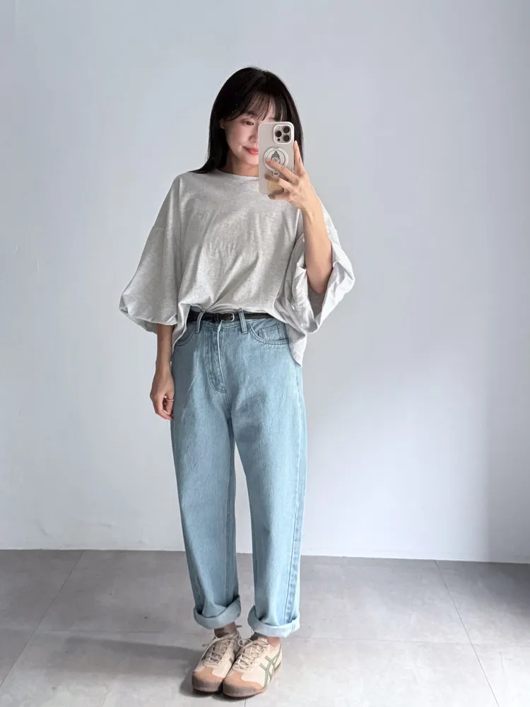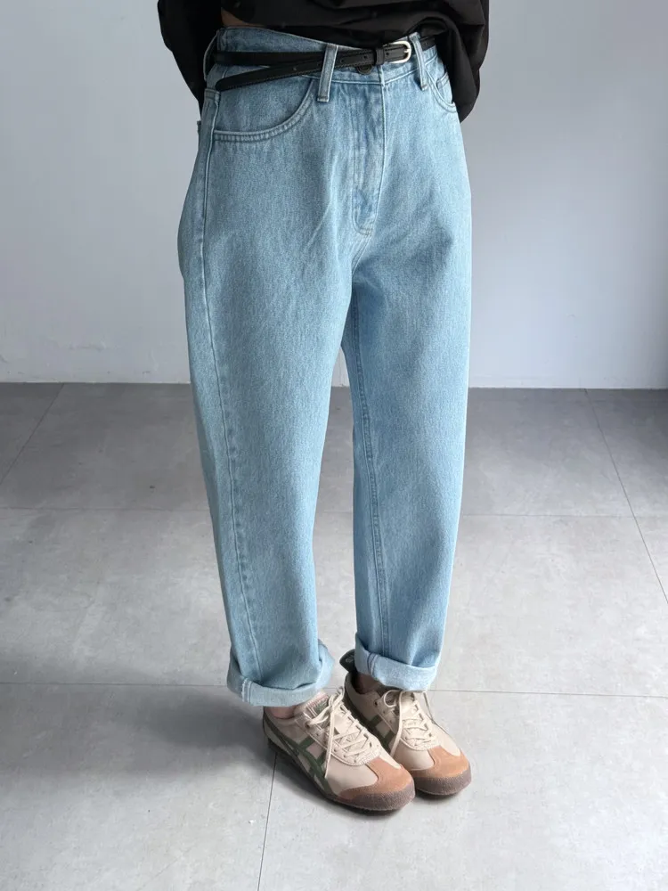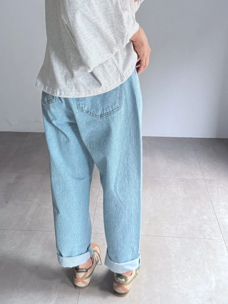[特點] 後鬆緊彈性腰圍,淺藍刷白設計,上寬下窄男友褲版型,面料無彈性。