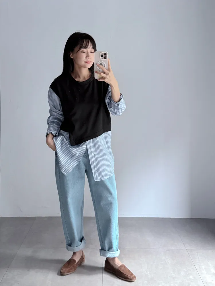 [特點] 異材質拼接假兩件式,層次感的視覺效果,整體剪裁自然修身。