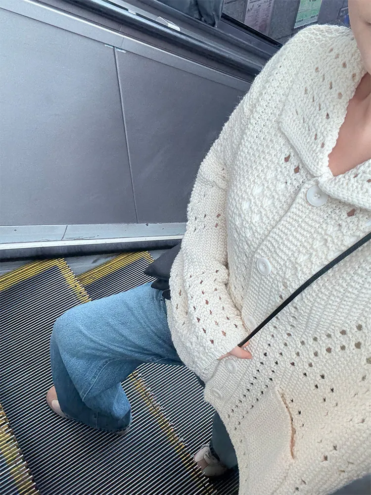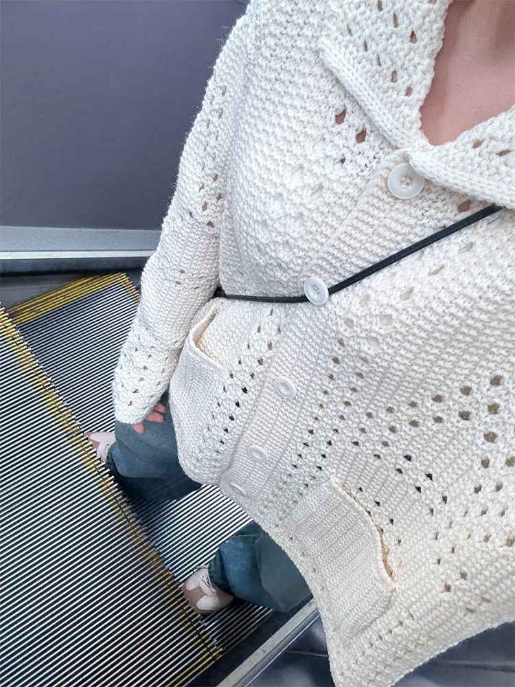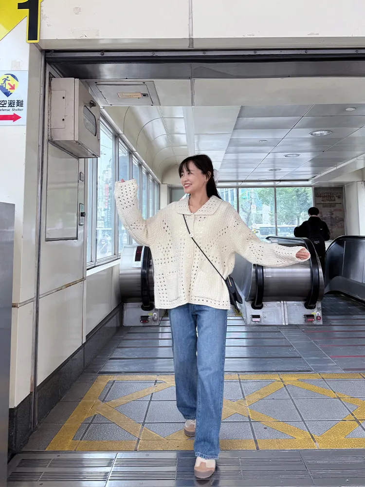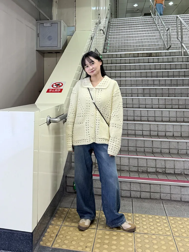 [特點] 溫柔奶油色調,帶有手工感的鉤針織紋理,寬領+大釦設計,厚度扎實卻不沉重。