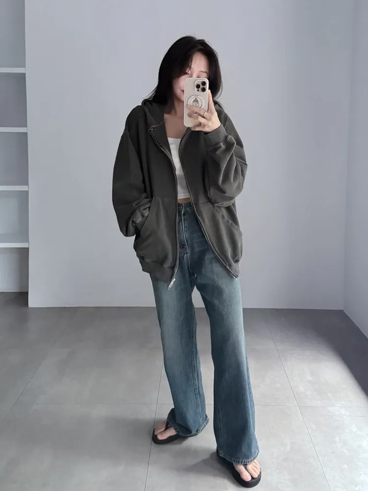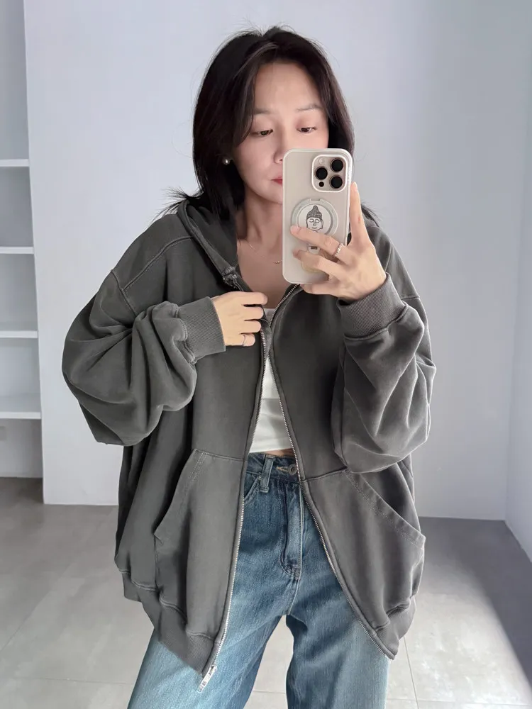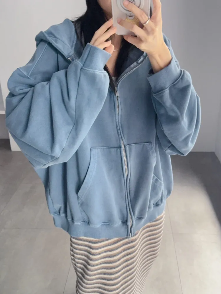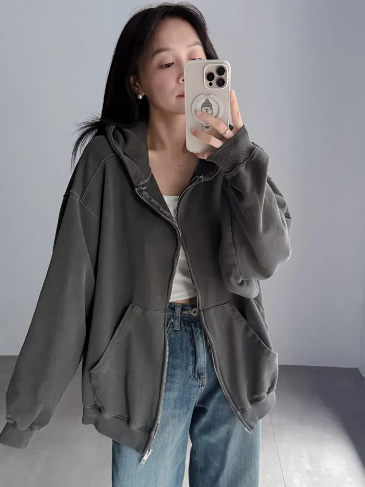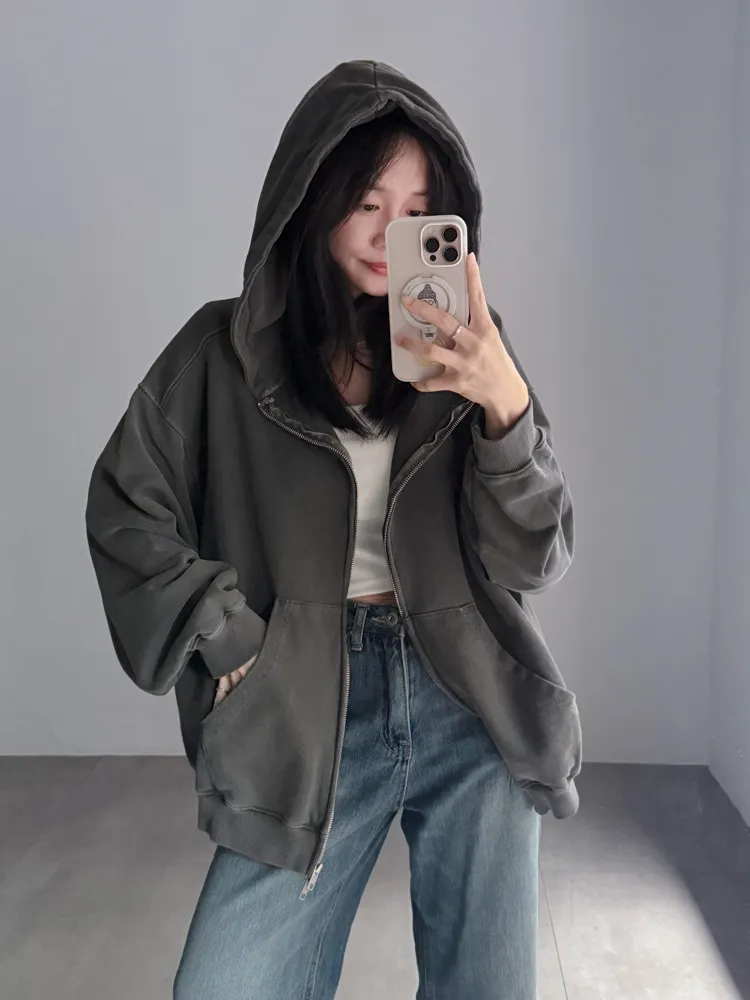 [特點] 水洗洗舊面料,內裡毛圈+連帽設計剪裁,寬鬆版型剪裁。