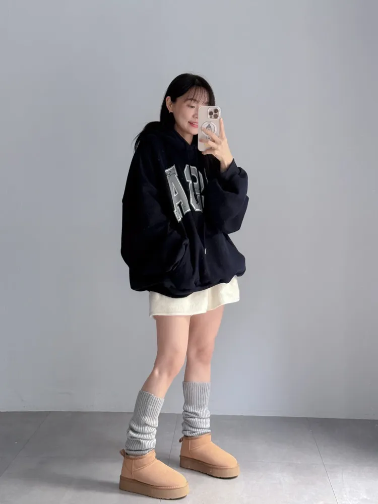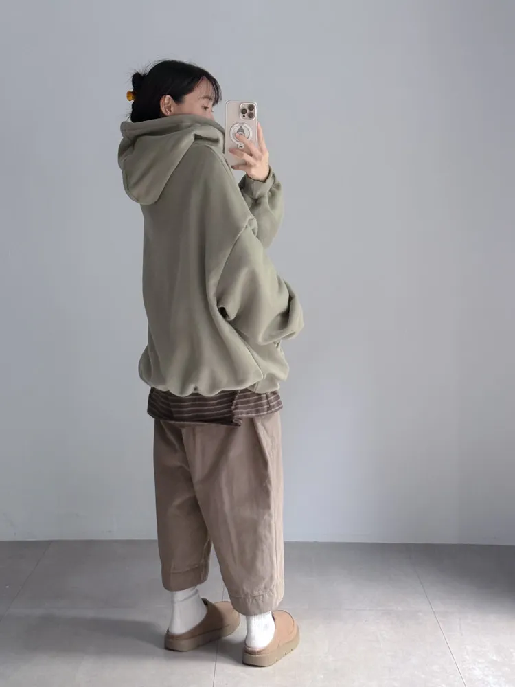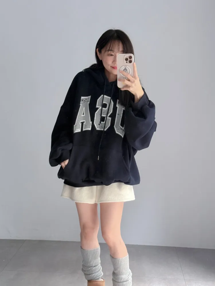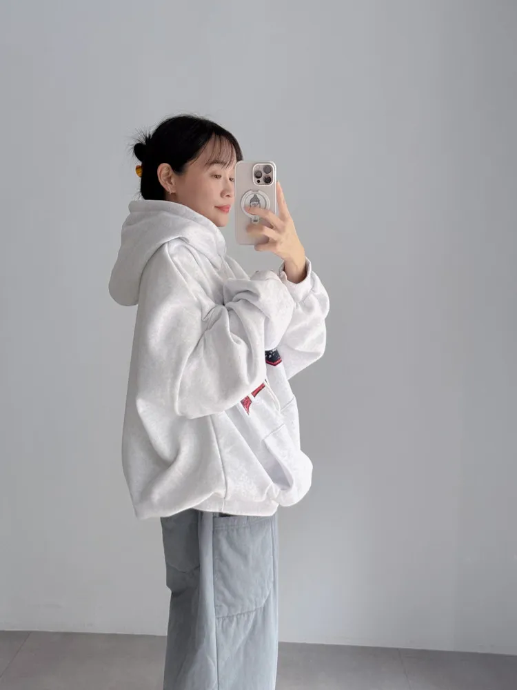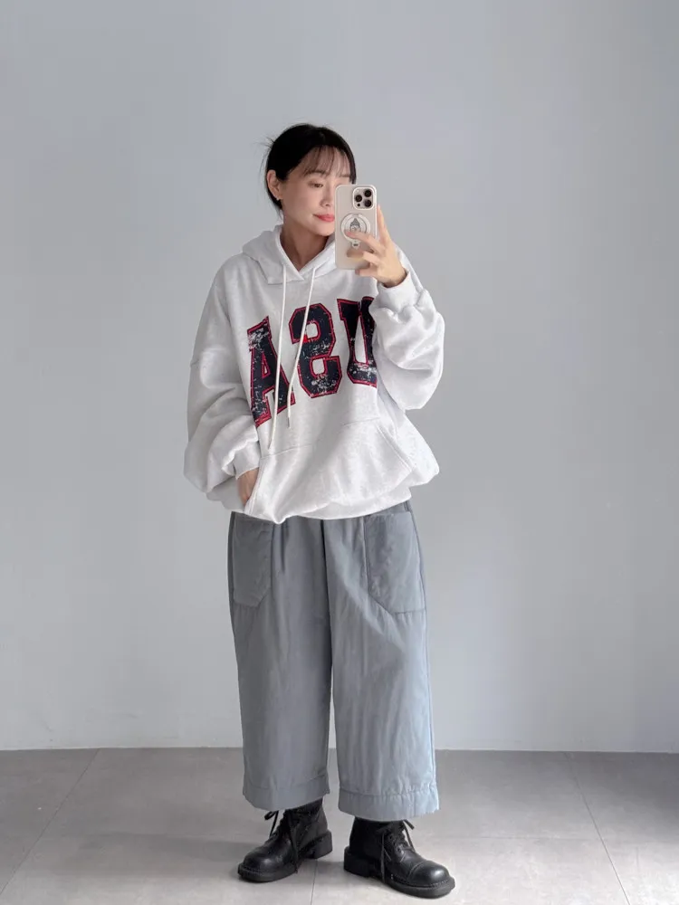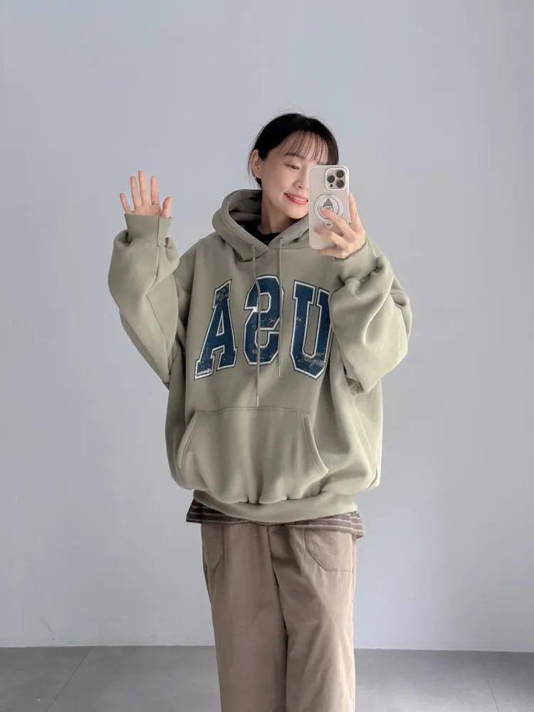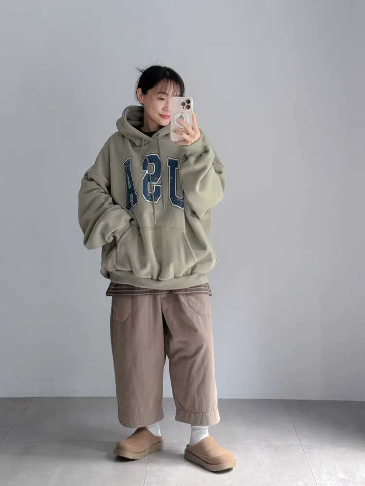 [特點] 落肩寬鬆剪裁,軟料棉質,柔軟舒適的內刷毛,大口袋造型,斑駁英文字壓印。