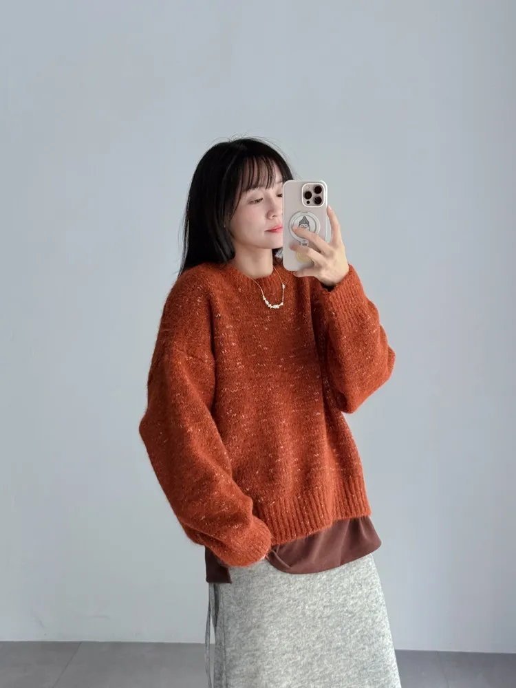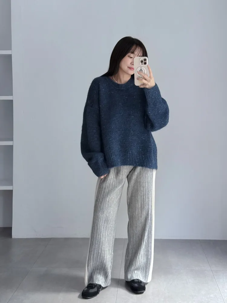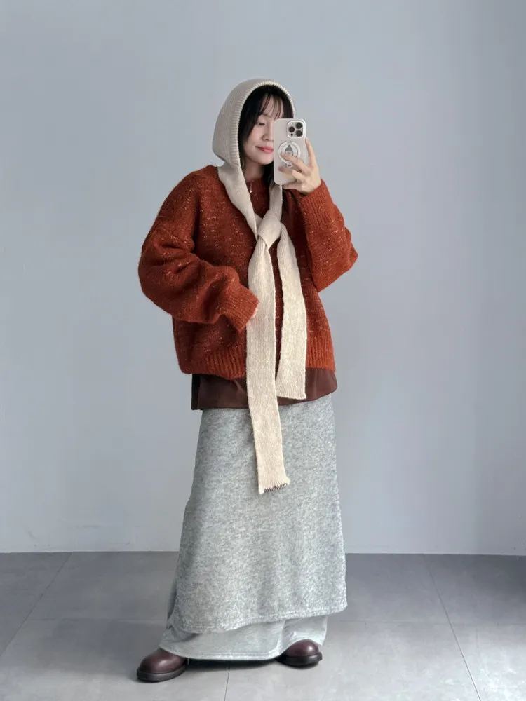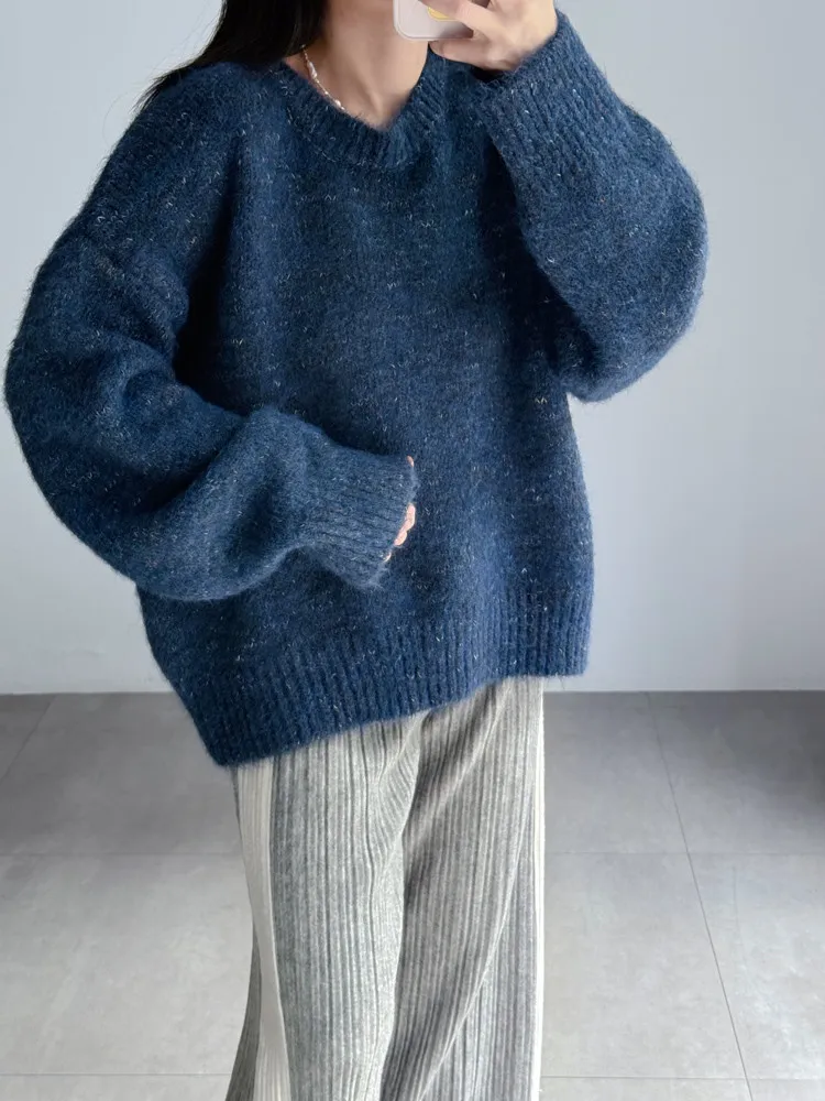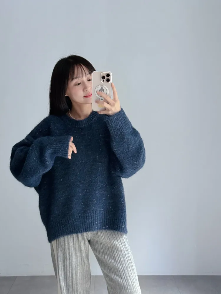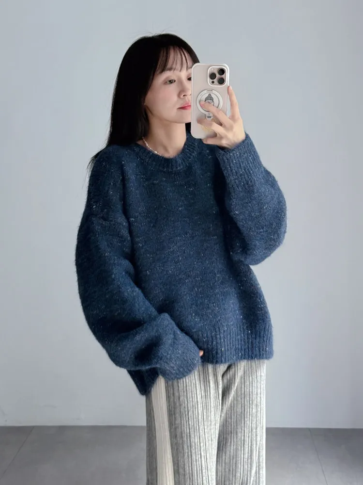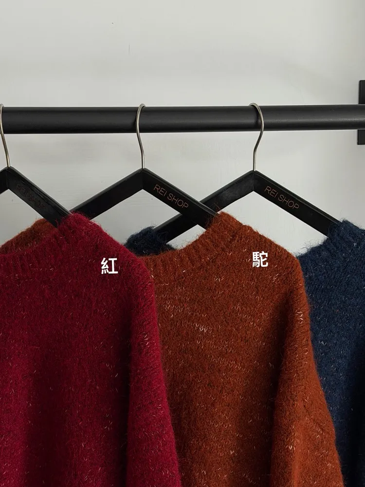 [特點] 落肩+自然蓬鬆袖型,面料觸感不刺膚,混色針織設計。