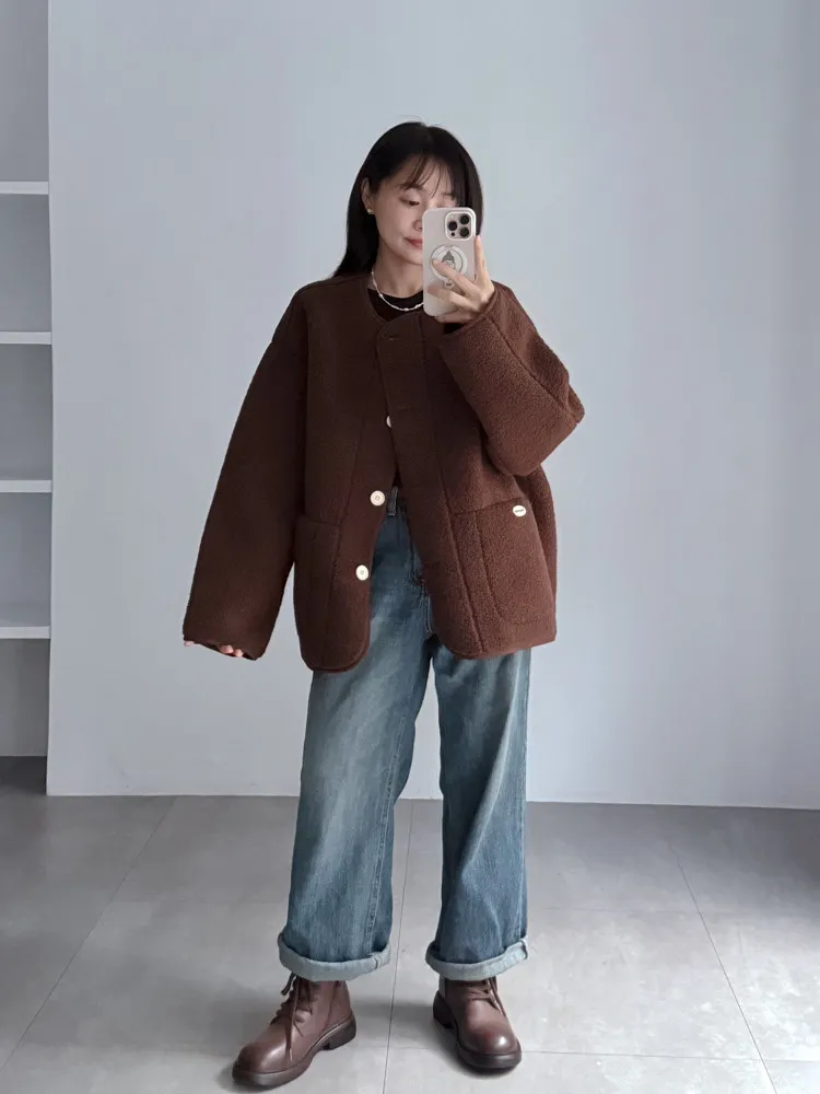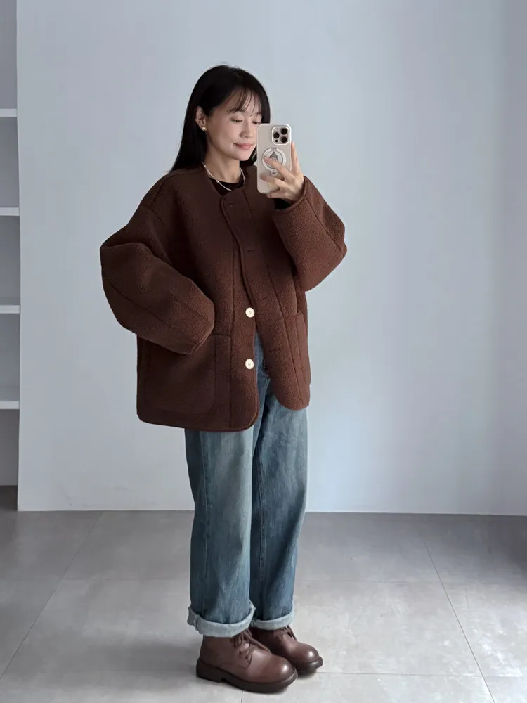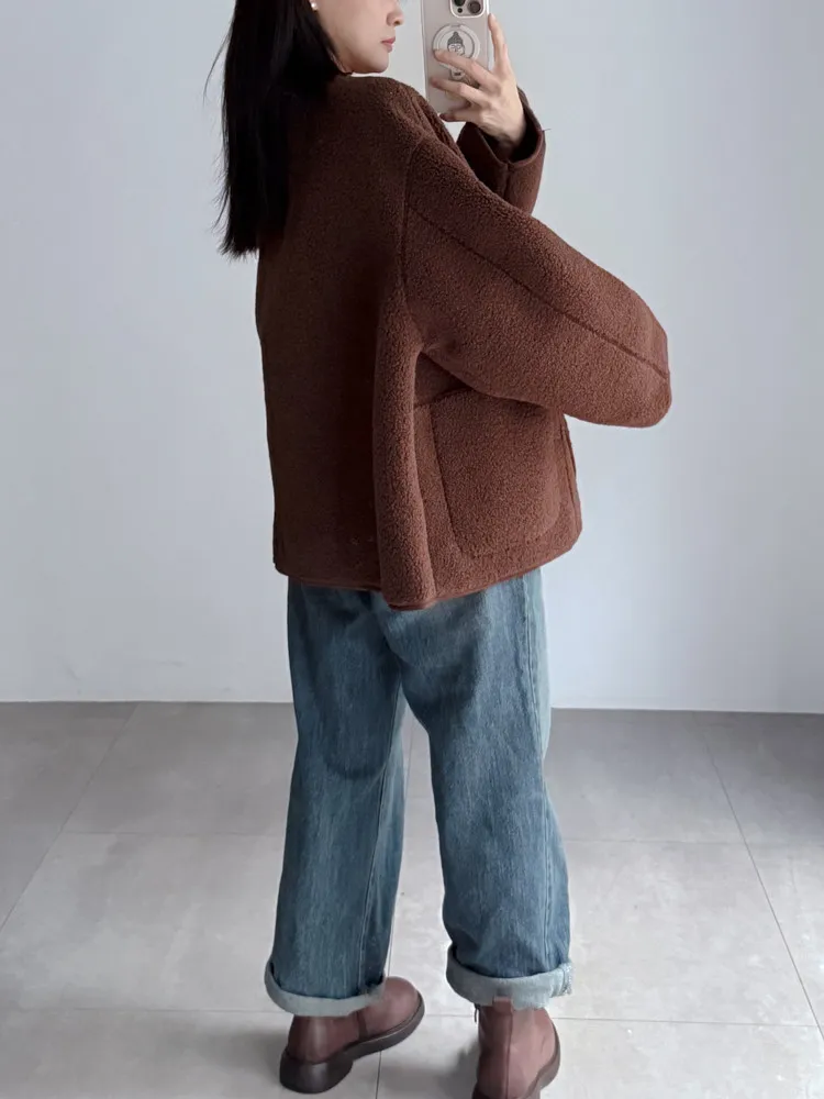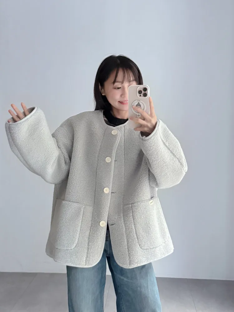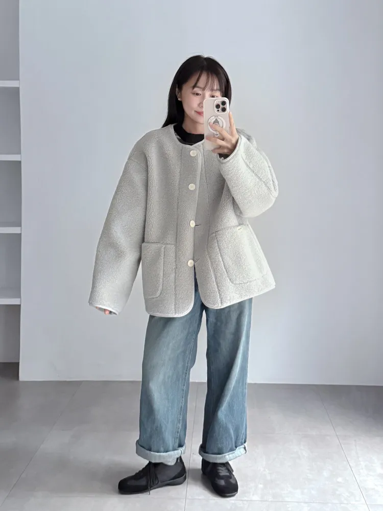 [特點] 外層柔軟毛絨手感,內裡是滑順的麂皮面料,無領剪裁很適合搭配帽T穿著,
