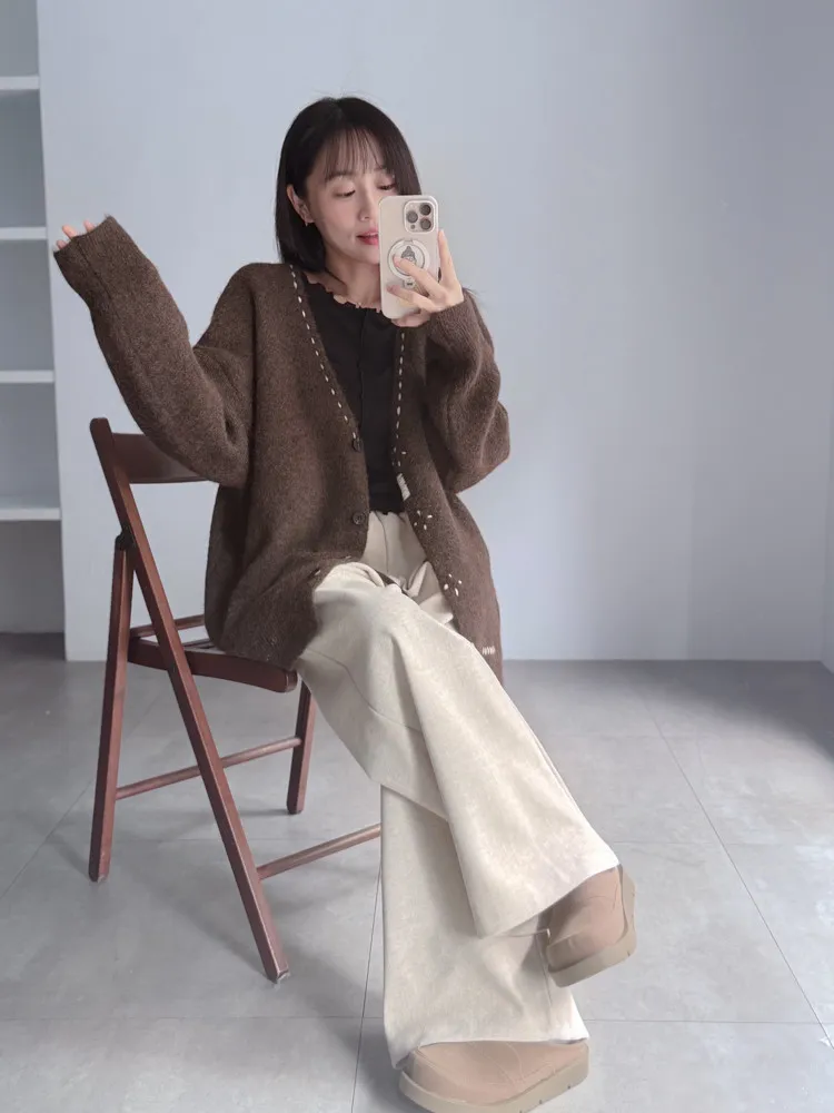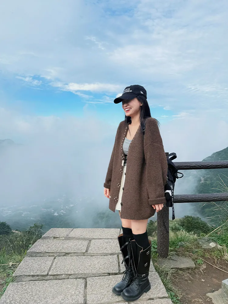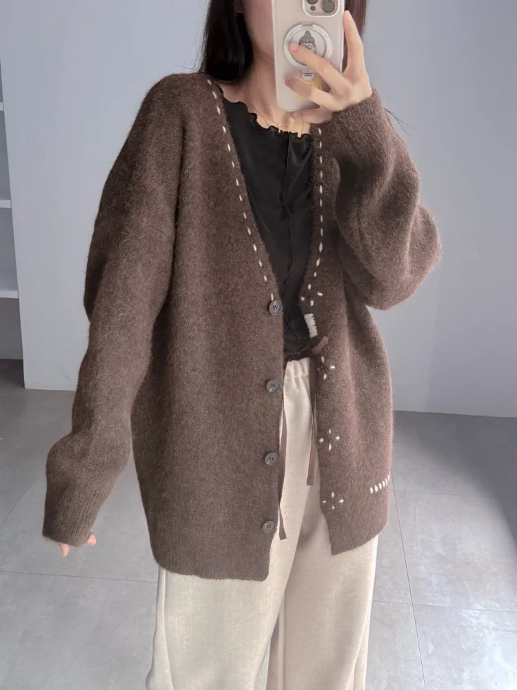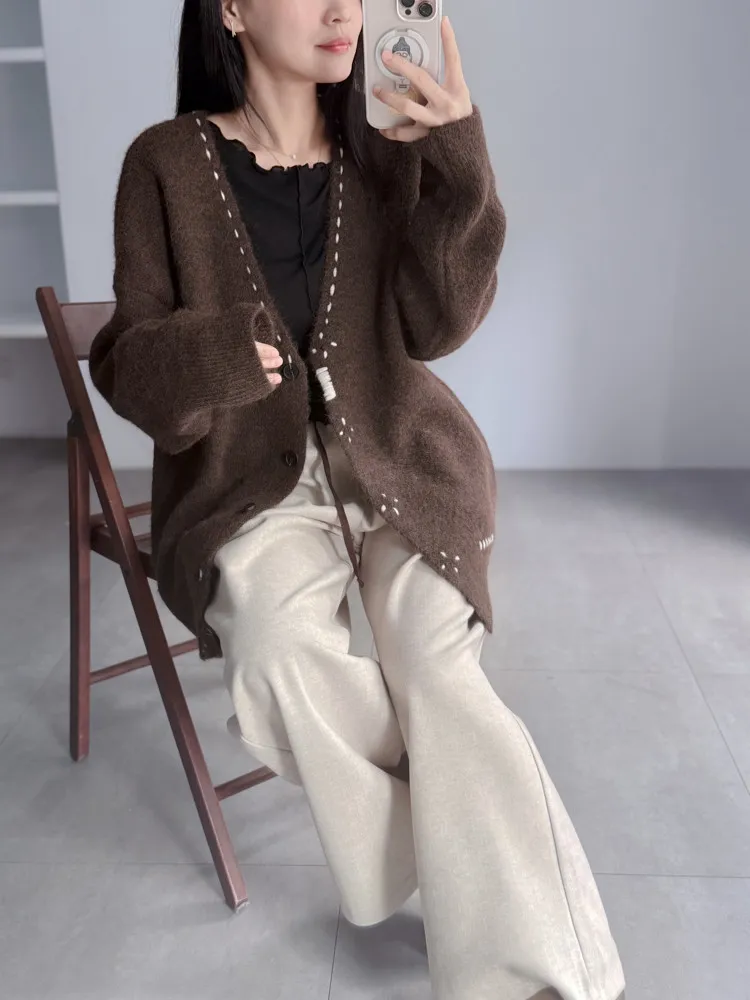 [特點] 表面帶有微毛感的針織,面料親膚不扎,V領+排釦設計,車線感造型。
