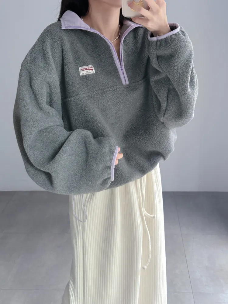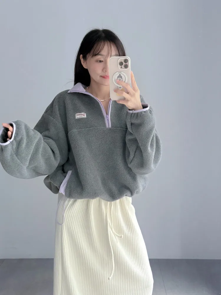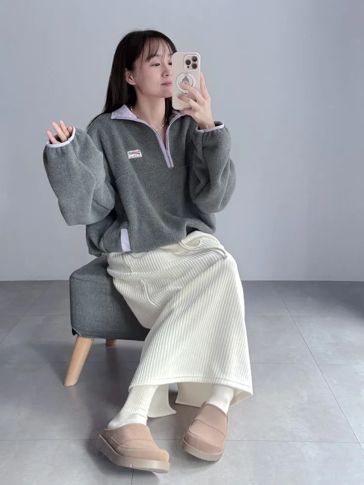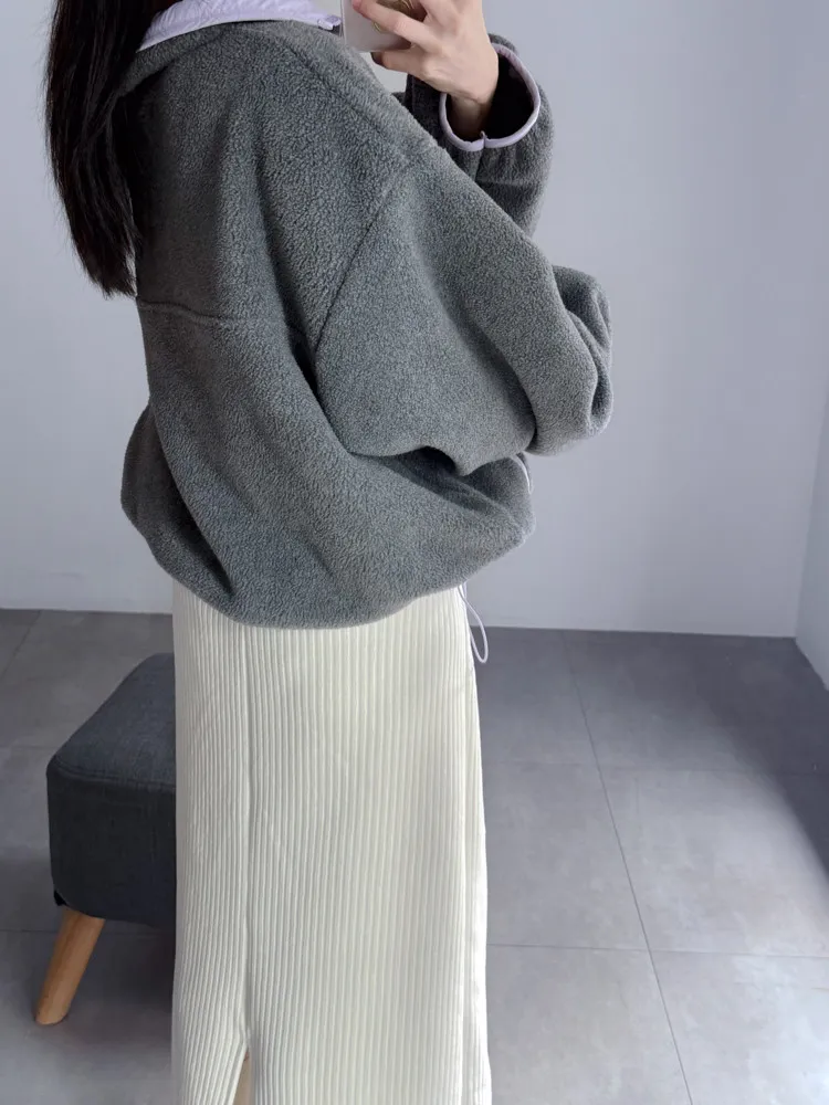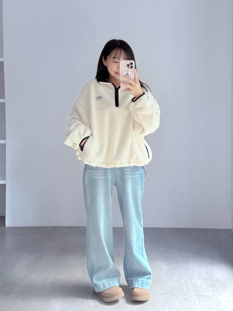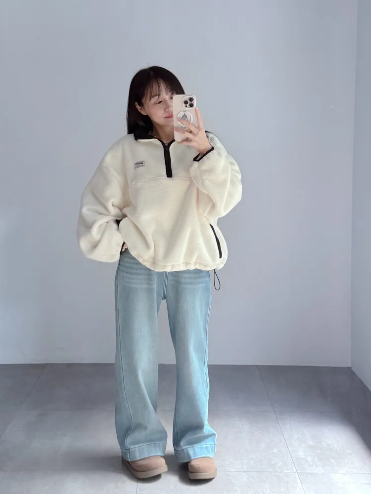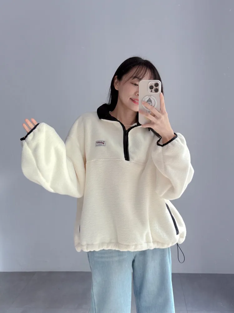 [特點] 微落肩+半拉鍊高領設計,下擺束口可自行調整,手感舒適的毛面料。