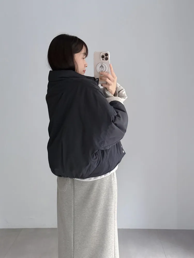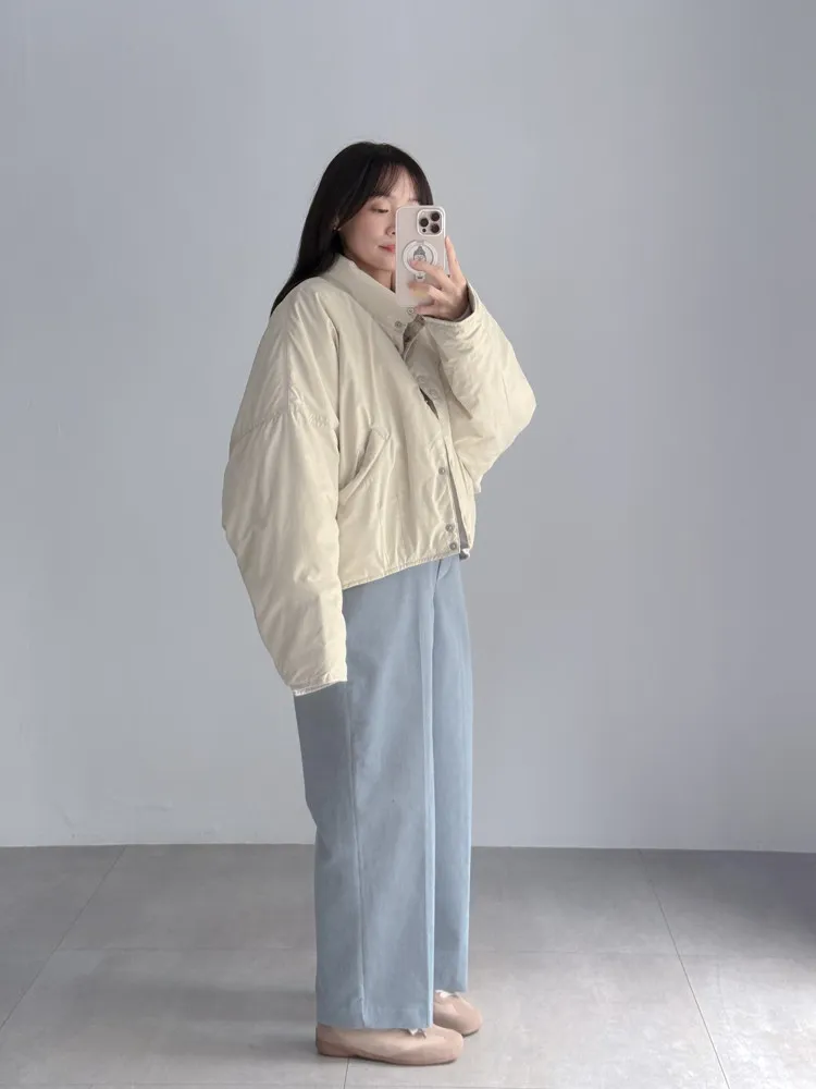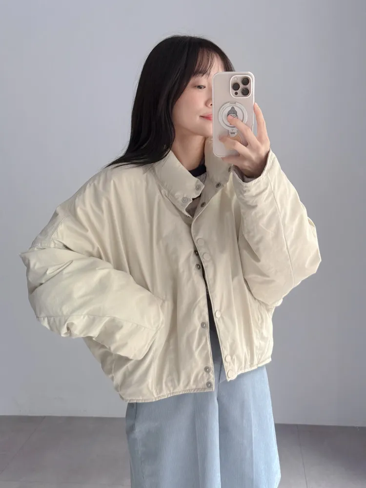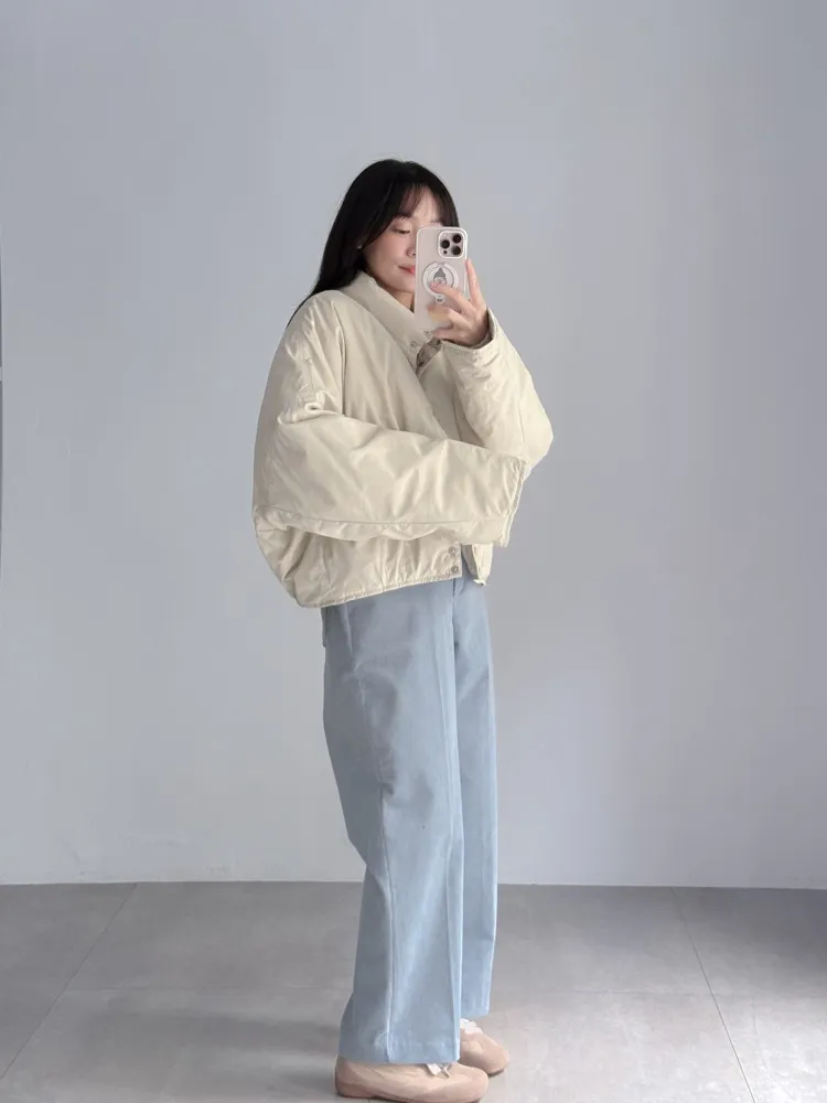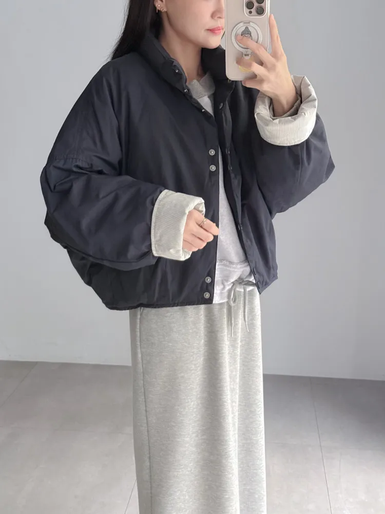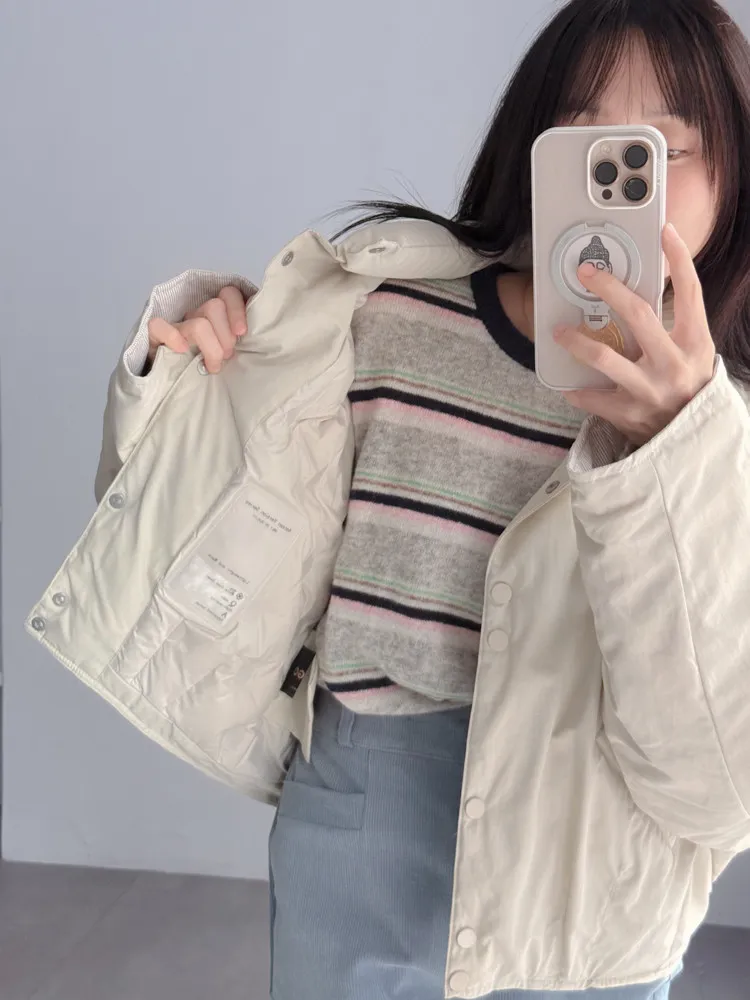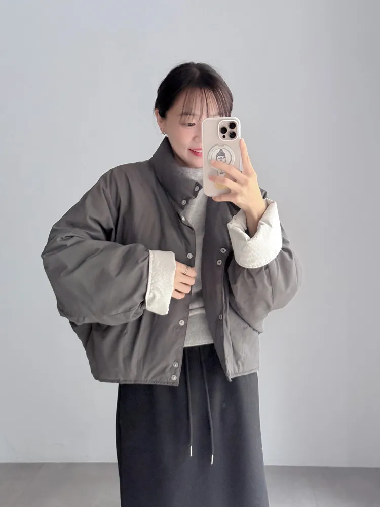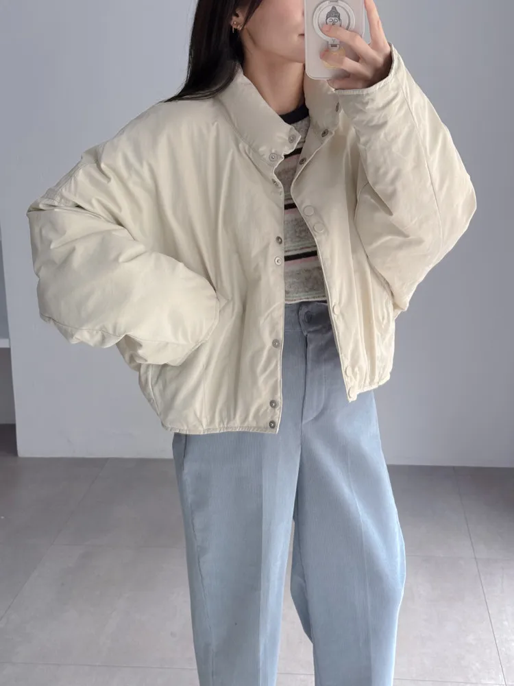 [特點] 立領+防風扣設計,短版剪裁,蓬鬆輕盈,下擺鬆緊設計,反摺袖口條紋布造型。