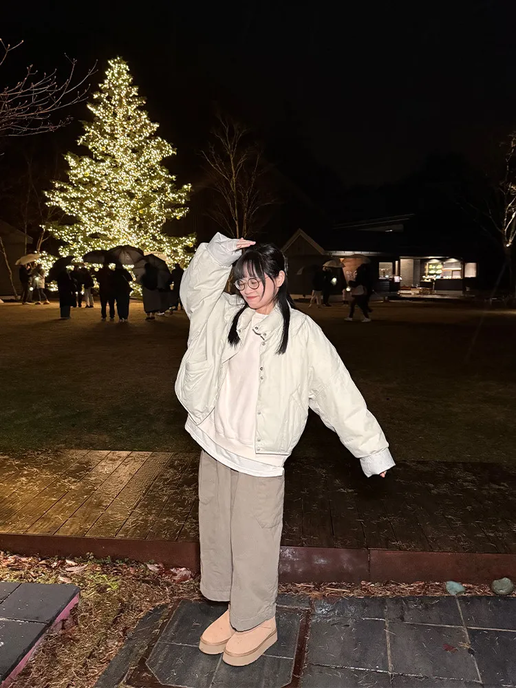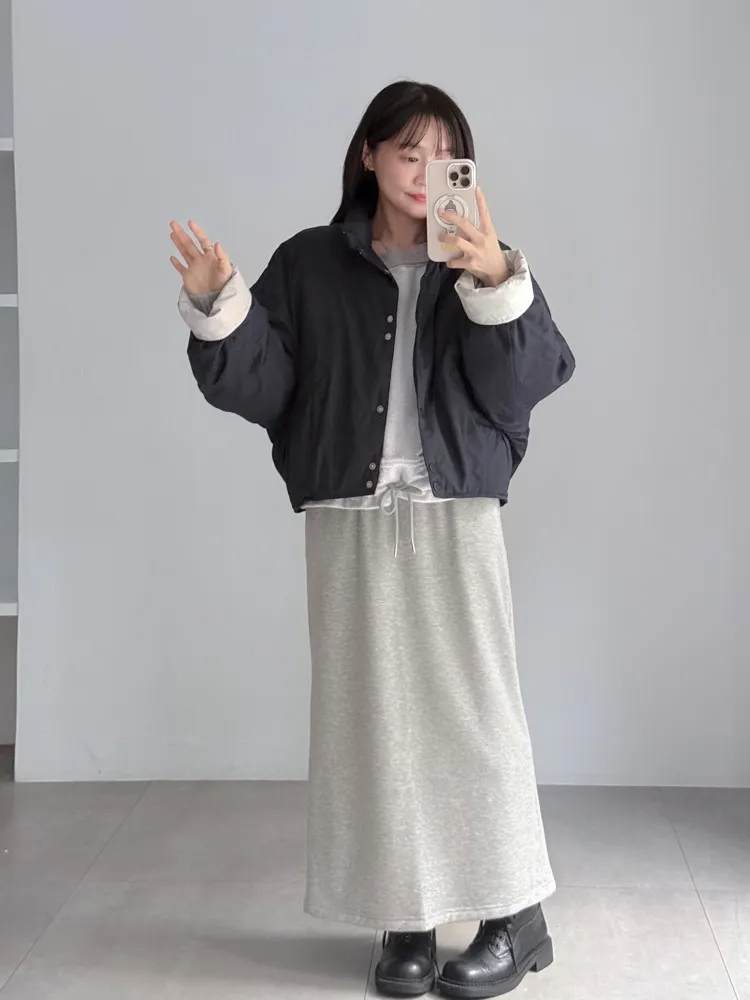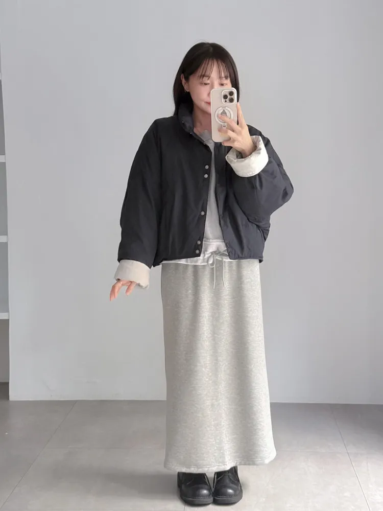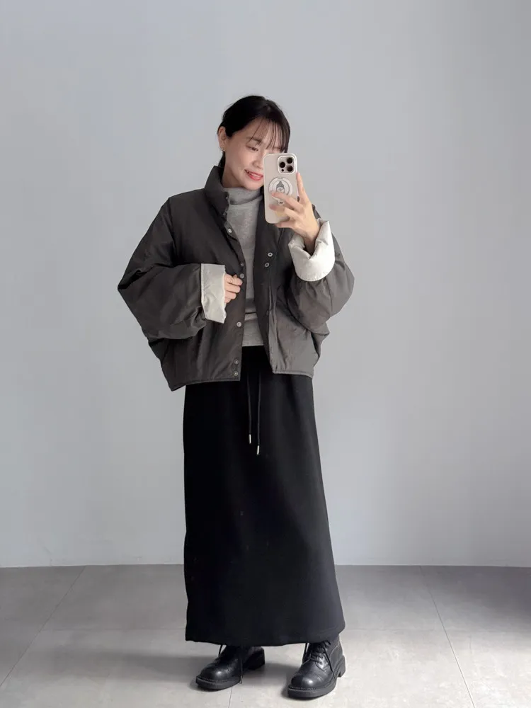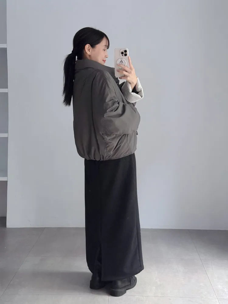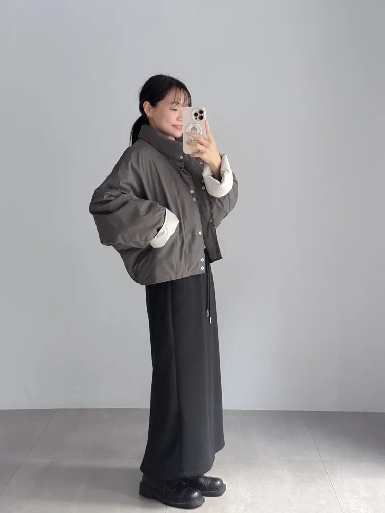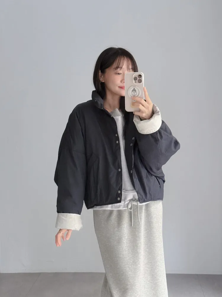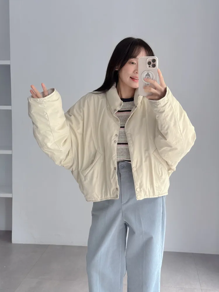 [特點] 立領+防風扣設計,短版剪裁,蓬鬆輕盈,下擺鬆緊設計,反摺袖口條紋布造型。