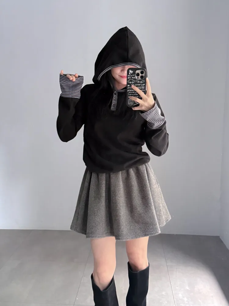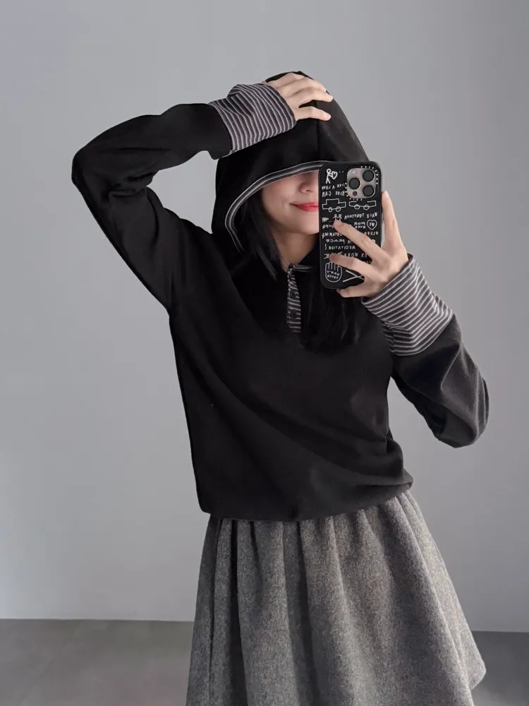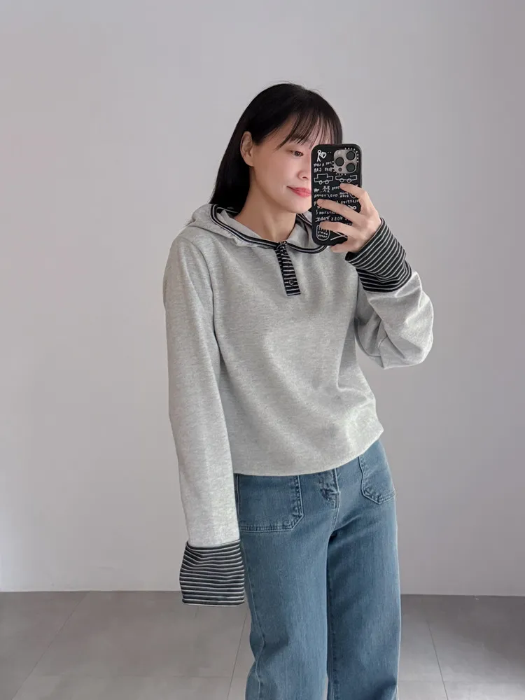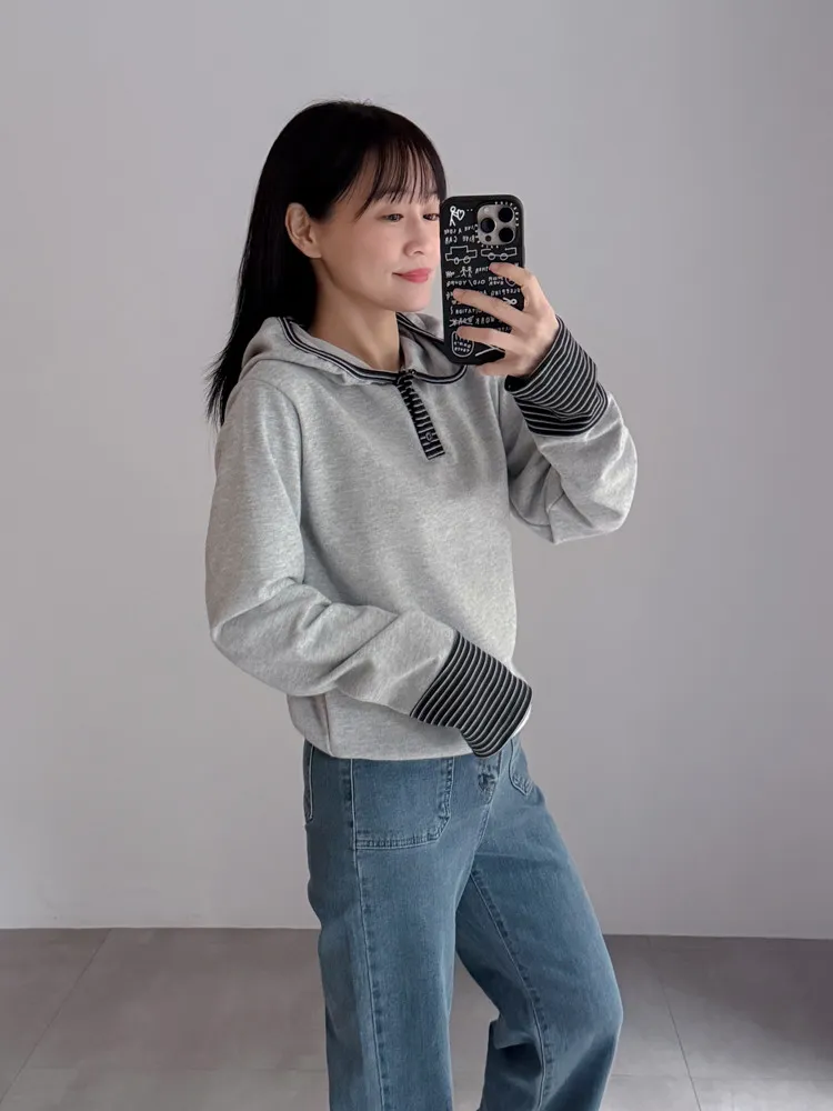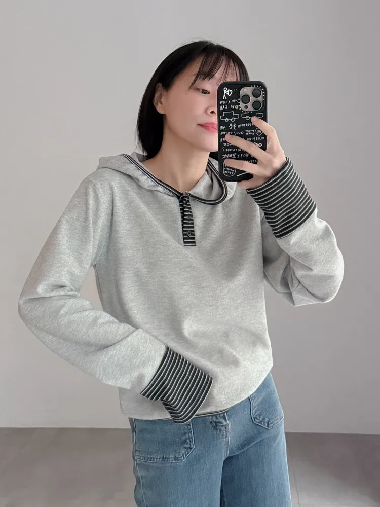 [特點] 磨毛偏薄手感面料,連帽設計,條紋拼袖造型。