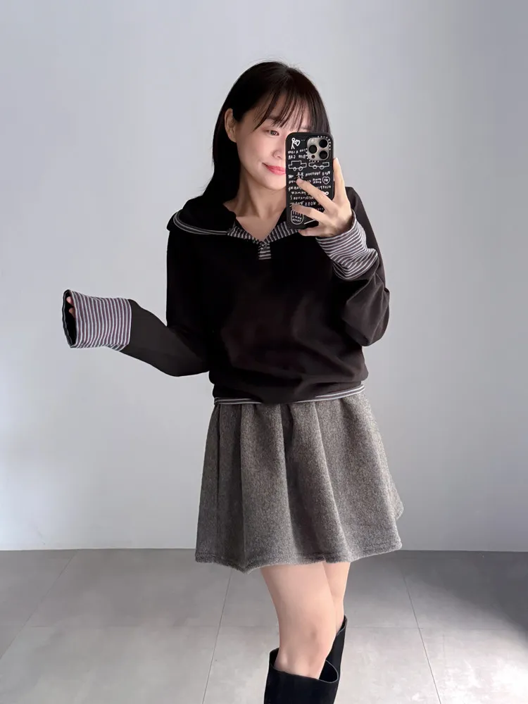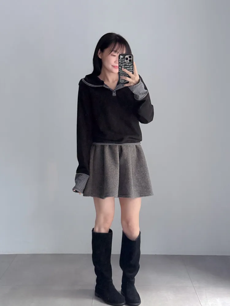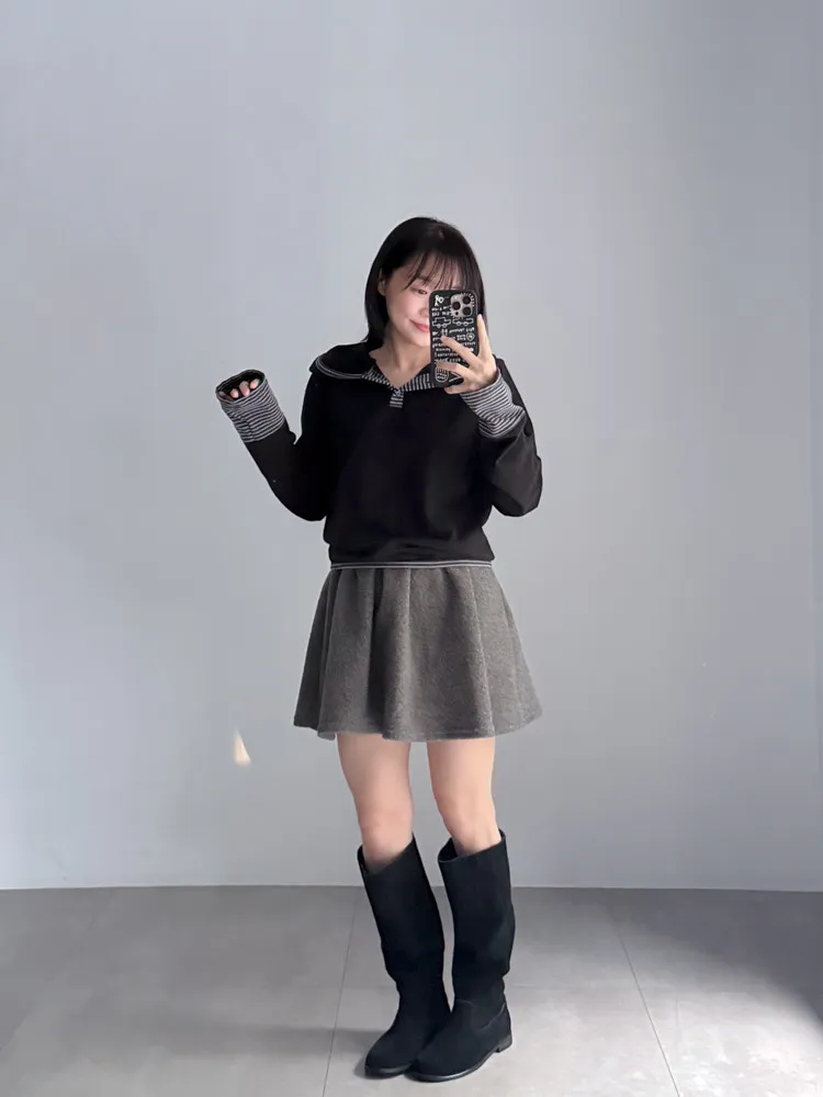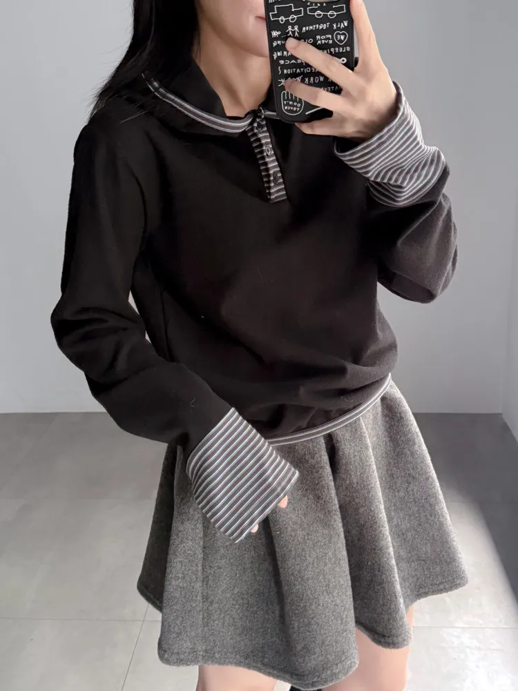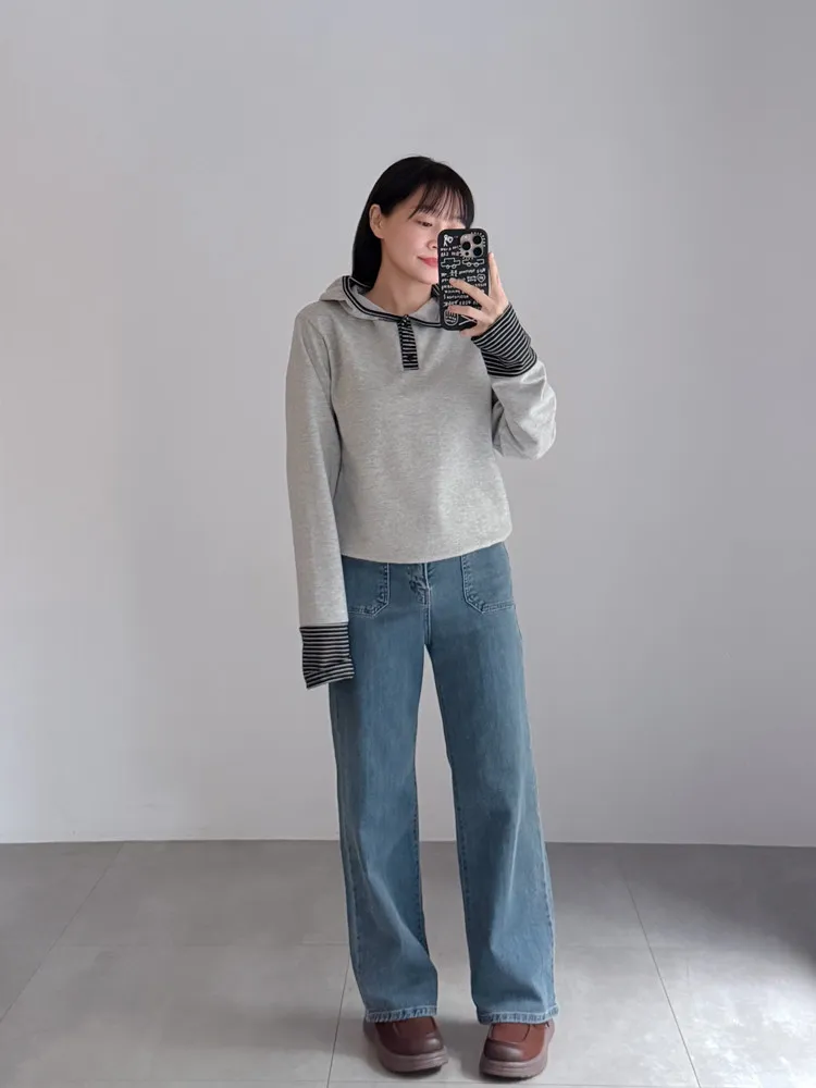 [特點] 磨毛偏薄手感面料,連帽設計,條紋拼袖造型。