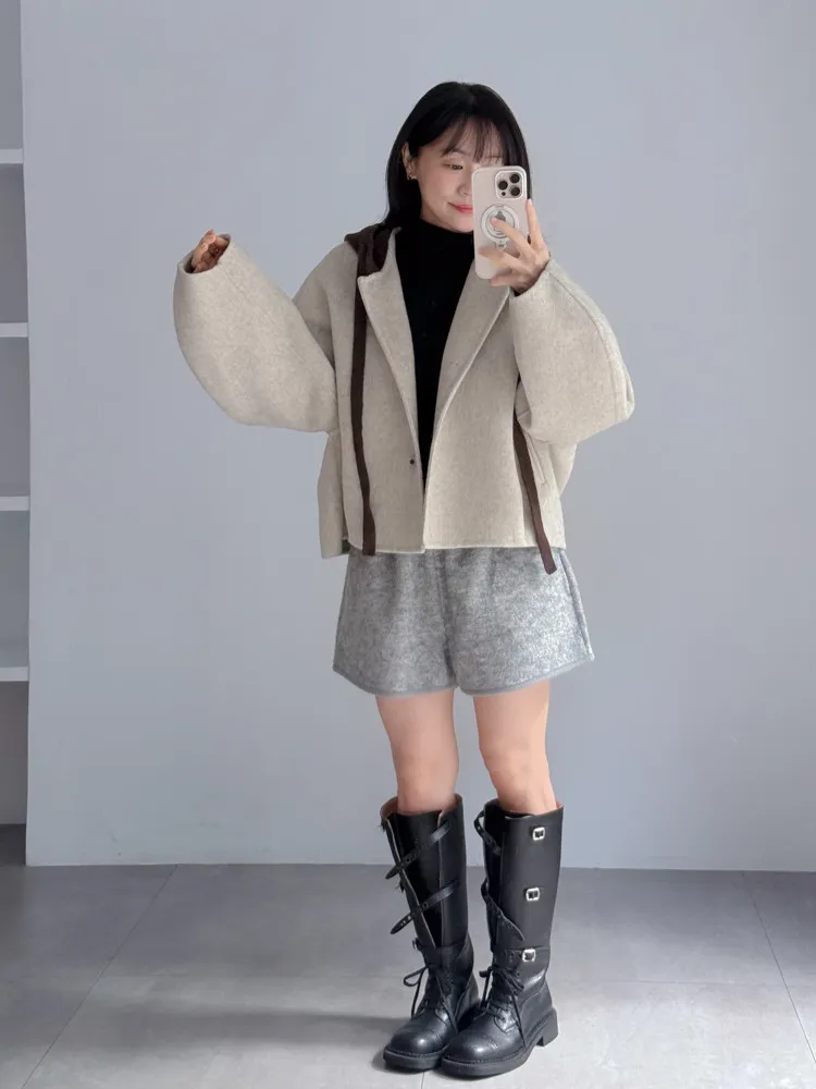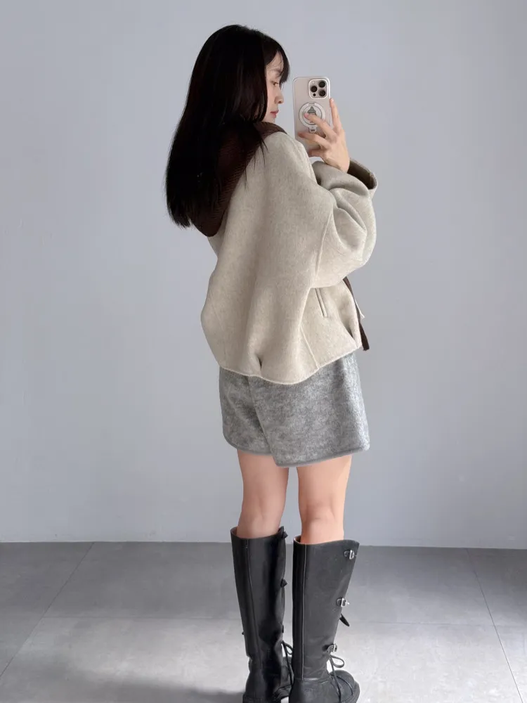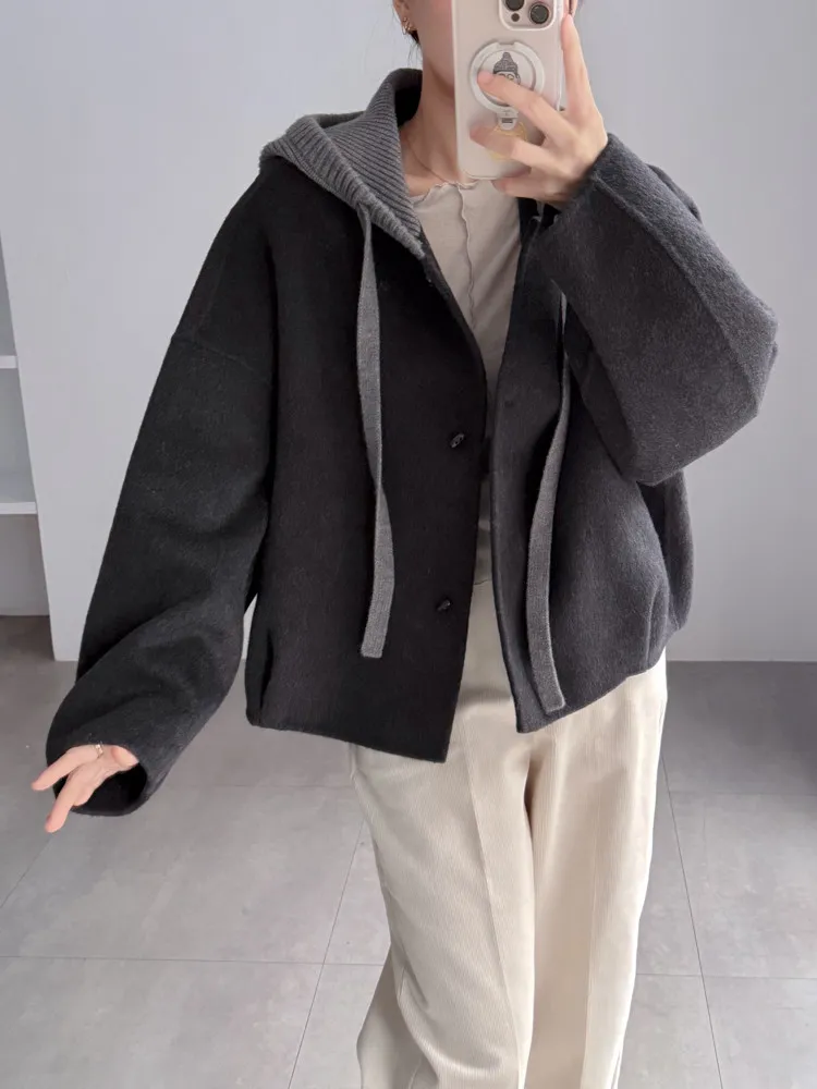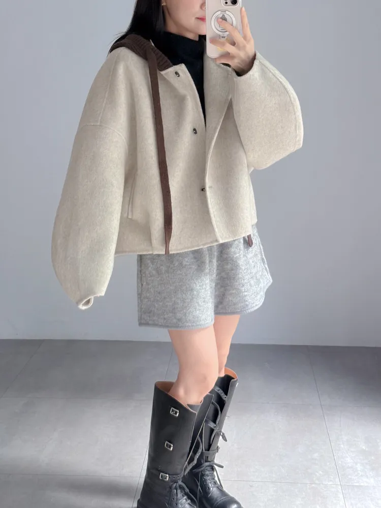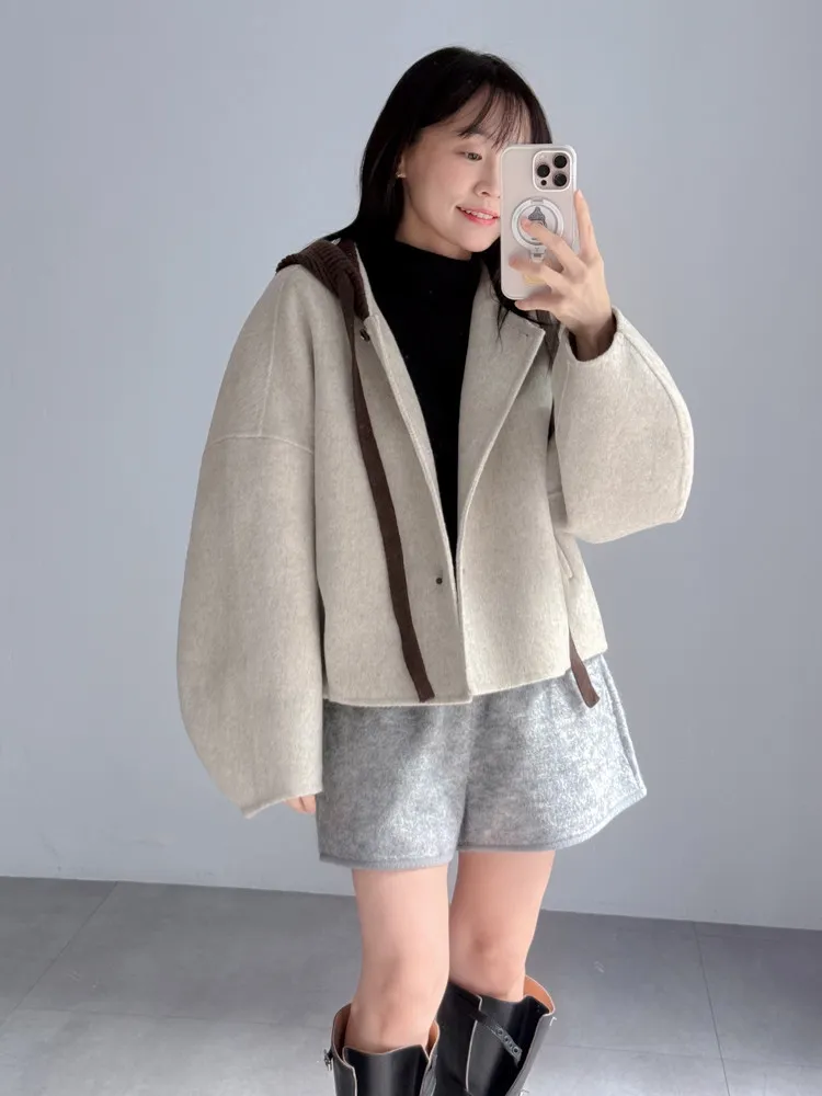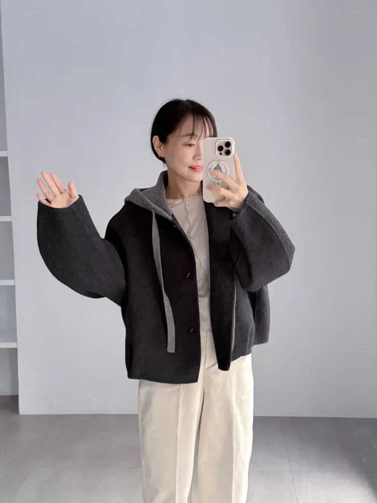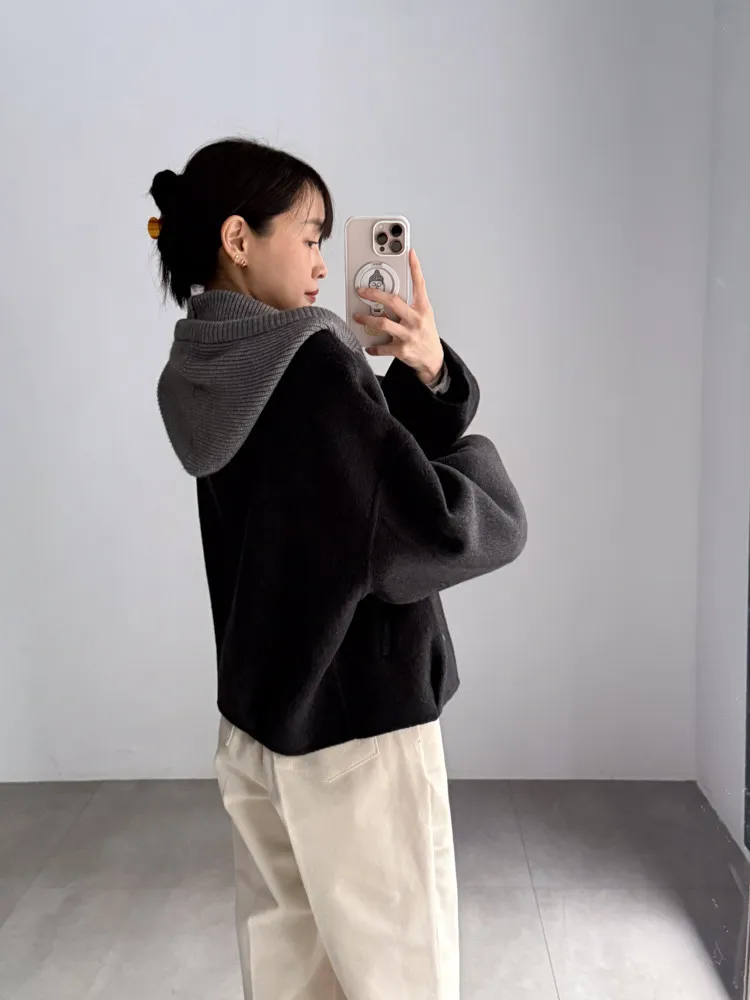 [成份] 羊毛80%、聚酯纖維17%、嫘縈3% [特點] 舒適不扎膚的紮實手感面料,表面細緻帶霧感,拼接針織連帽(不可拆) 短版剪裁,厚度適中,保暖度佳。 [洗滌建議] 含羊毛成份,建議送乾洗,較易維持衣服的完整性