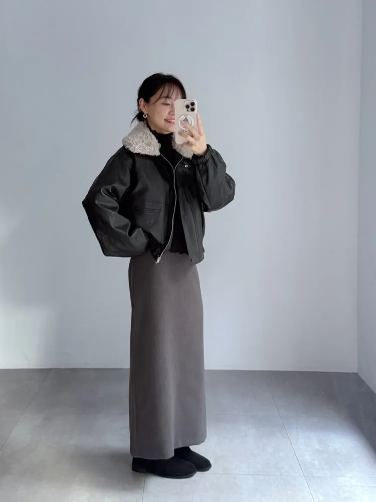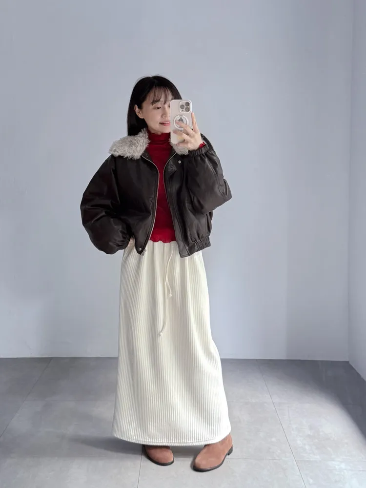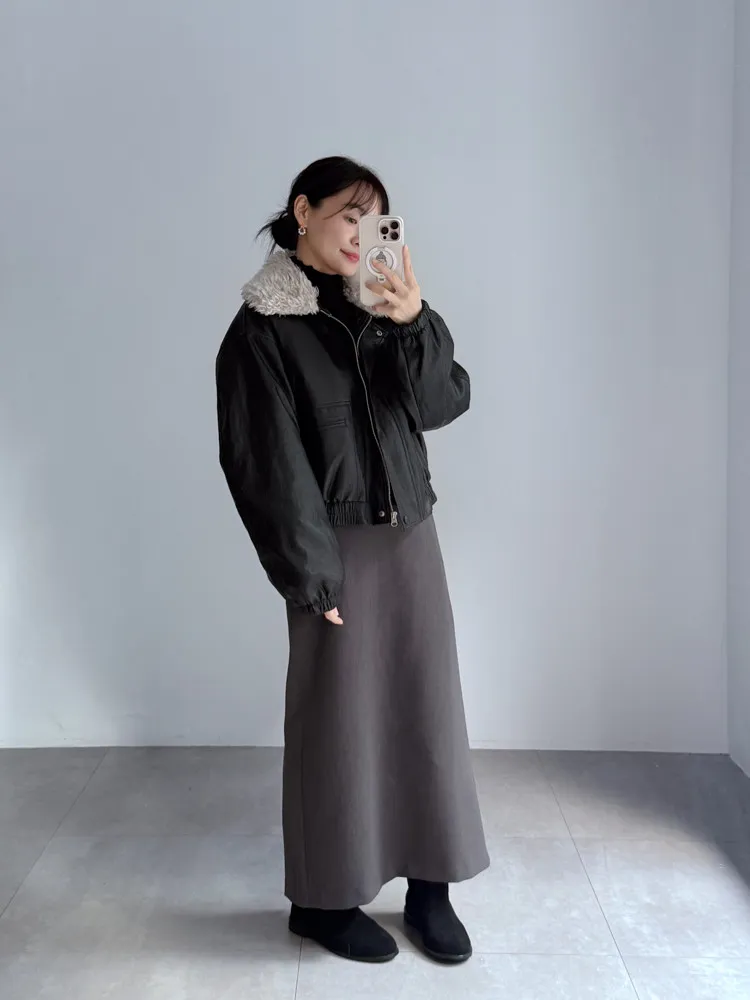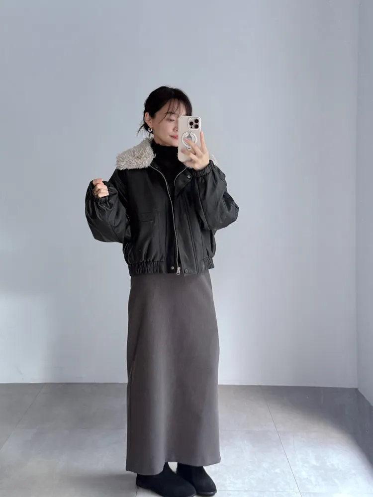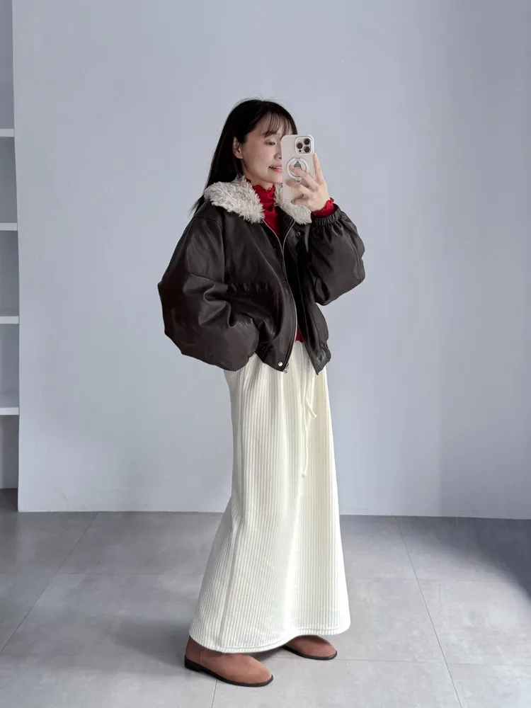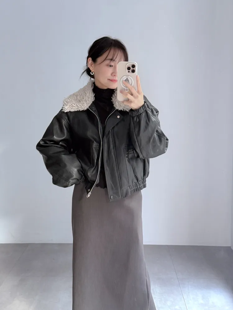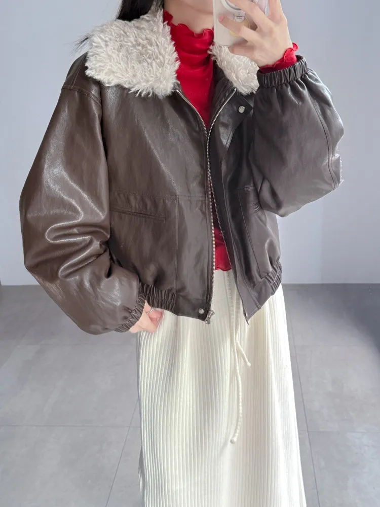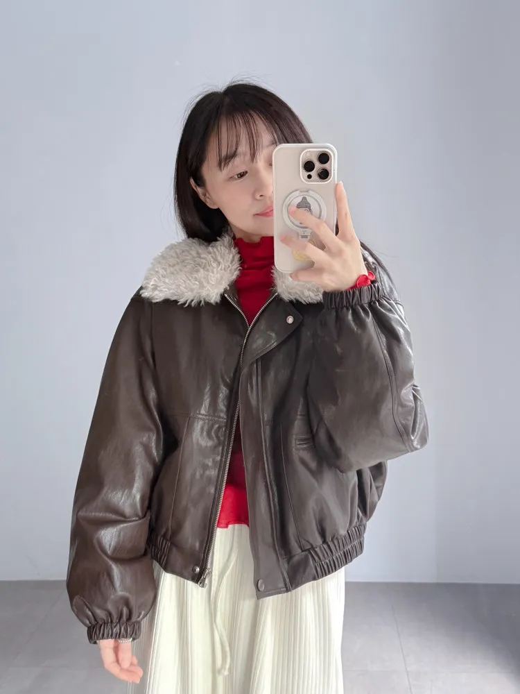 [特點] 霧光澤皮革質感面料很柔軟,蓬鬆捲捲毛領、拉鍊+壓釦穿脫、