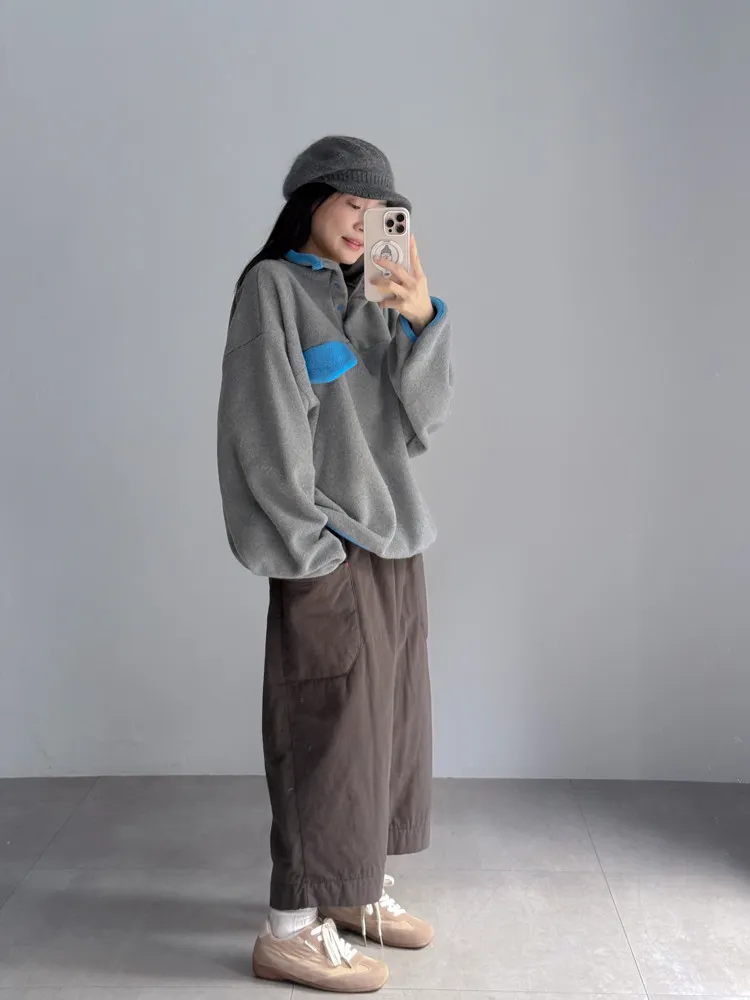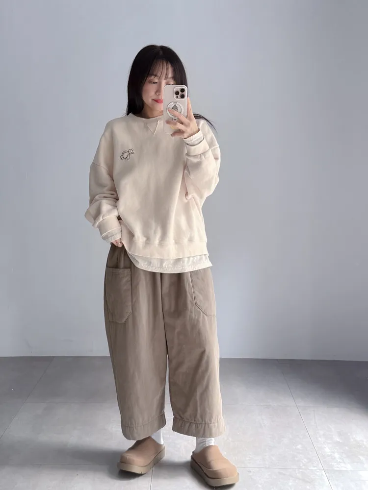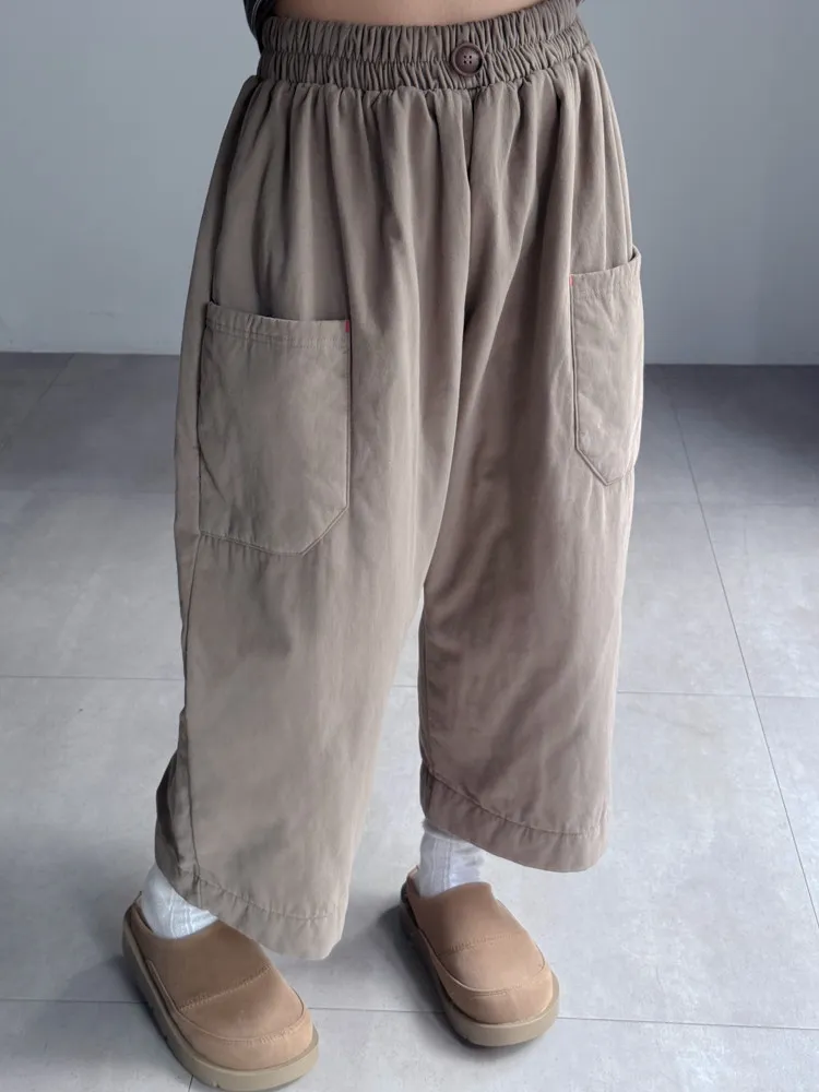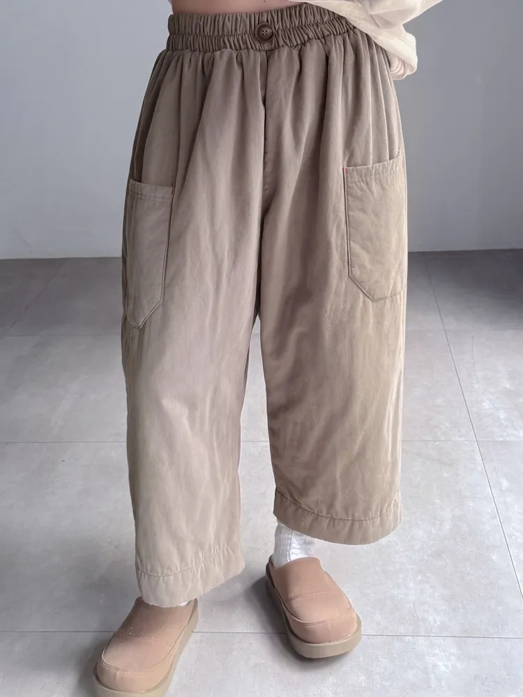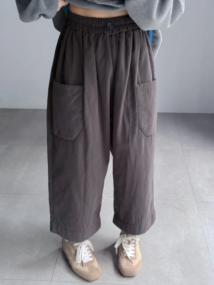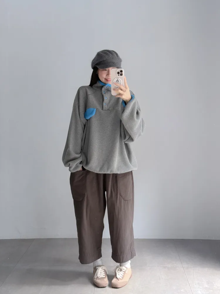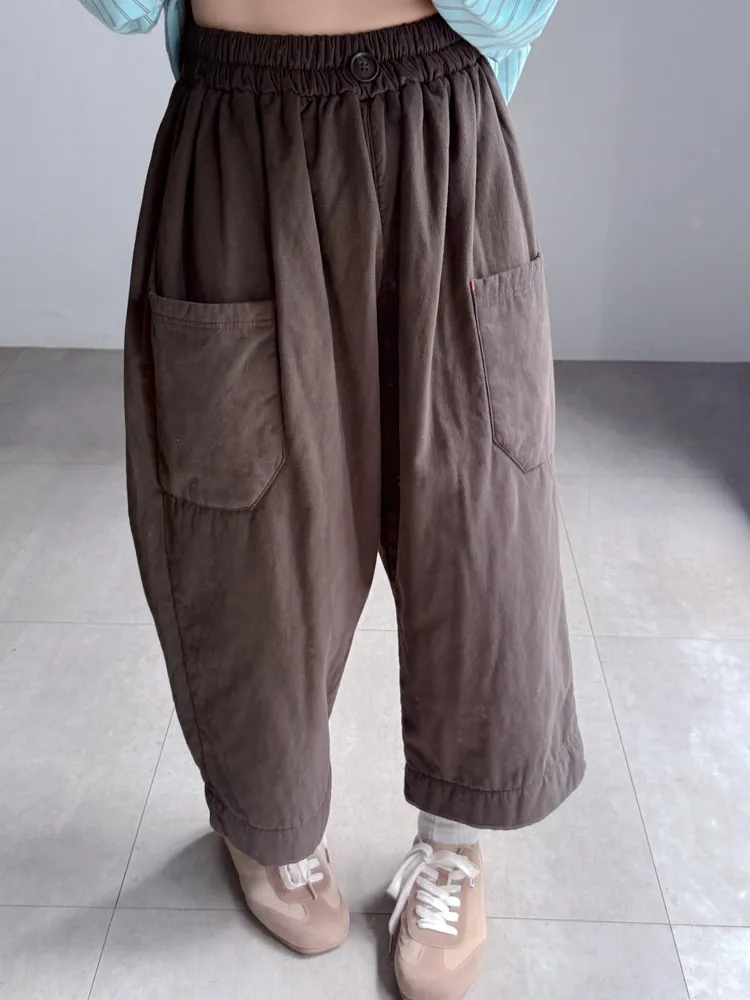 [特點] 鬆緊彈性腰圍,單顆鈕扣裝飾,上寬下寬版型,長度穿起來約8分長,絨料手感內有內裡布。