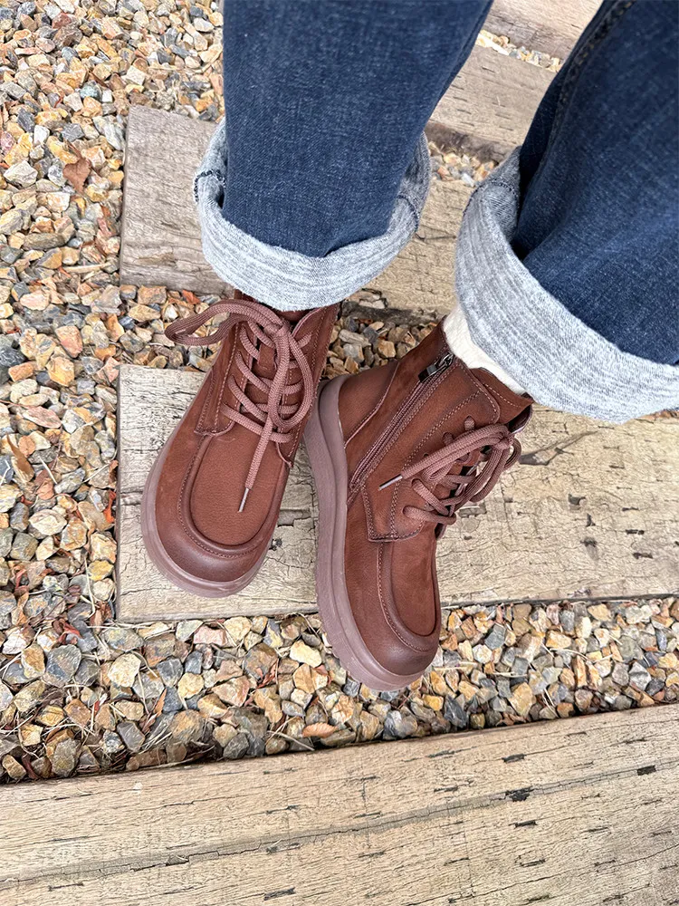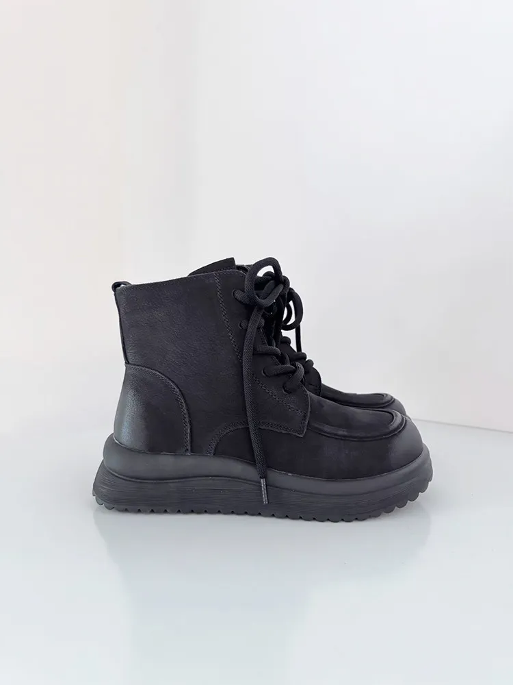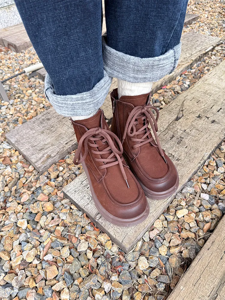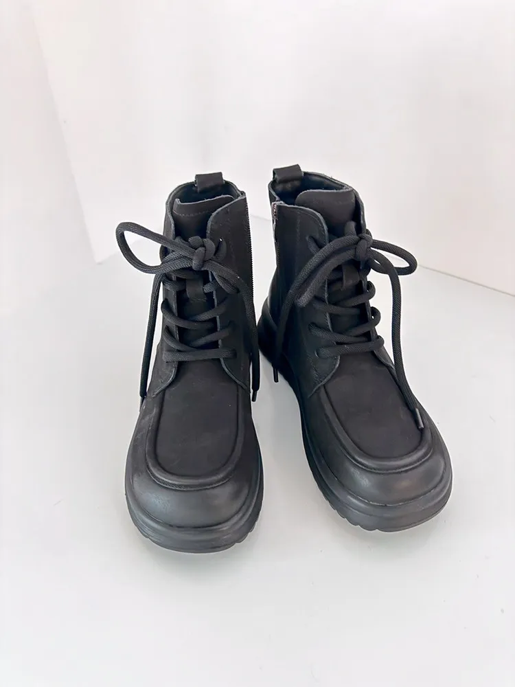 [成份] 牛皮100%[特點] 牛皮鞋面,霧面皮質厚實柔軟、挺度好,穿起來有份量但不僵硬,內裡與鞋墊皆為刷毛設計,綁帶+側拉鍊穿脫+短筒設計、包覆性佳,厚底鞋底好走。*版型偏小,建議拿大半號闆娘腳長22.5 這雙穿23號