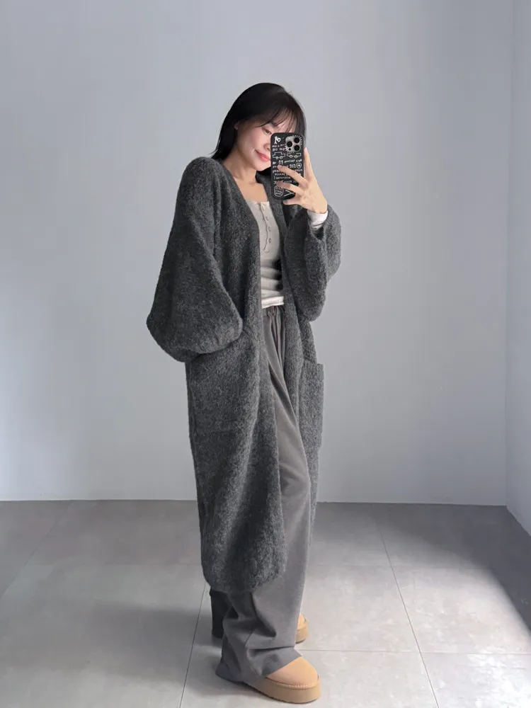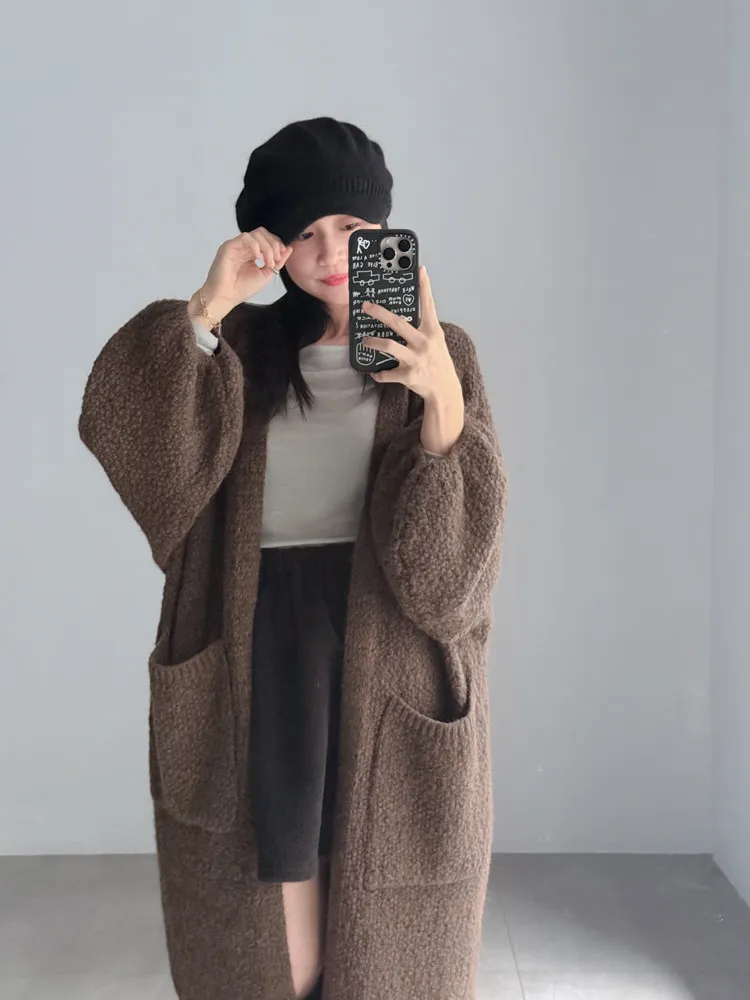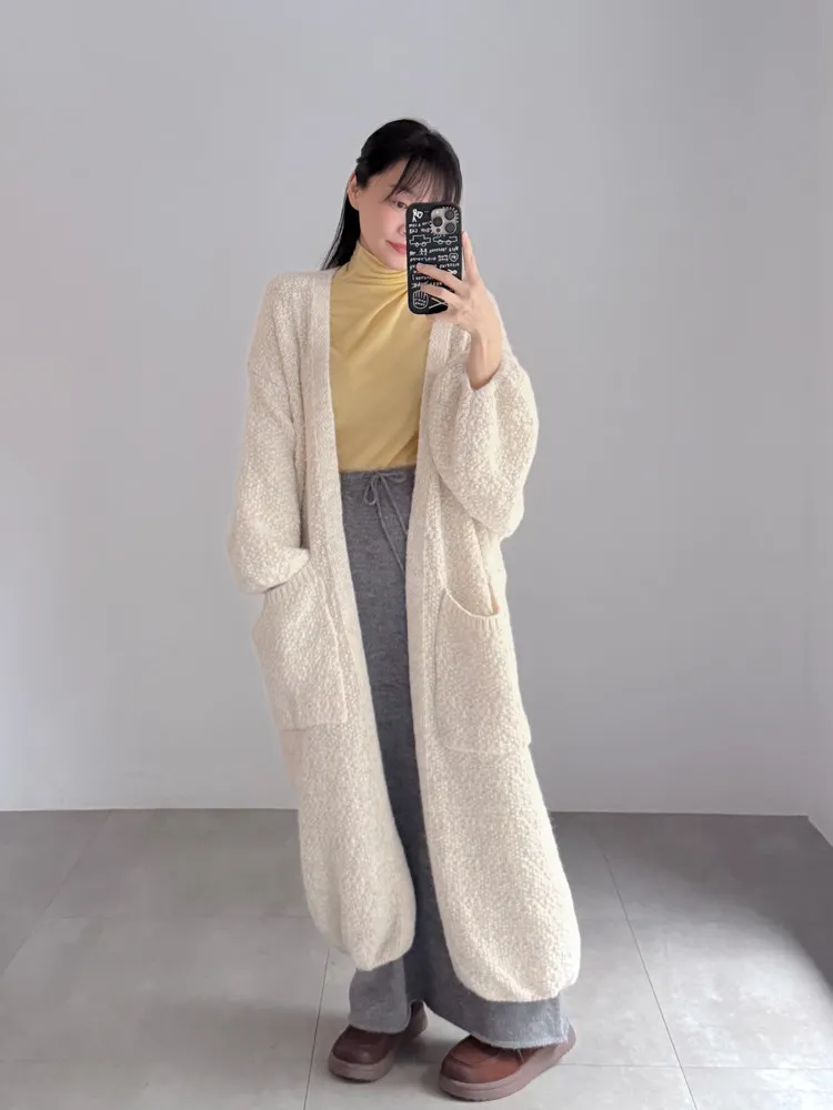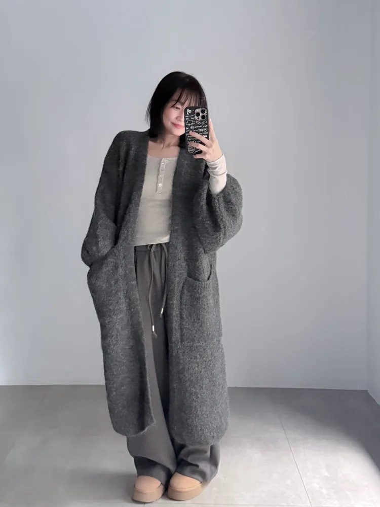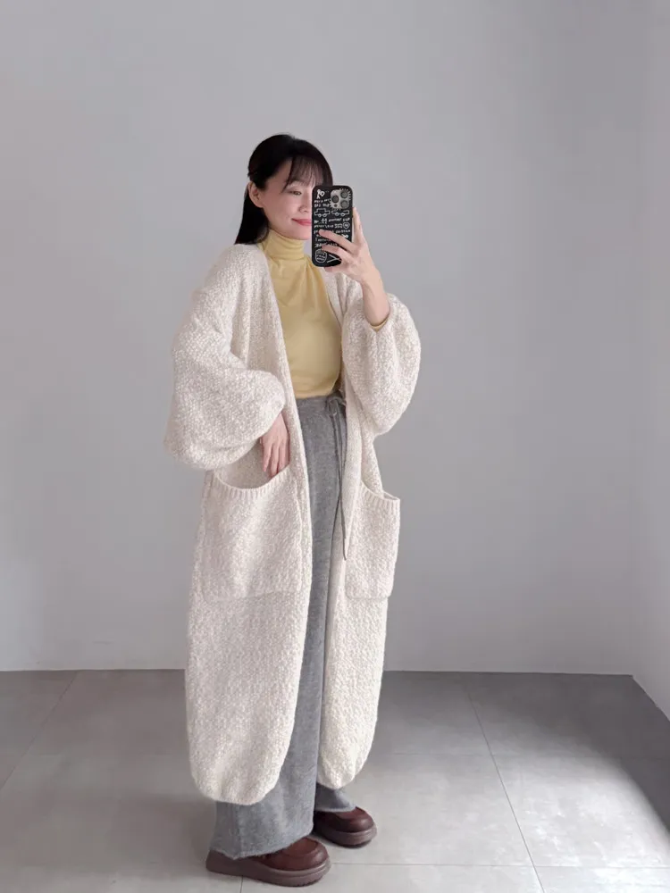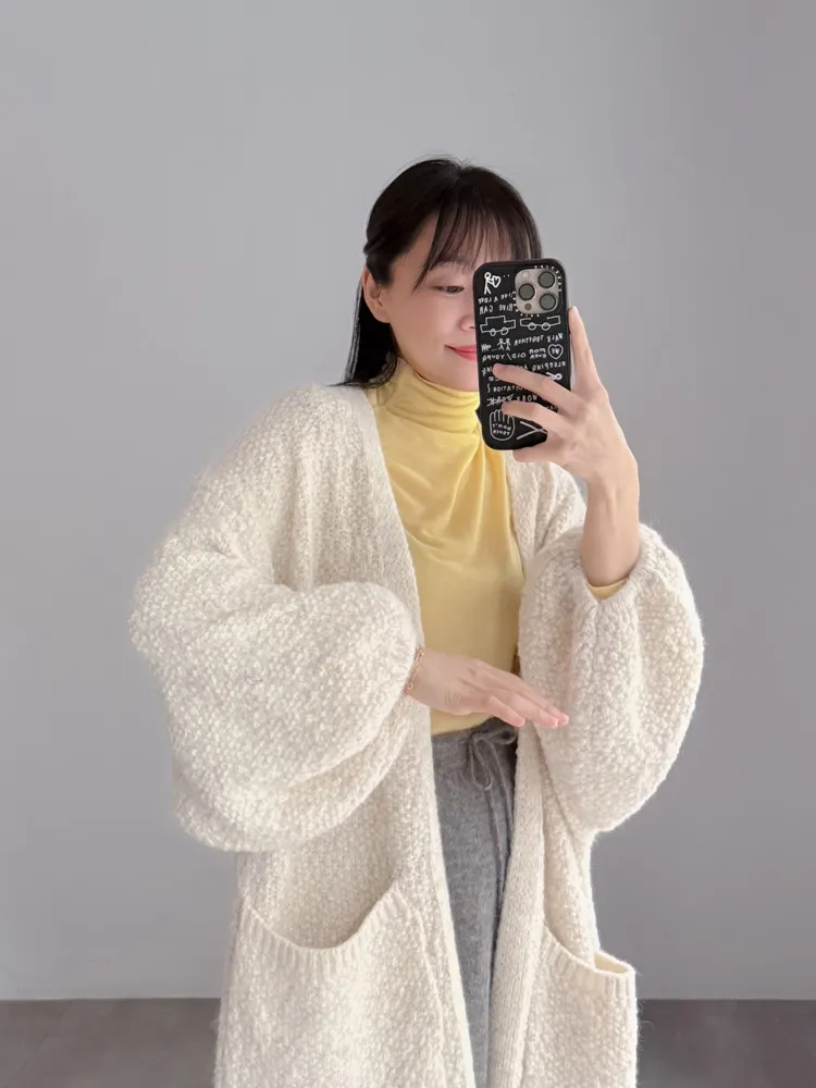 [特點] 扎實鬆軟面料,落肩+開襟設計,長版版型修身、保暖。
