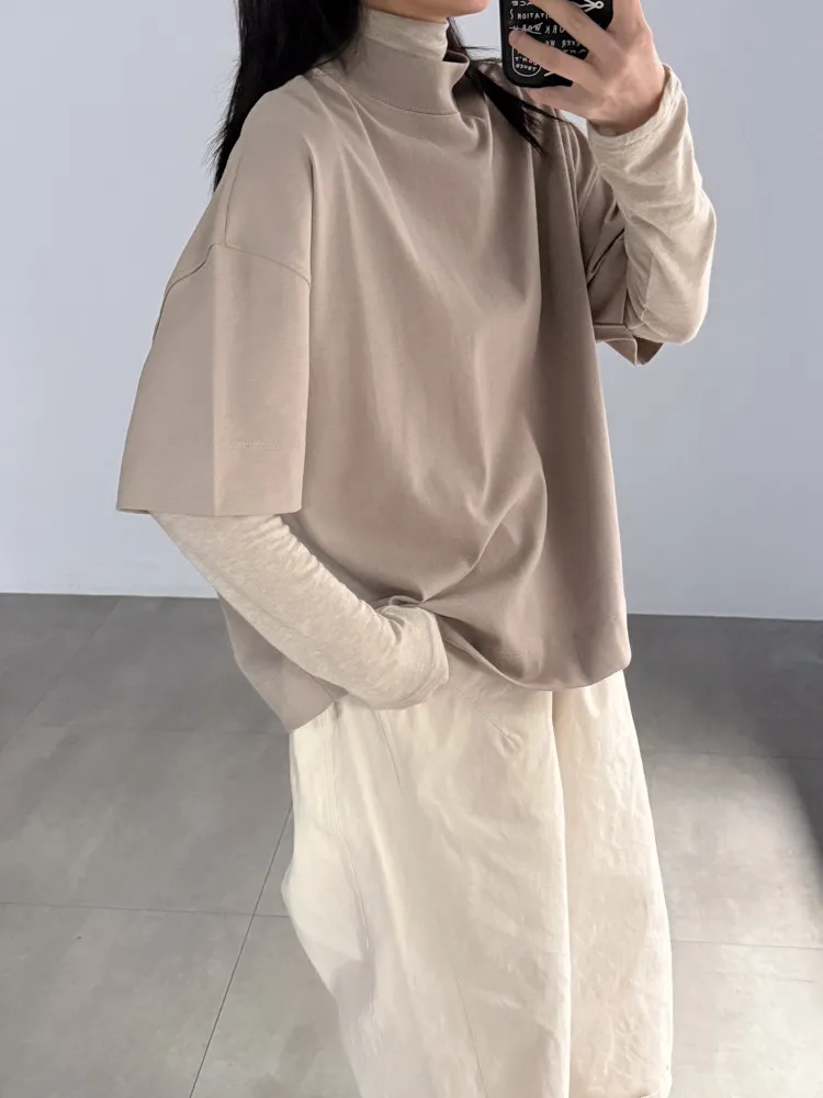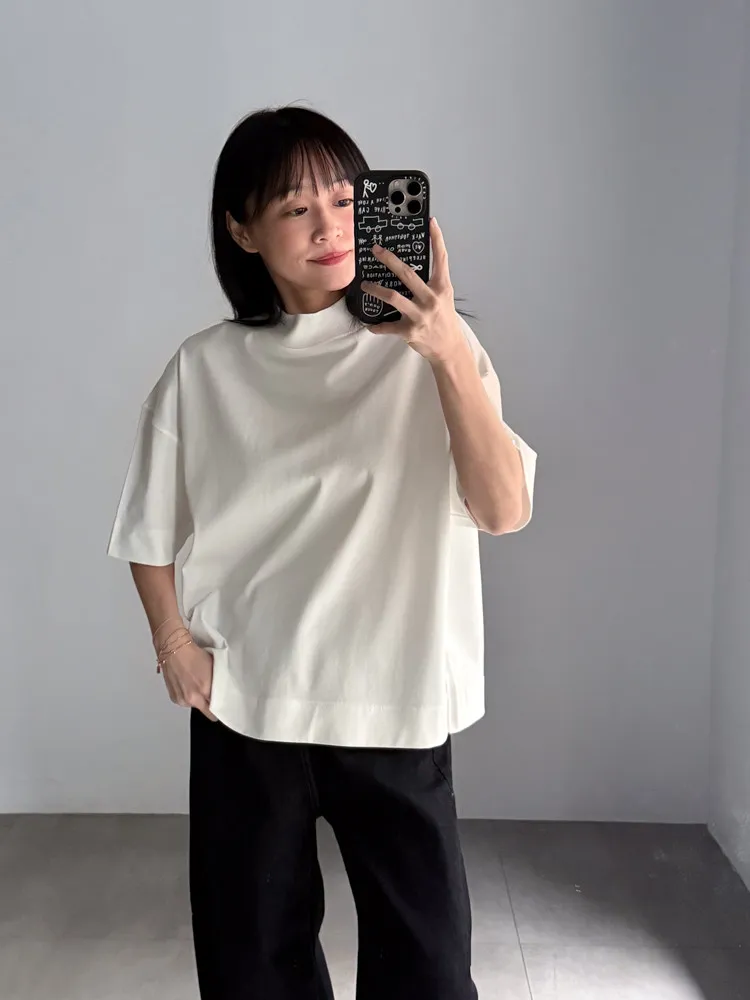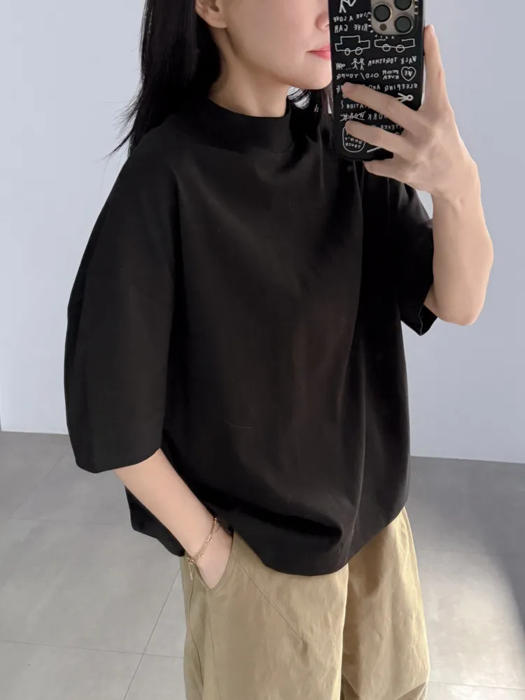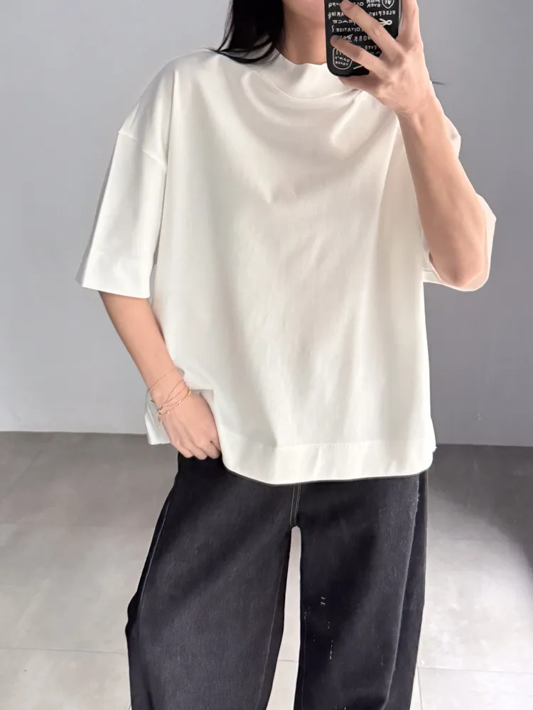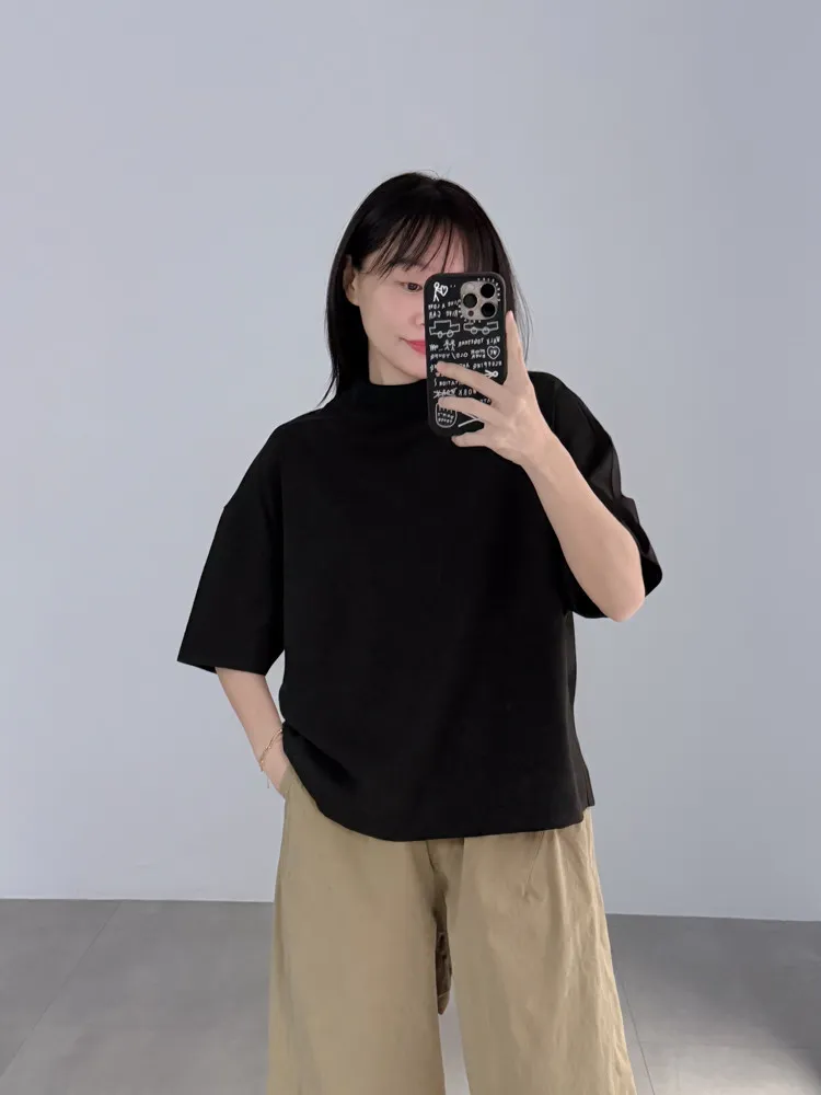 極簡半高領五分袖棉T