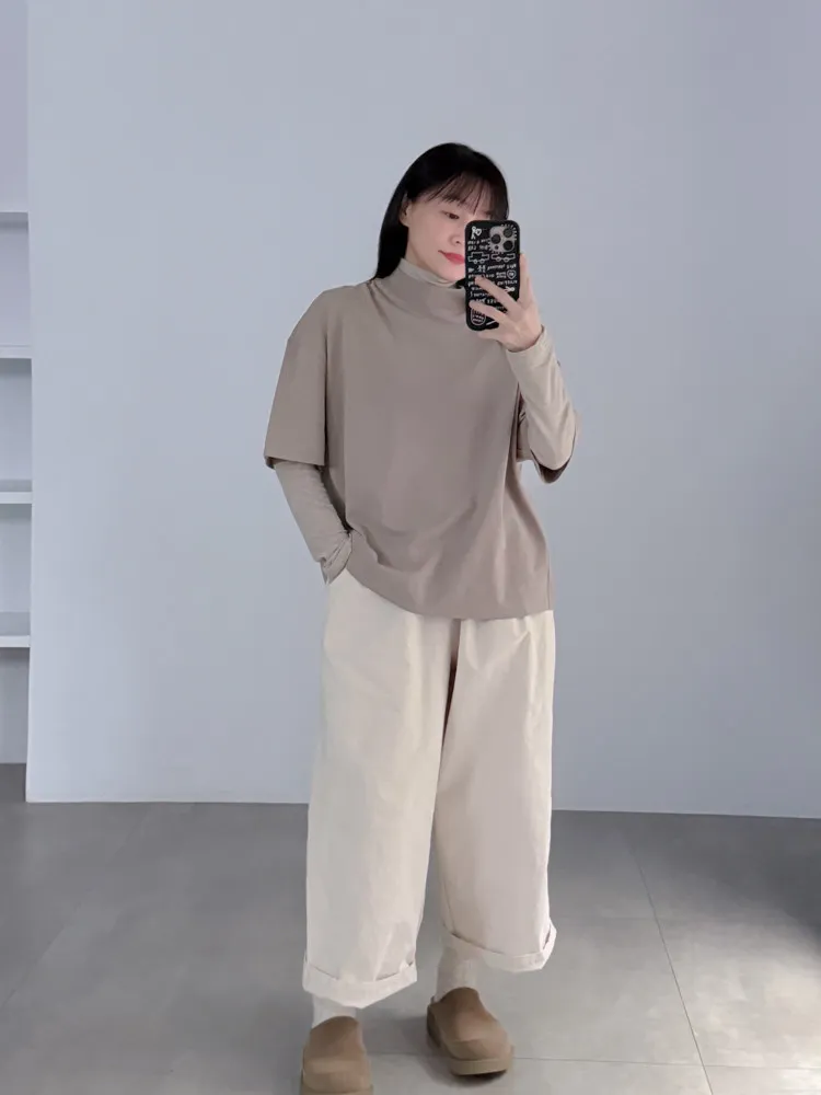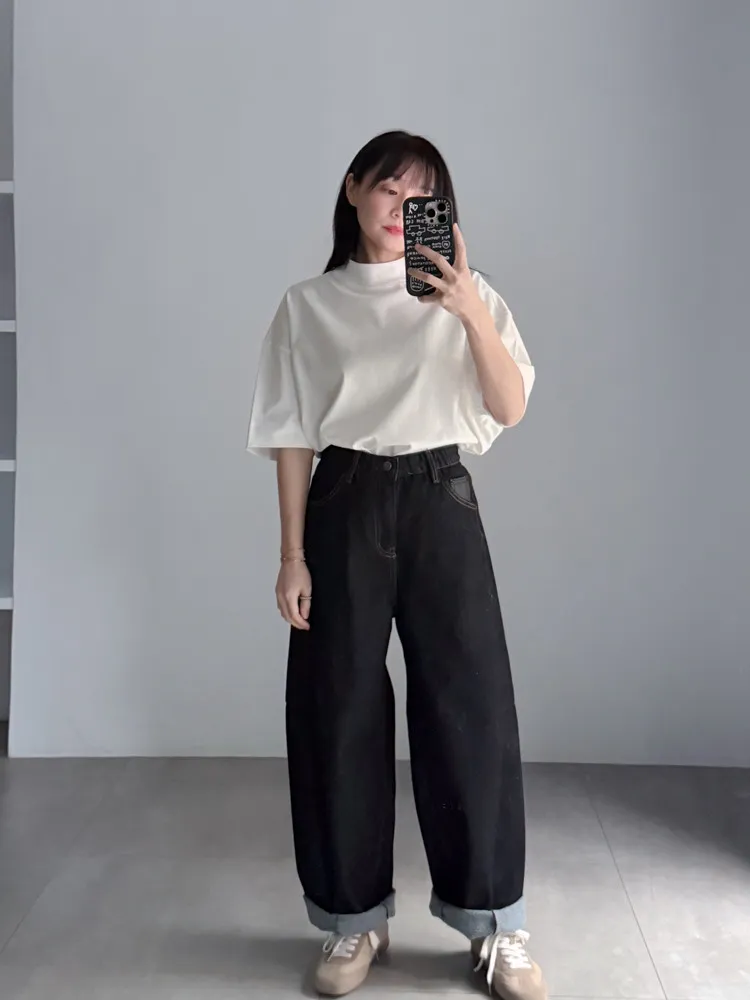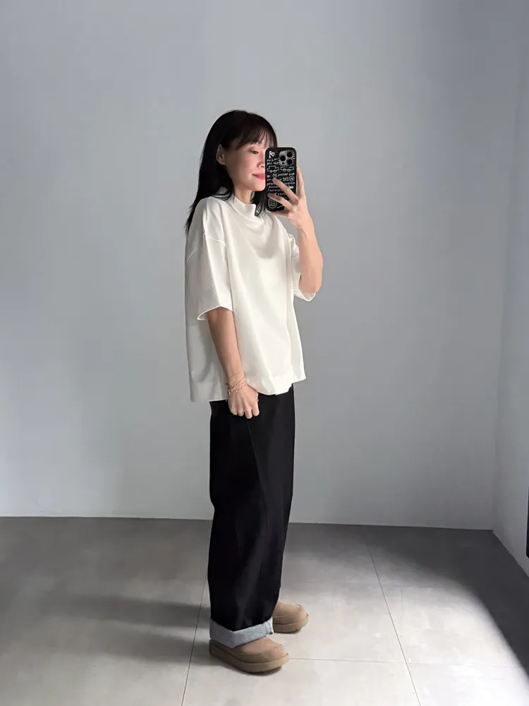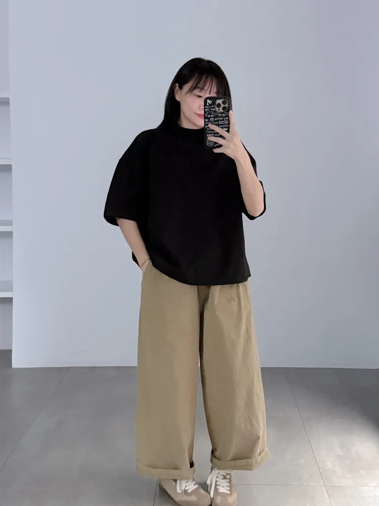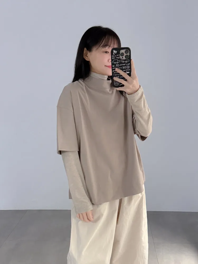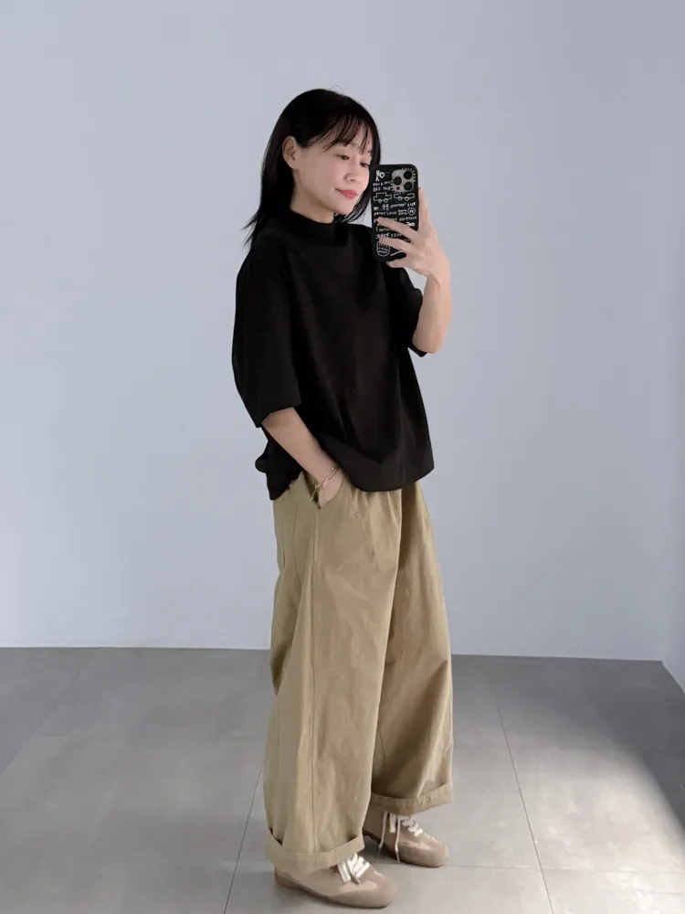 極簡半高領五分袖棉T