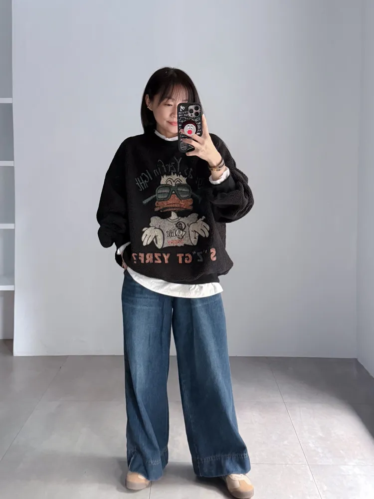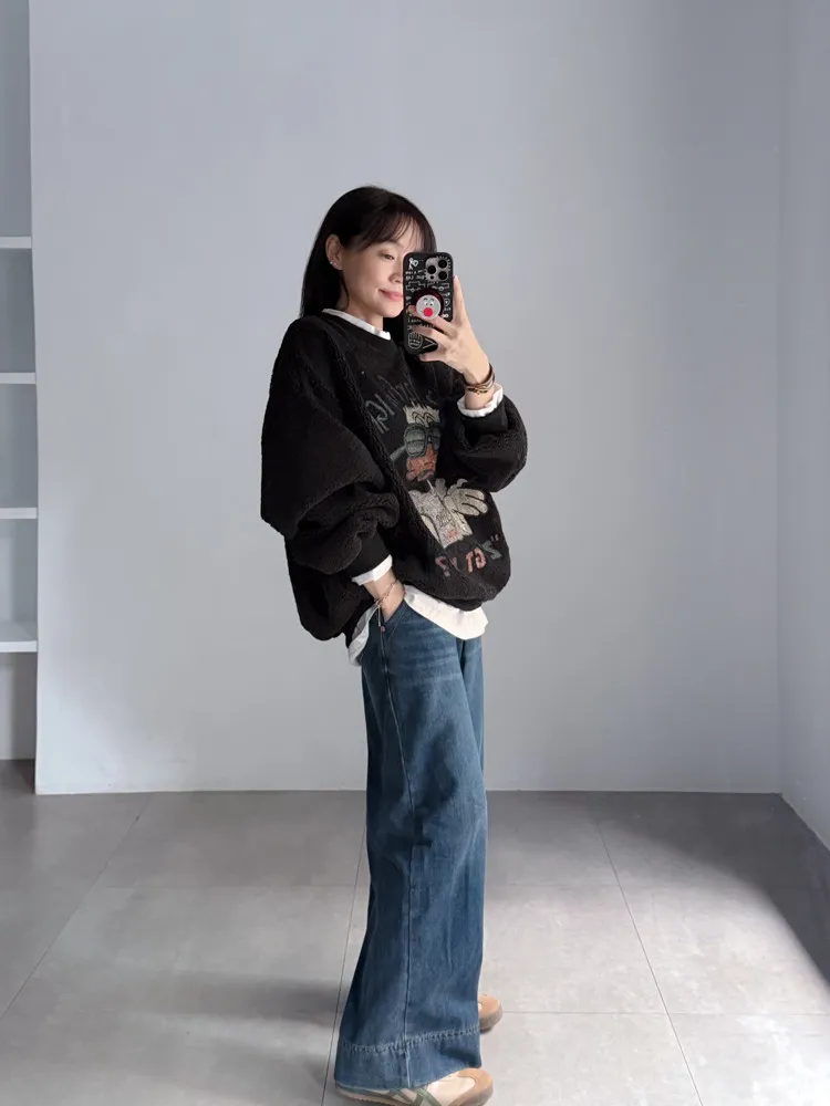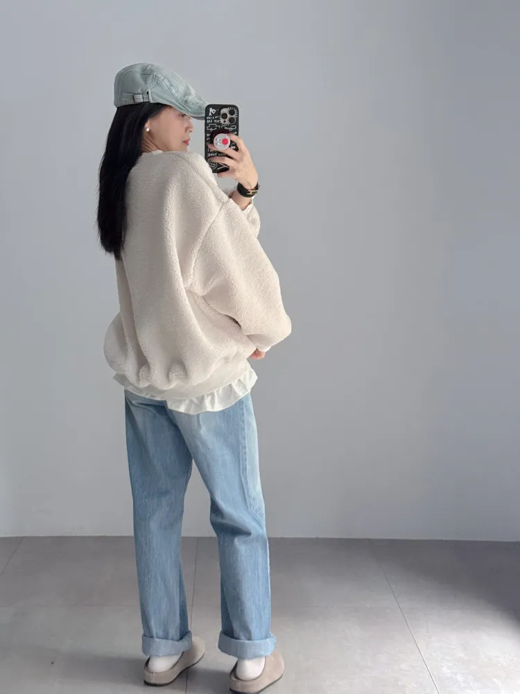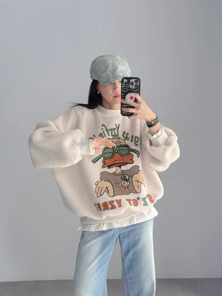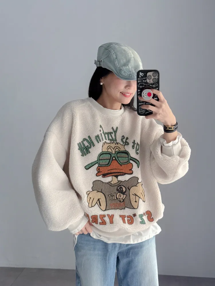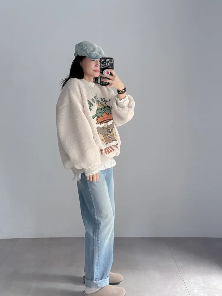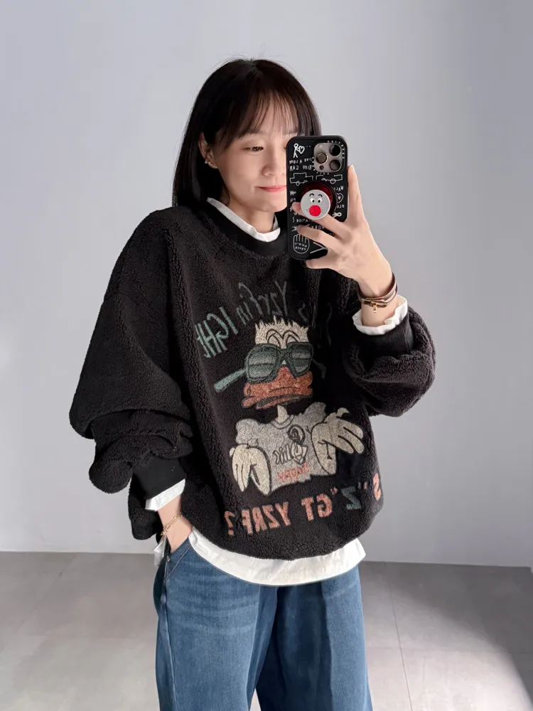 [特點] 圓領假兩件式設計,柔軟羊羔毛面料,版型較寬鬆,壓印圖案。
