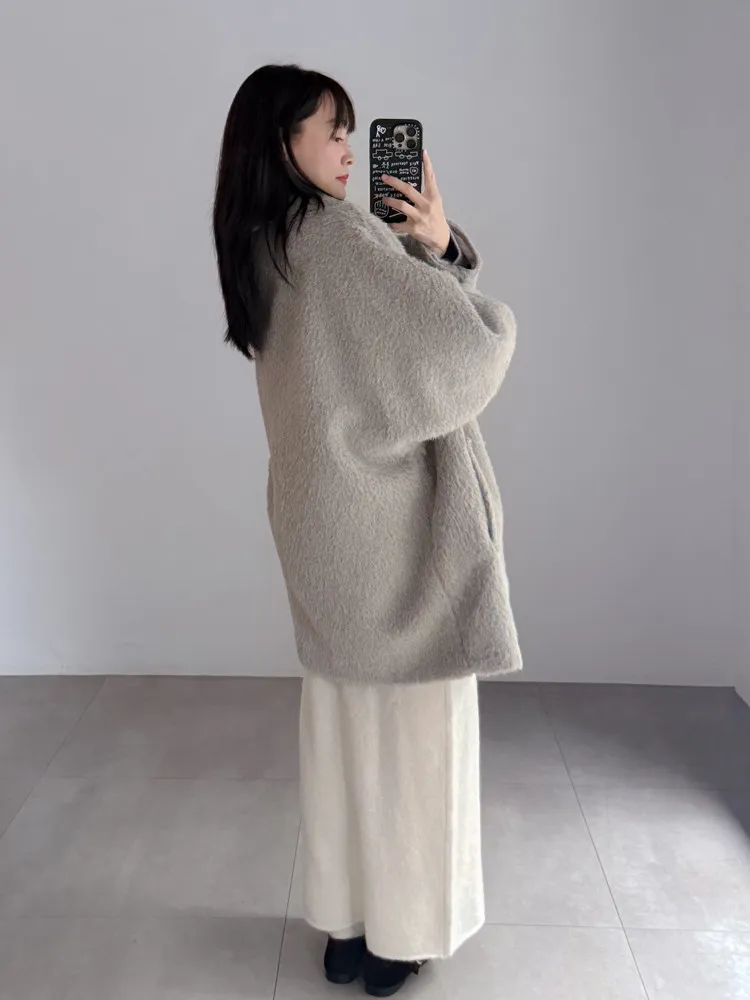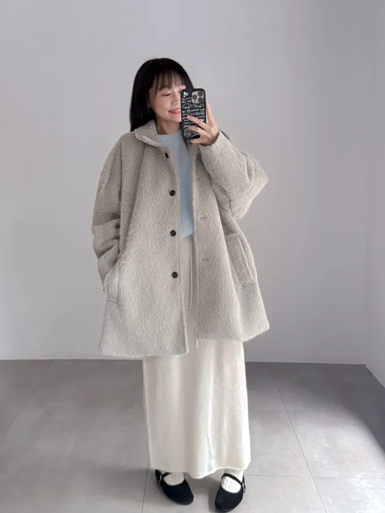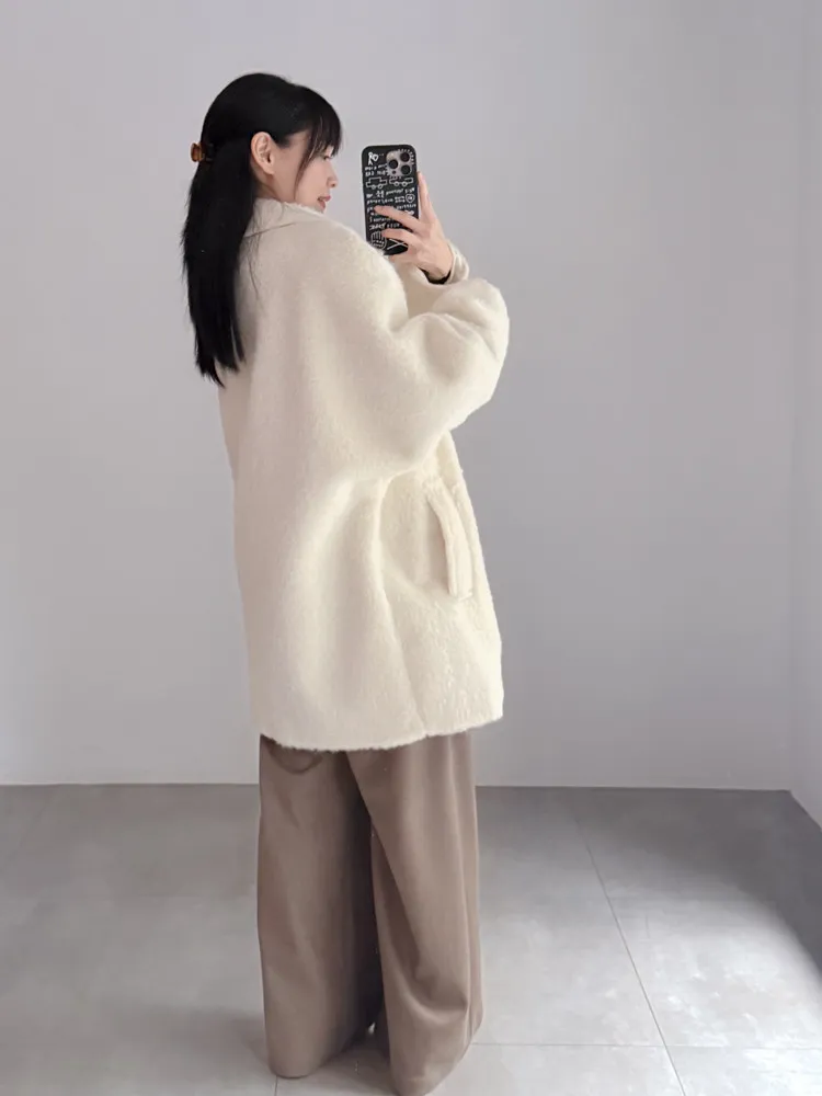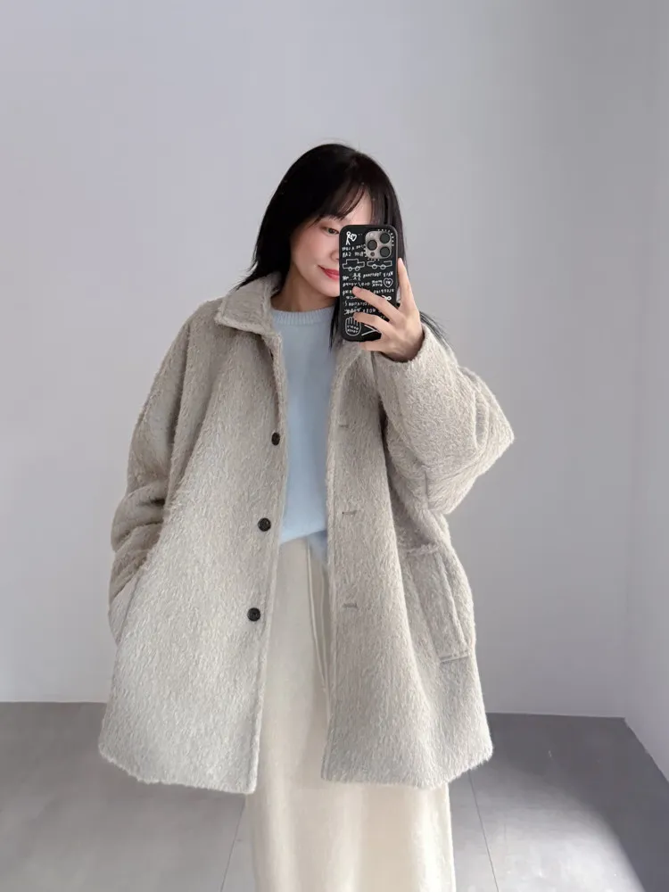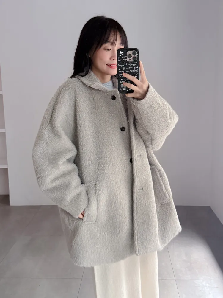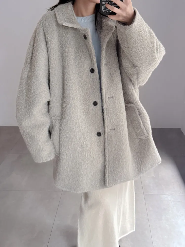 [特點] 柔霧毛海感舒適親膚,有內裡設計,落肩剪裁+微繭型感設計,排釦造型。