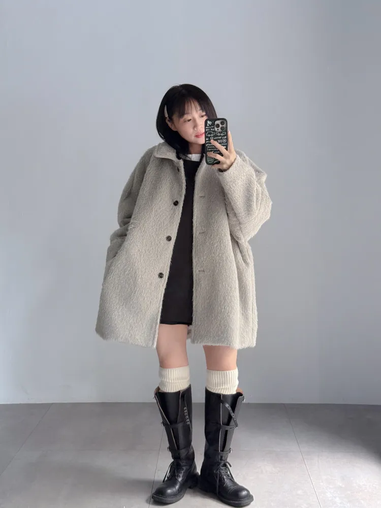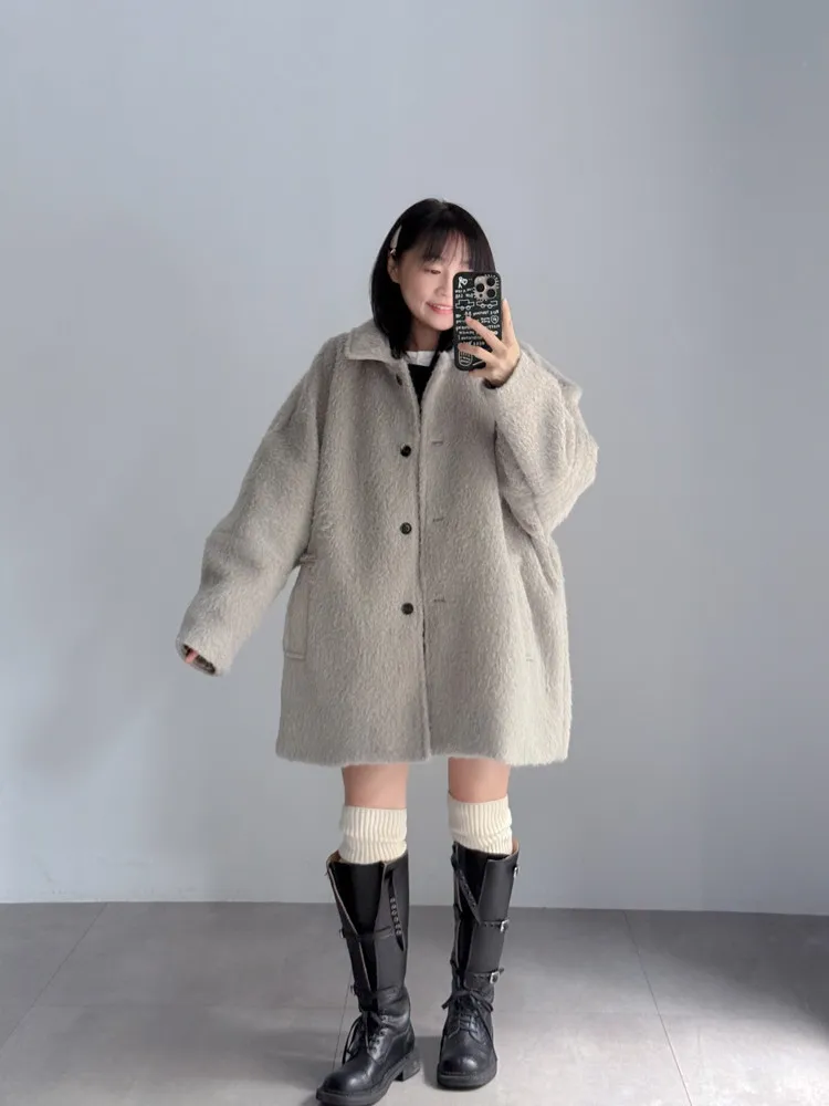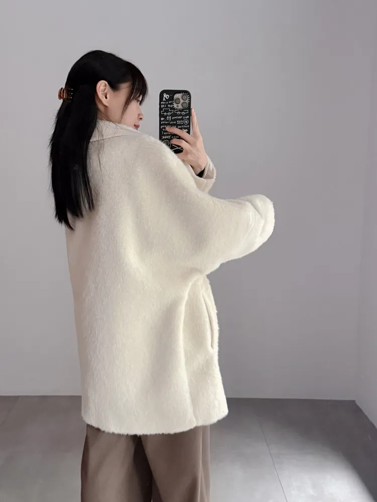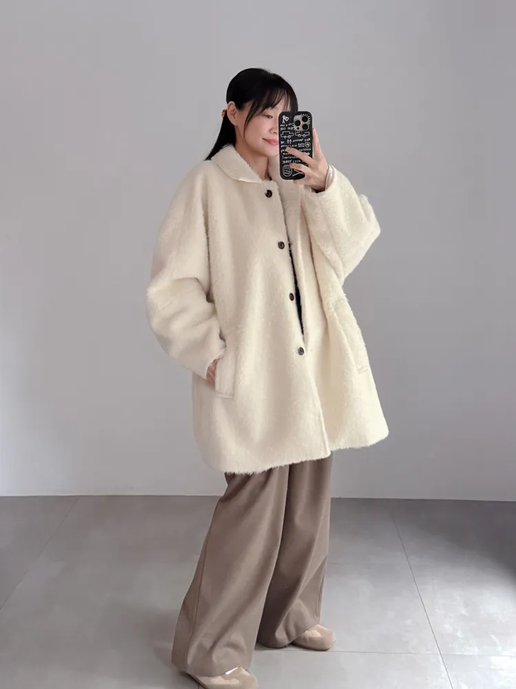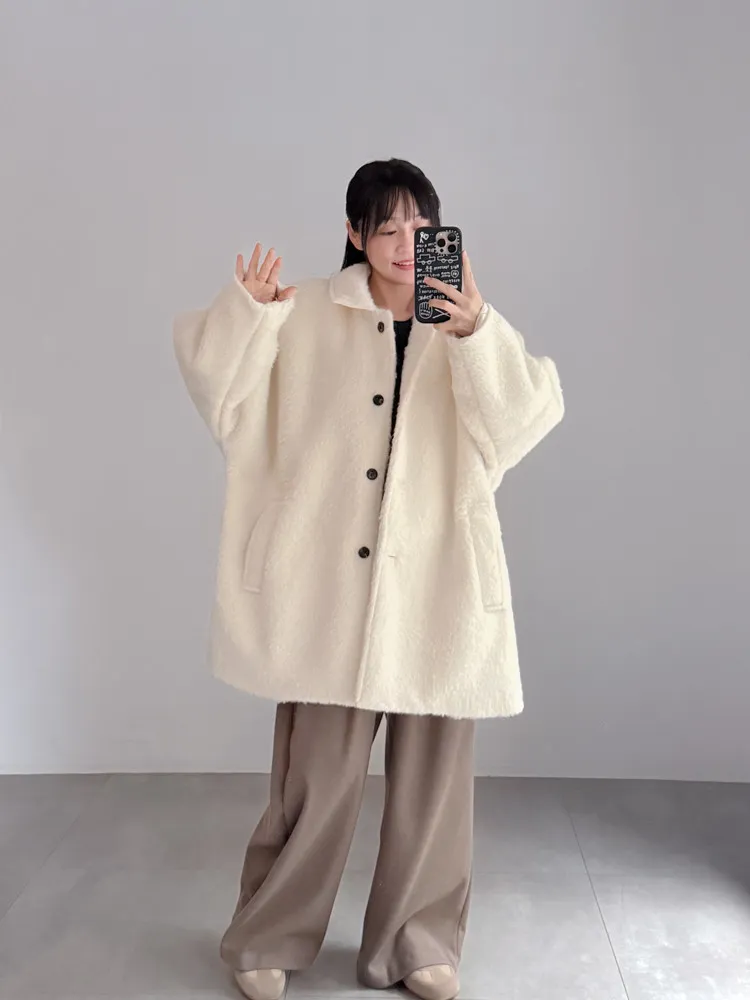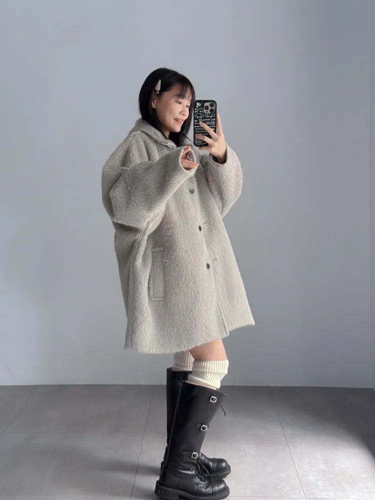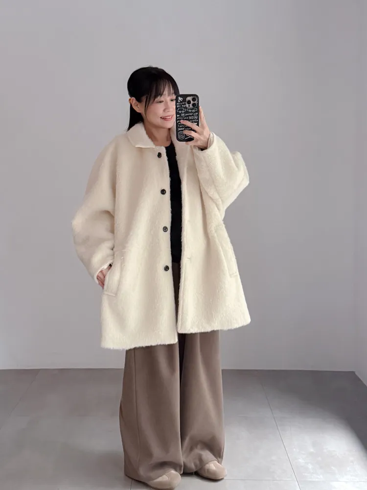 [特點] 柔霧毛海感舒適親膚,有內裡設計,落肩剪裁+微繭型感設計,排釦造型。
