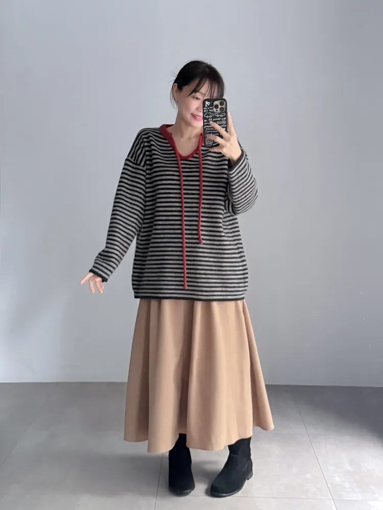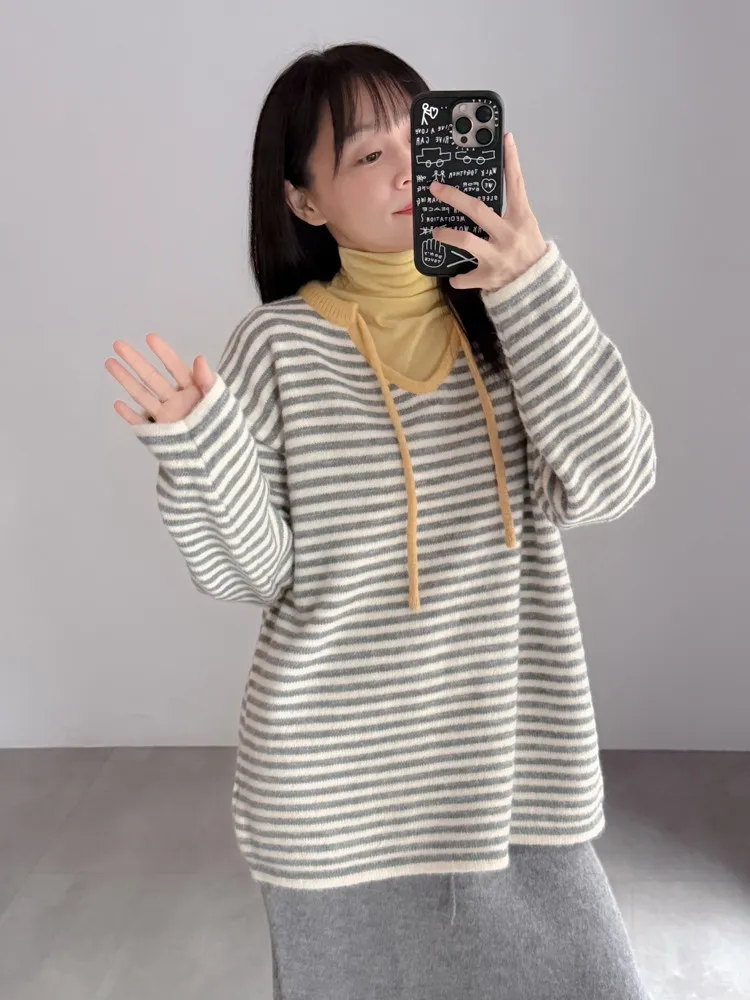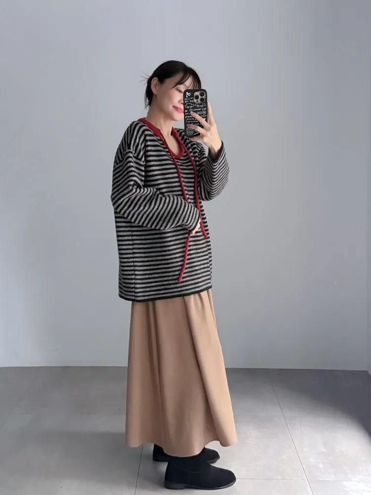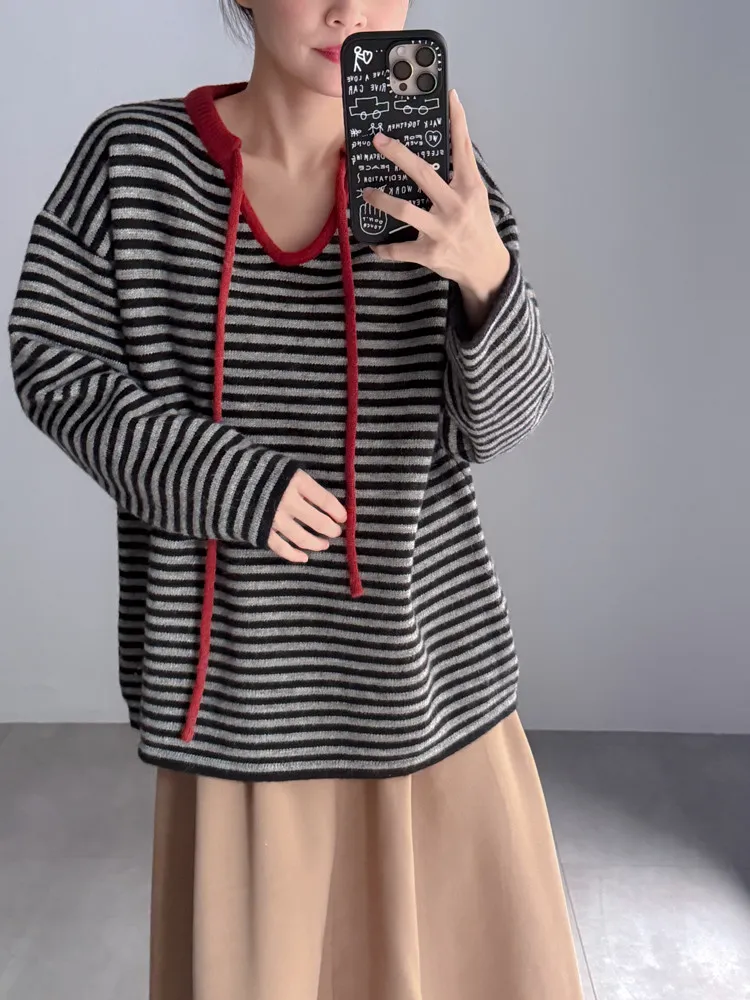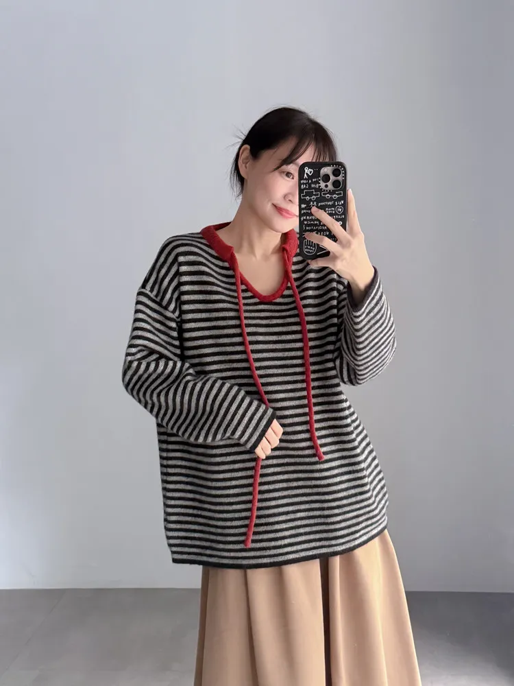撞色領綁帶條紋針織衣