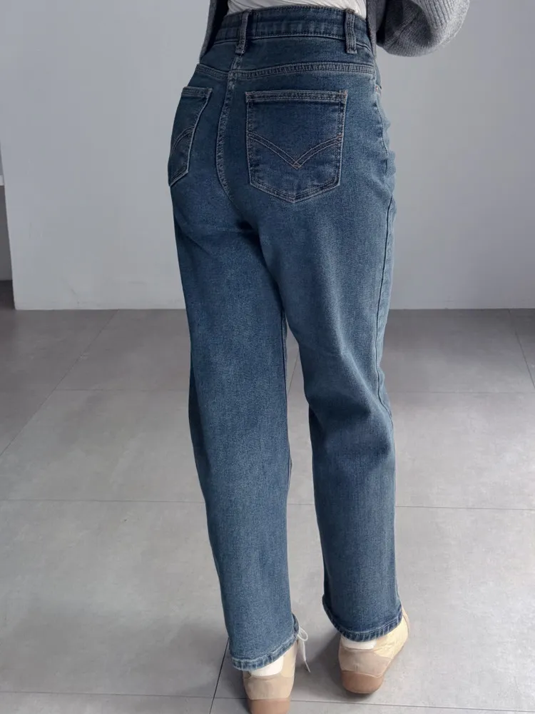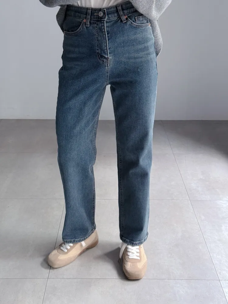 [特點] 內鬆緊彈性腰圍,復古經典深藍丹寧,面料有彈性,修身的直筒剪裁,內磨毛面料。