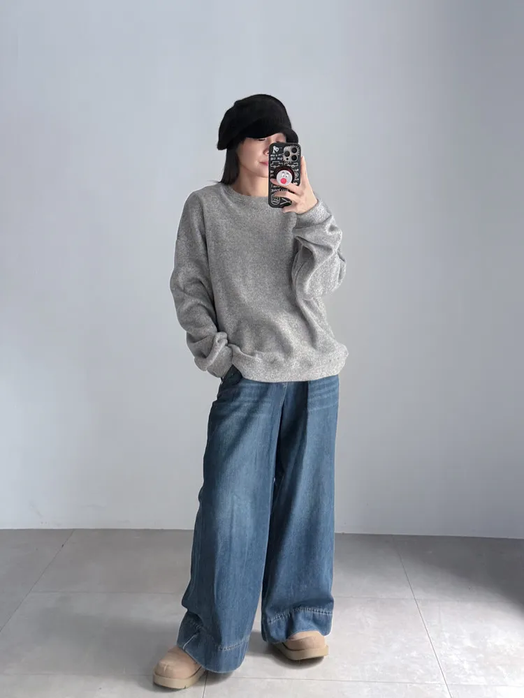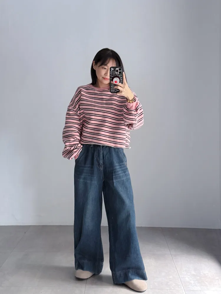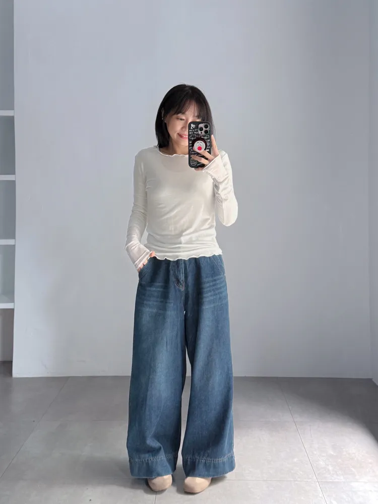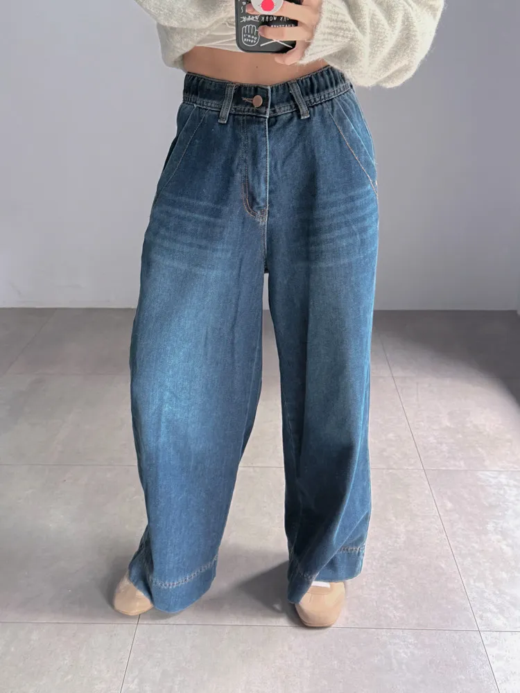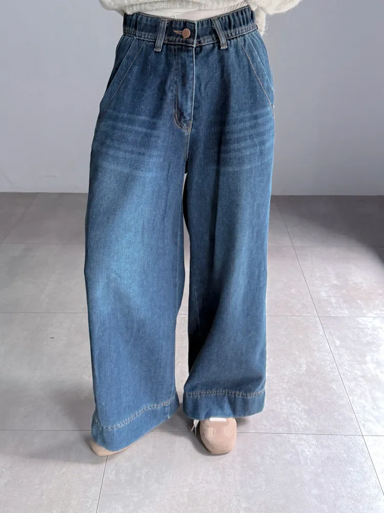 深藍刷色磨毛牛仔寬褲