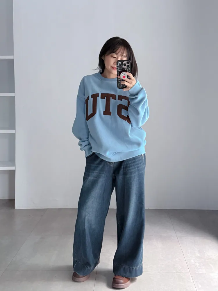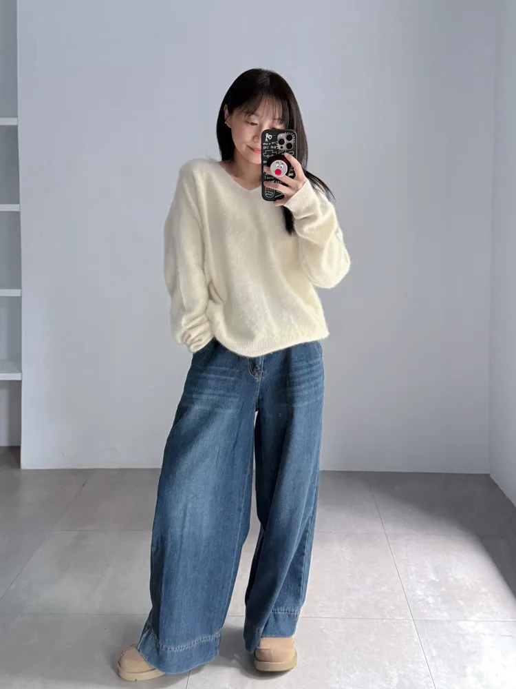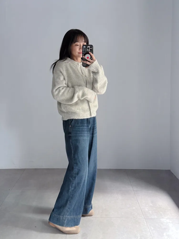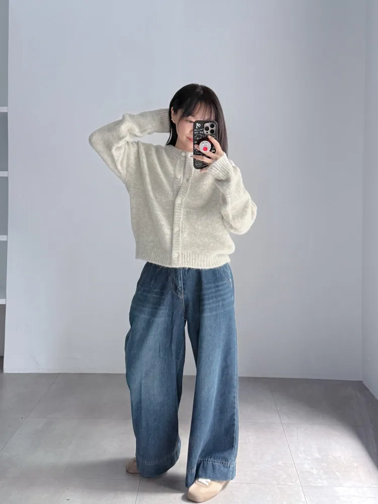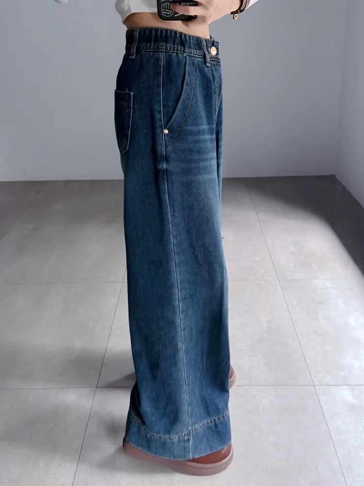 深藍刷色磨毛牛仔寬褲