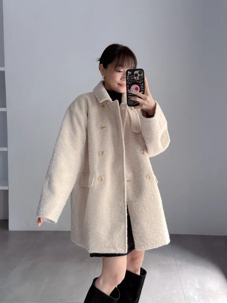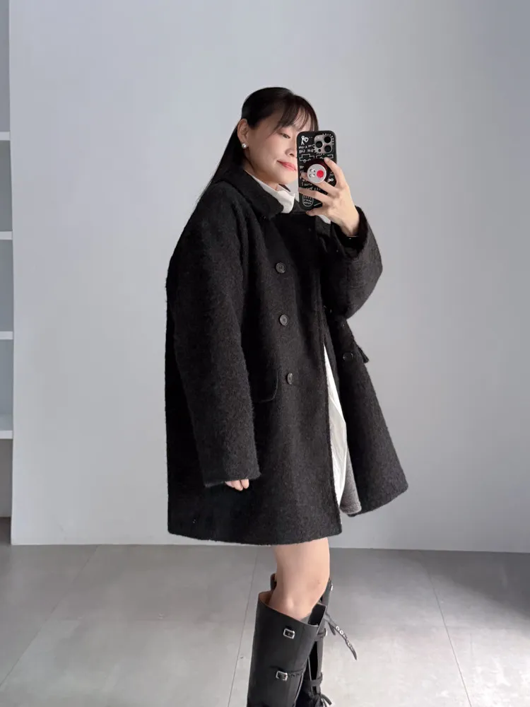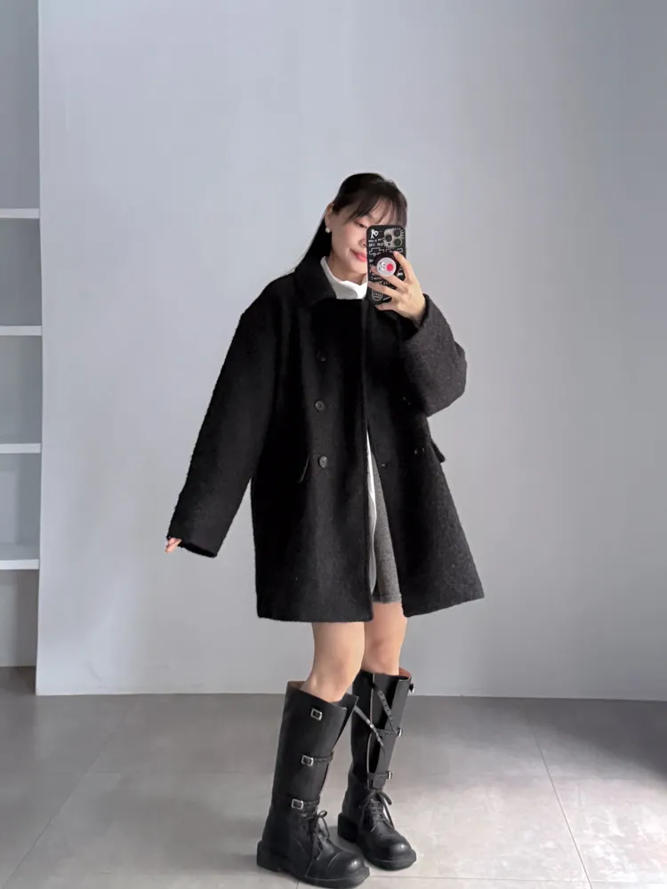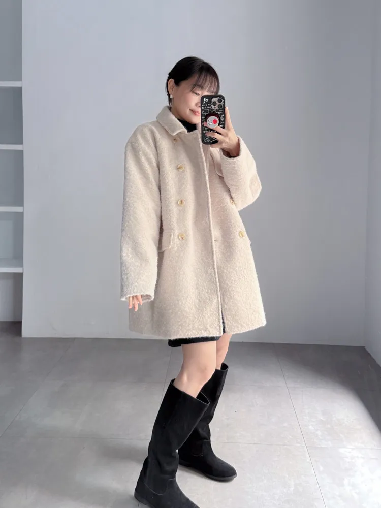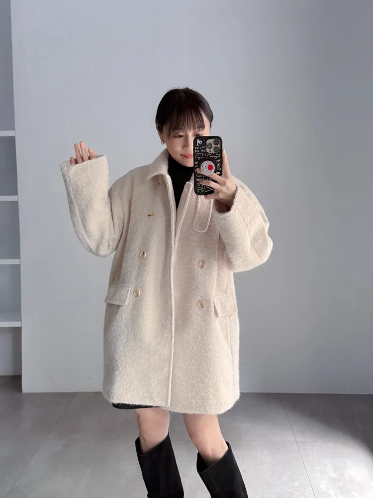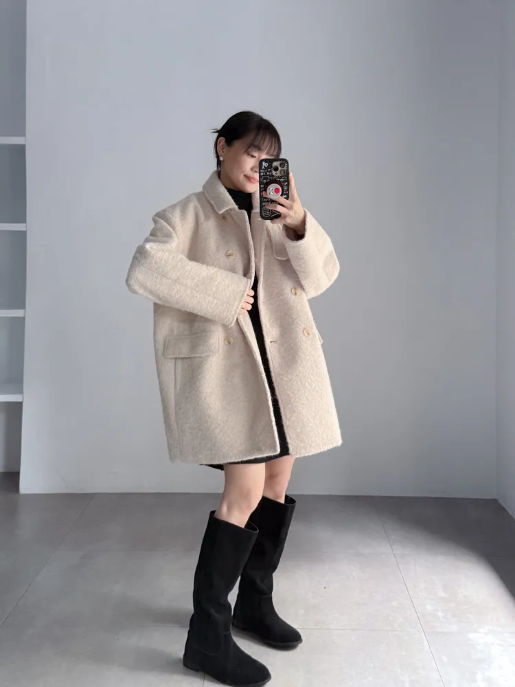 [特點] 表面帶有細緻毛感,有滑面內裡布,保暖度佳、布料挺度適中,雙排釦設計,翻領剪裁。