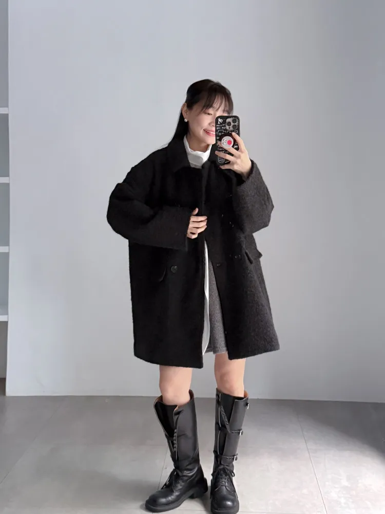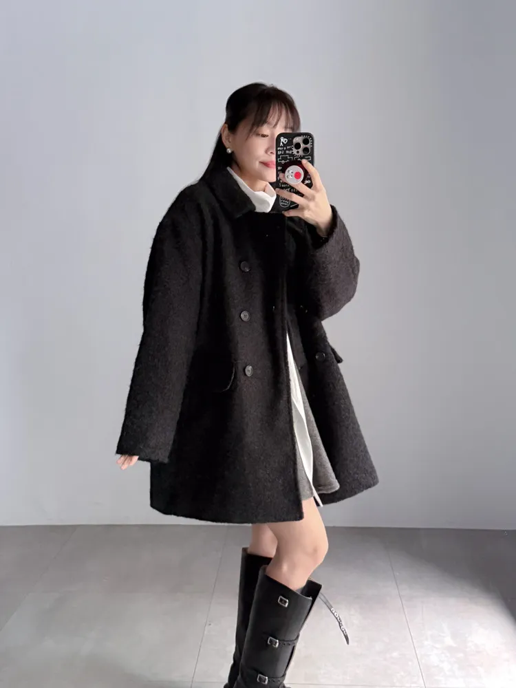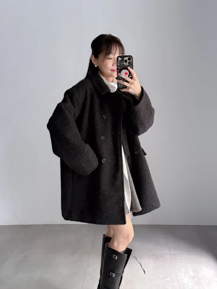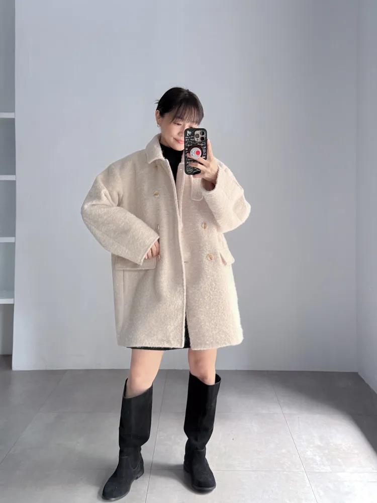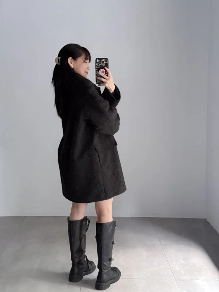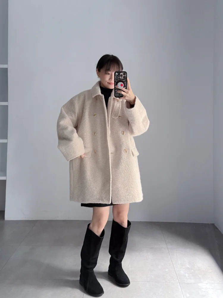 [特點] 表面帶有細緻毛感,有滑面內裡布,保暖度佳、布料挺度適中,雙排釦設計,翻領剪裁。