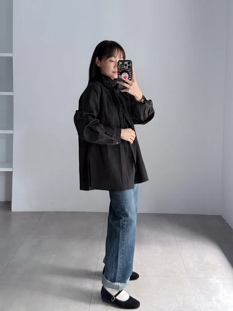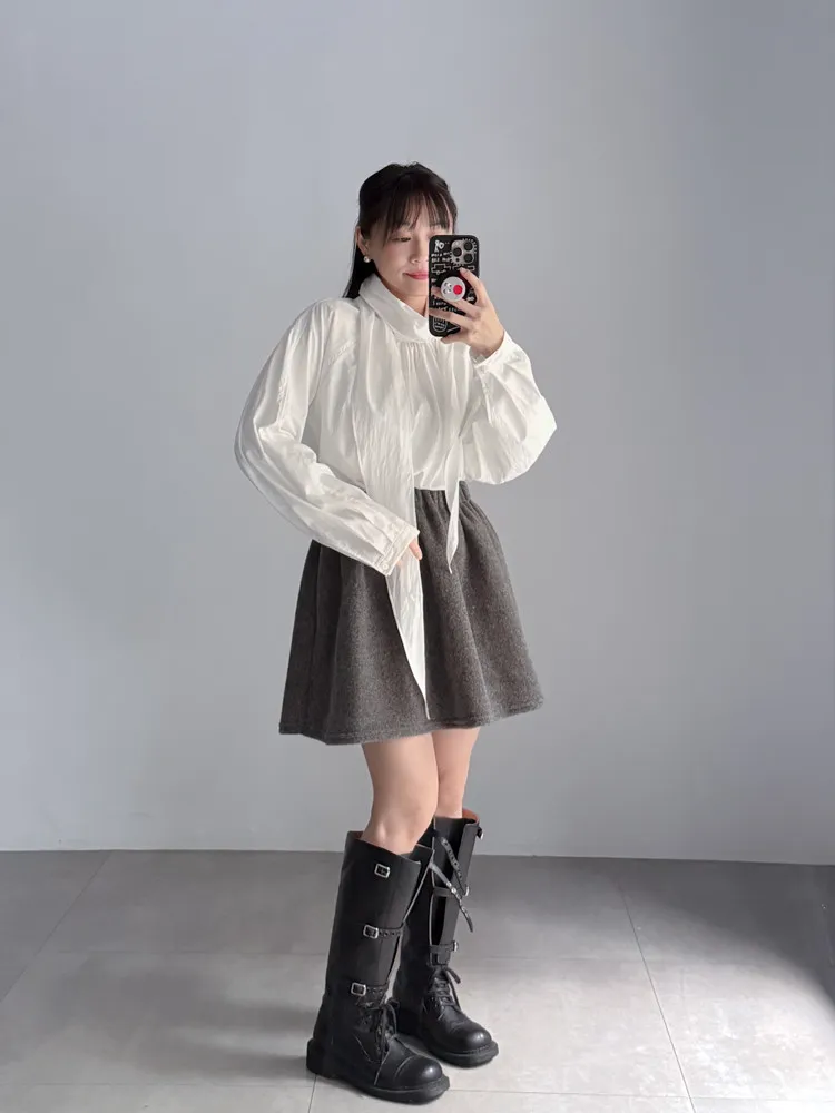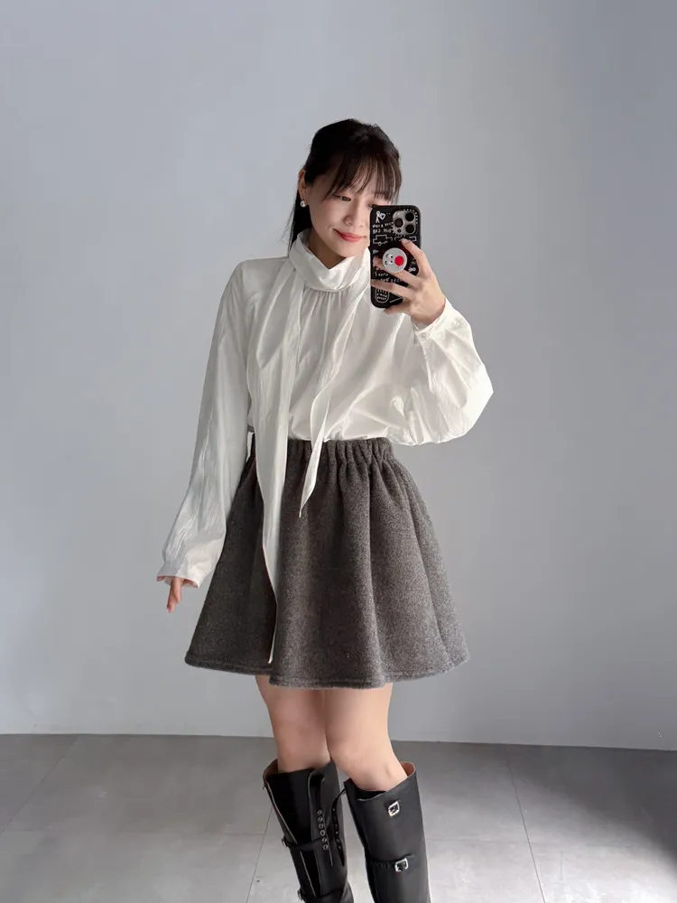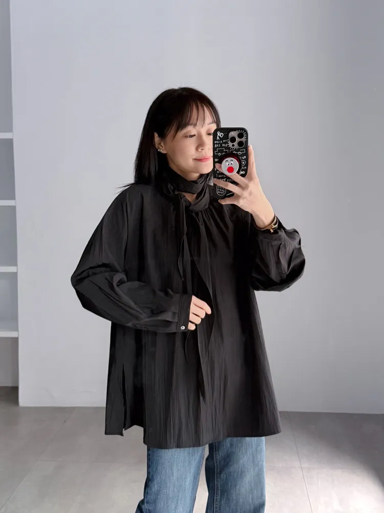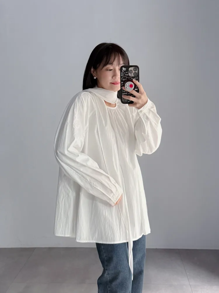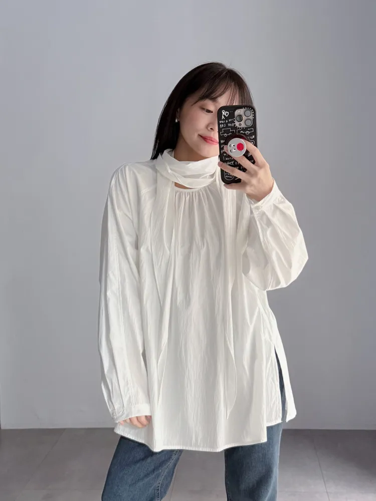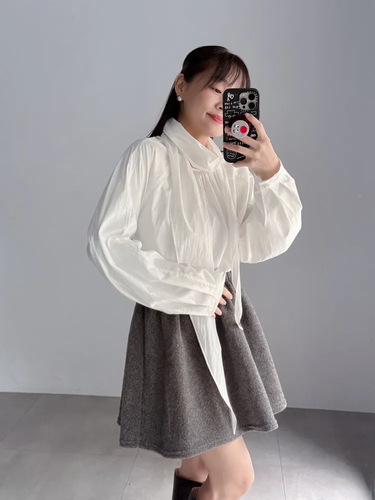 [成份] 聚酯纖維50%、尼龍30%、嫘縈20% [特點] 無肩線設計,寬袖+傘擺剪裁,滑料薄襯衫手感,附領巾,可跟各式上衣層次疊搭。 [洗滌建議] 衣料含嫘縈成份,該材質在水中強度會變弱,為避免縮水,建議乾洗。