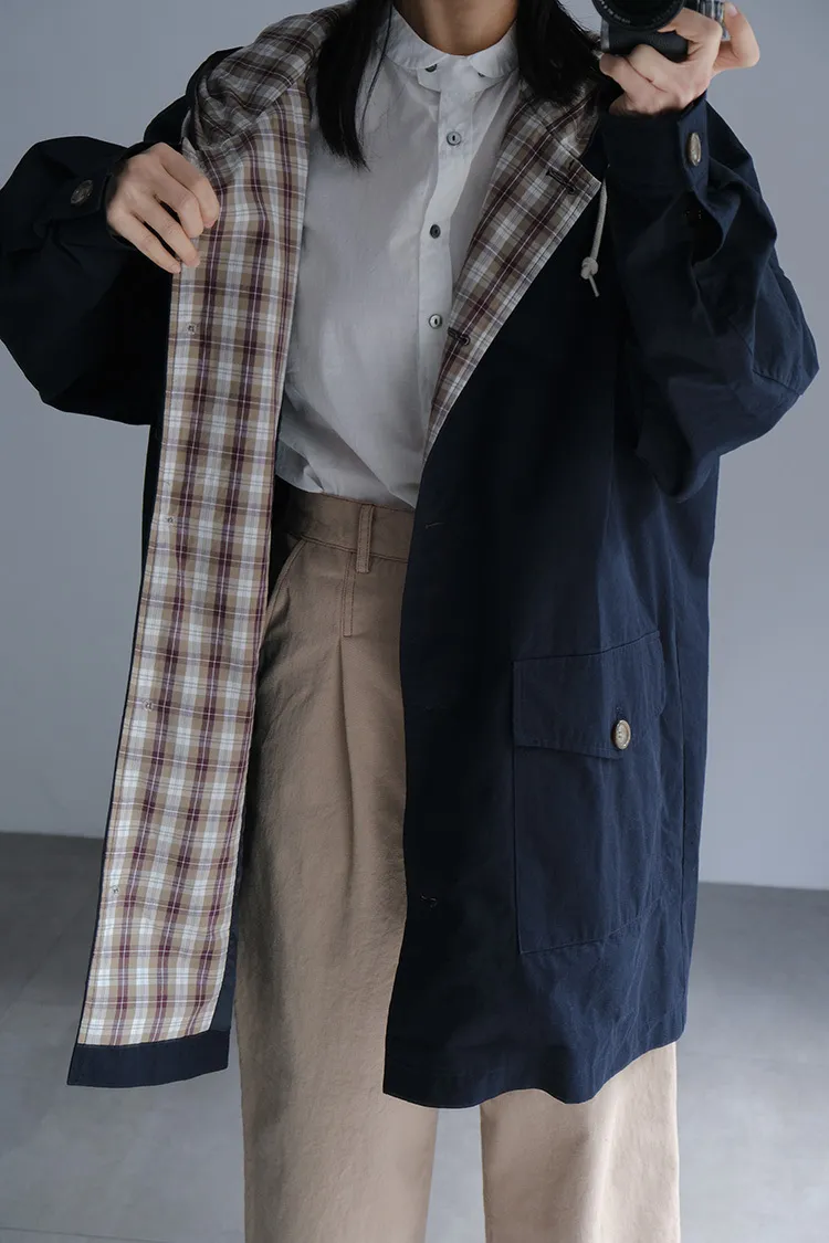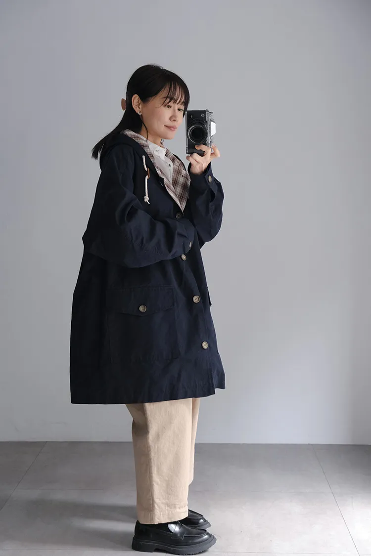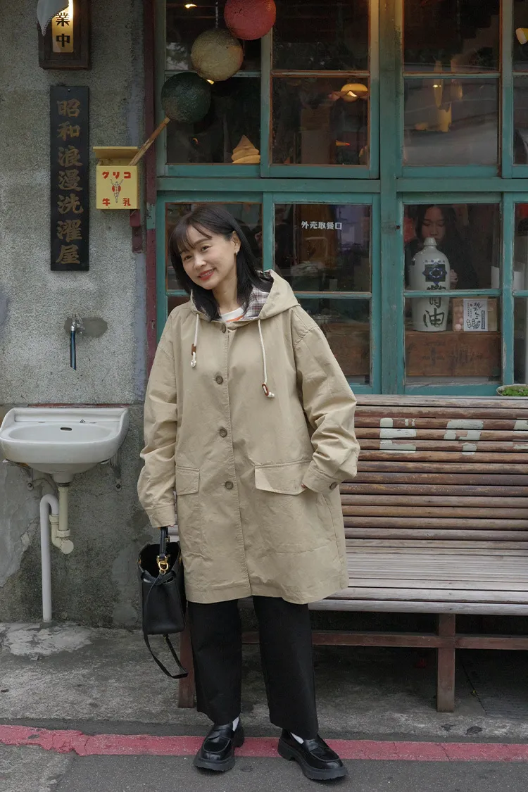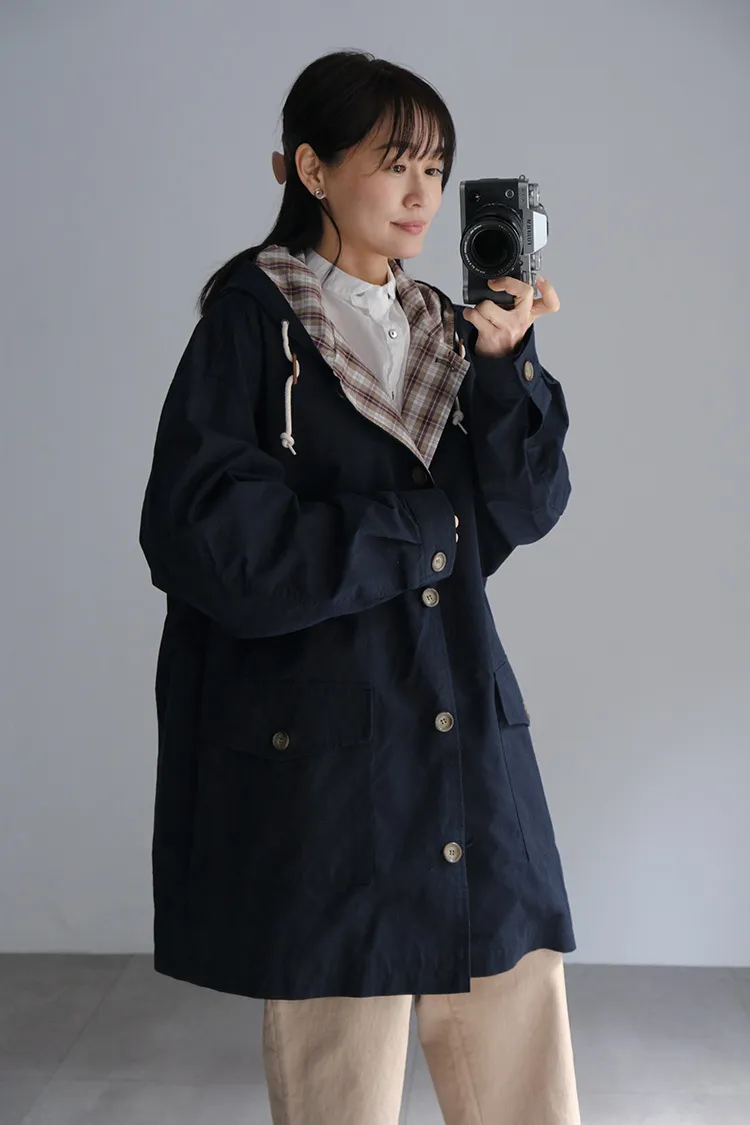 [特點] 落肩寬鬆感+連帽剪裁,排釦設計穿脫,連帽、排釦處的布面採用格紋面料設計,抽繩有小皮標造型固定。