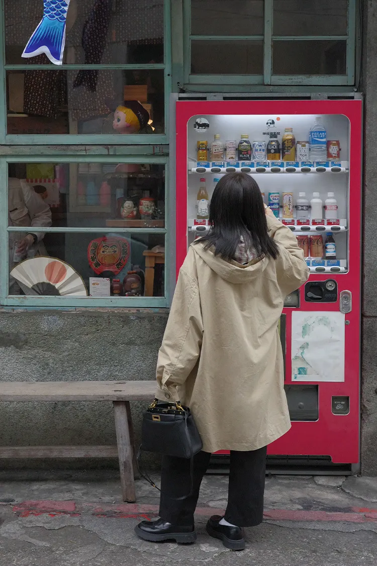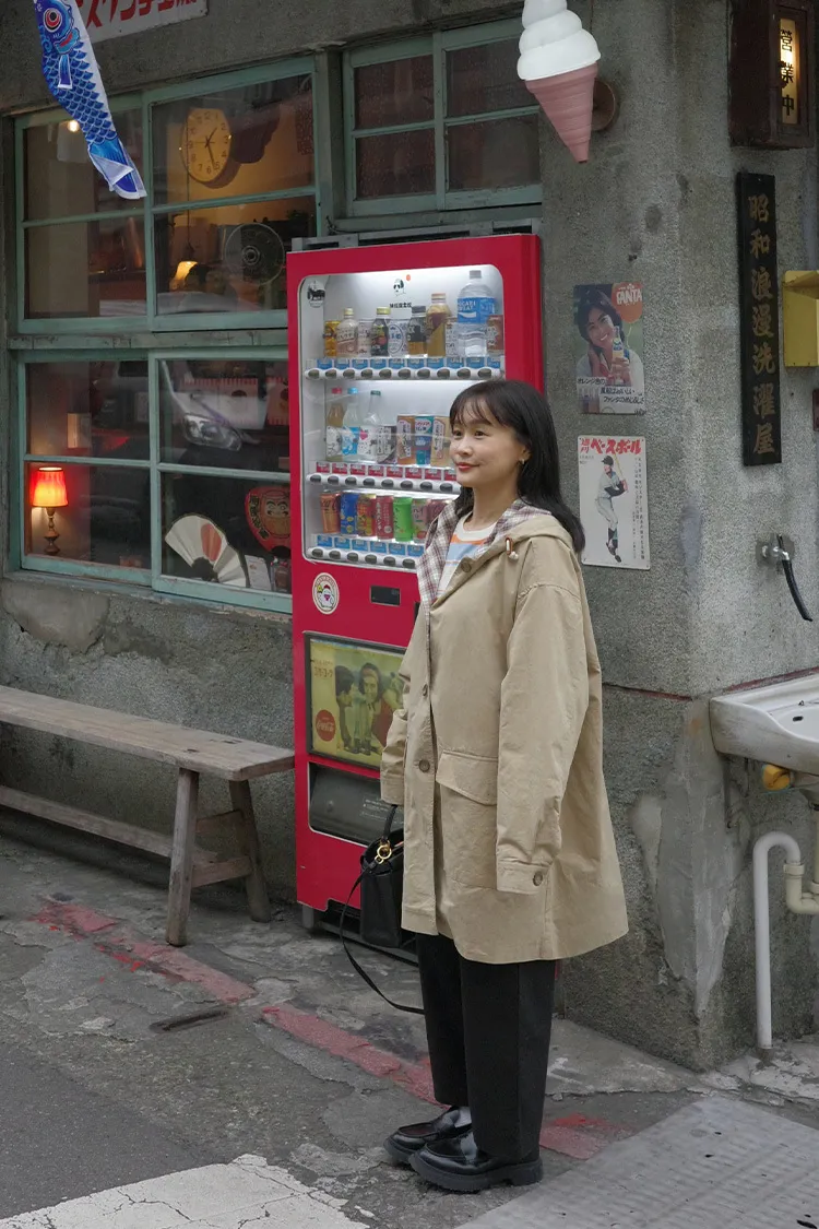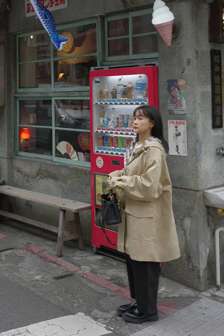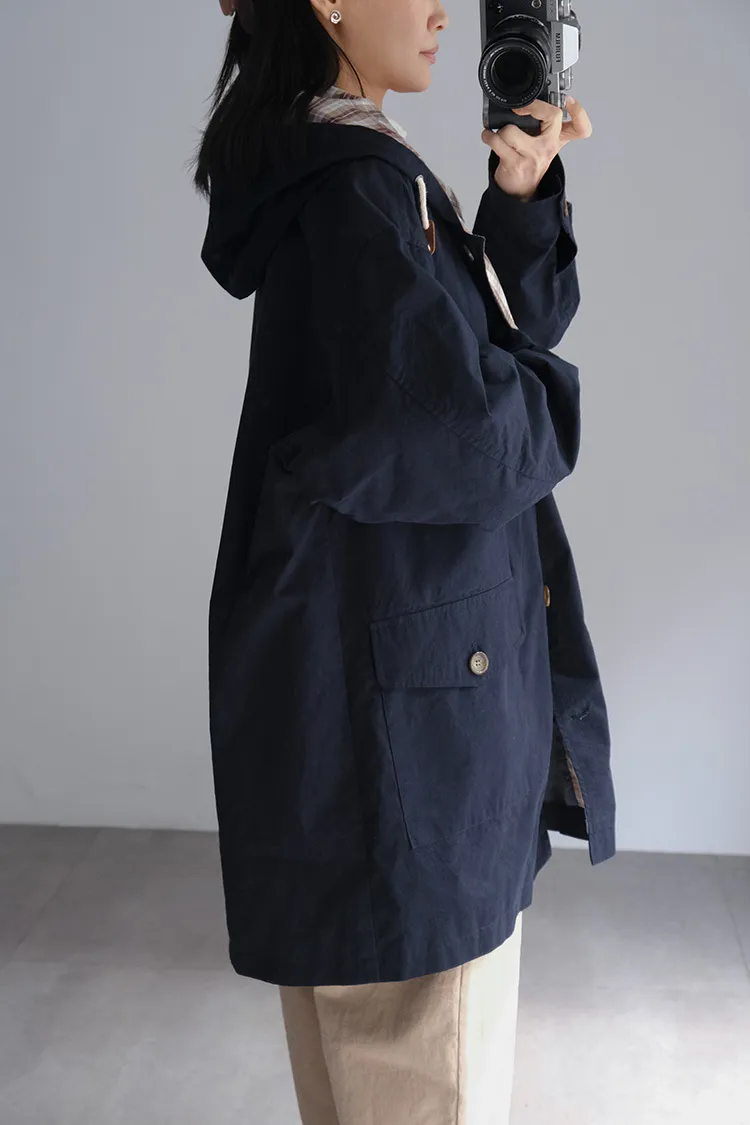 [特點] 落肩寬鬆感+連帽剪裁,排釦設計穿脫,連帽、排釦處的布面採用格紋面料設計,抽繩有小皮標造型固定。