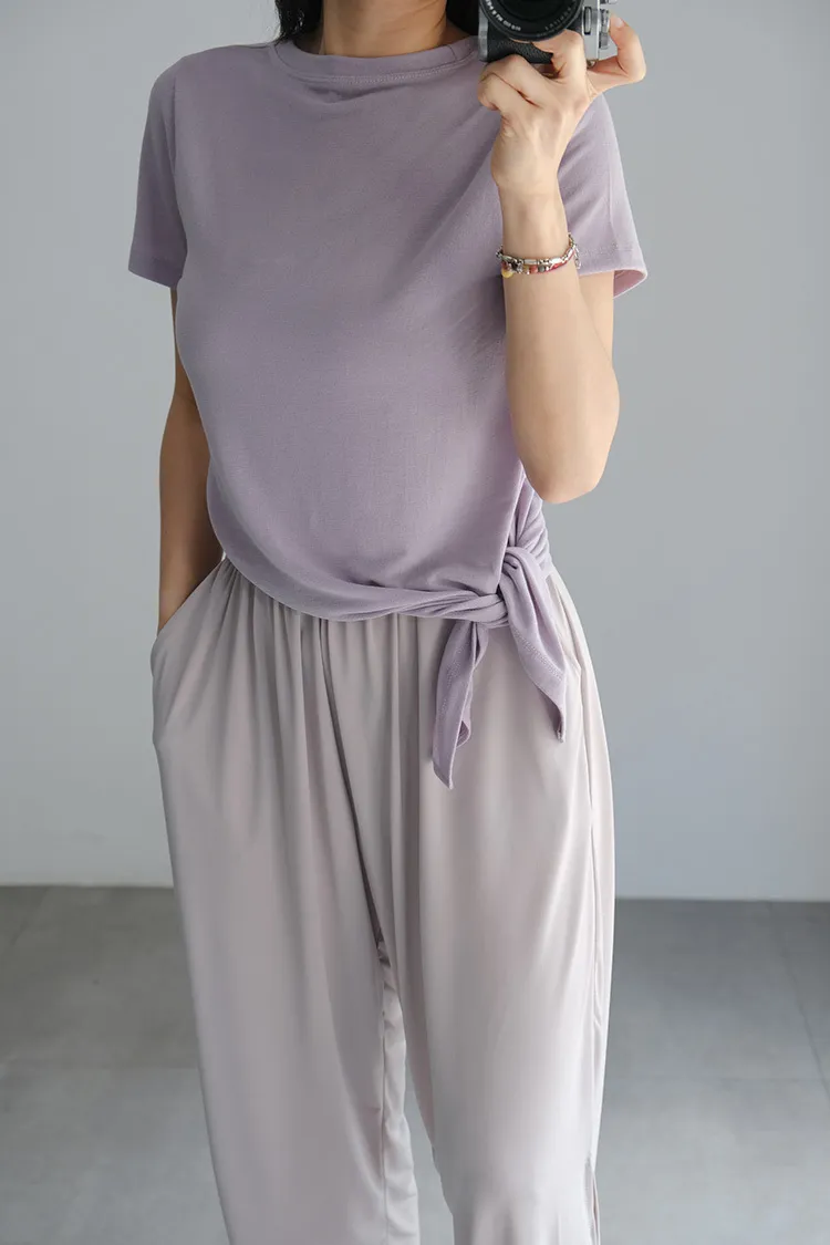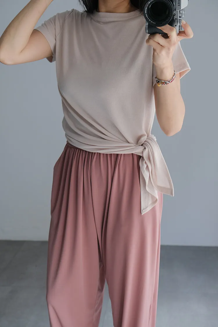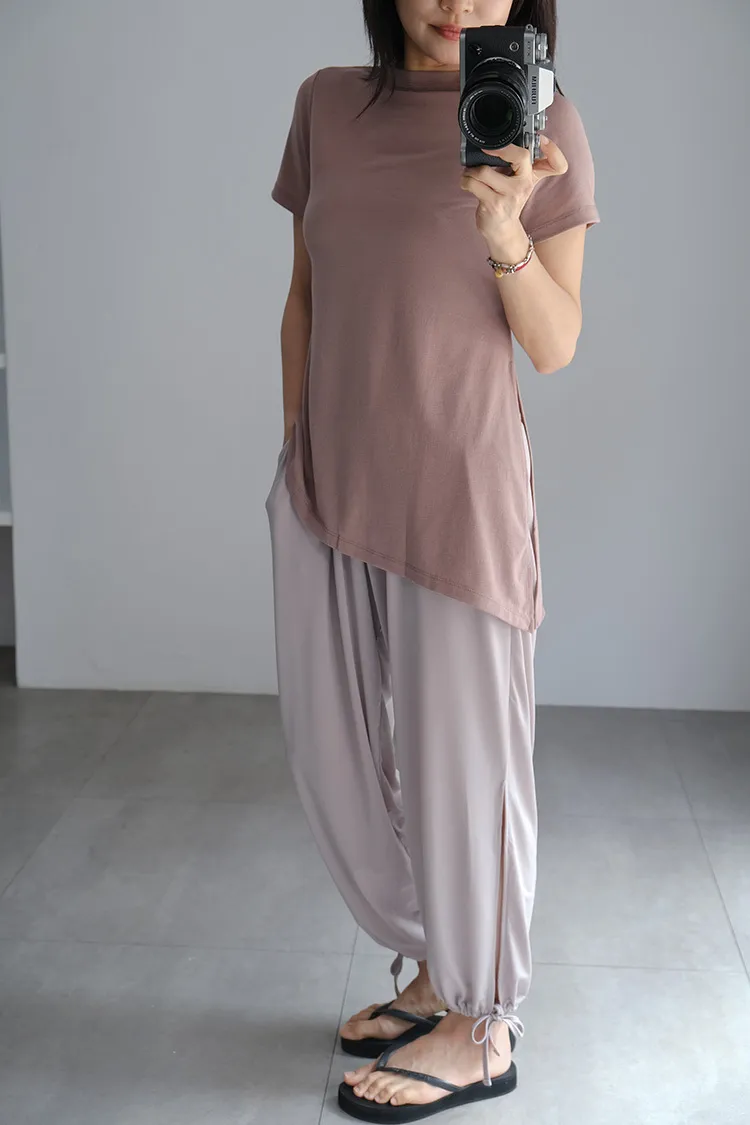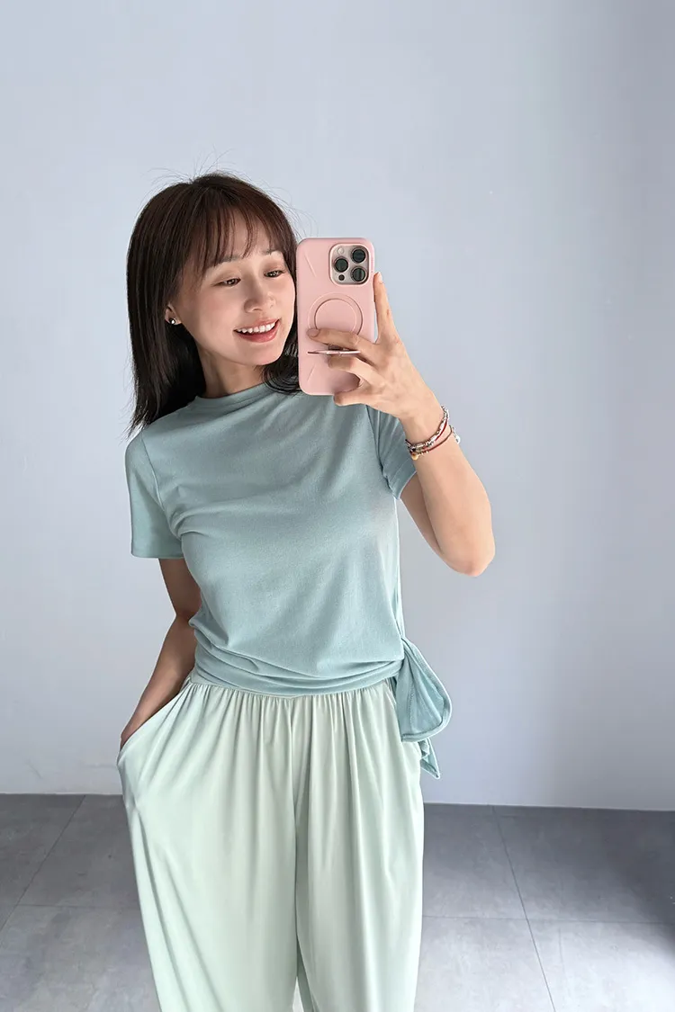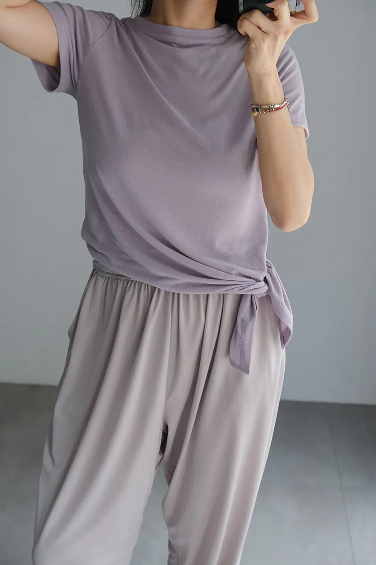 長版時可遮蓋臀部,瑜伽練習活動時可側綁單結,固定下擺。