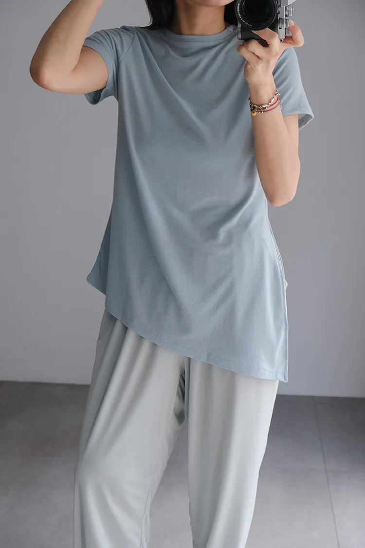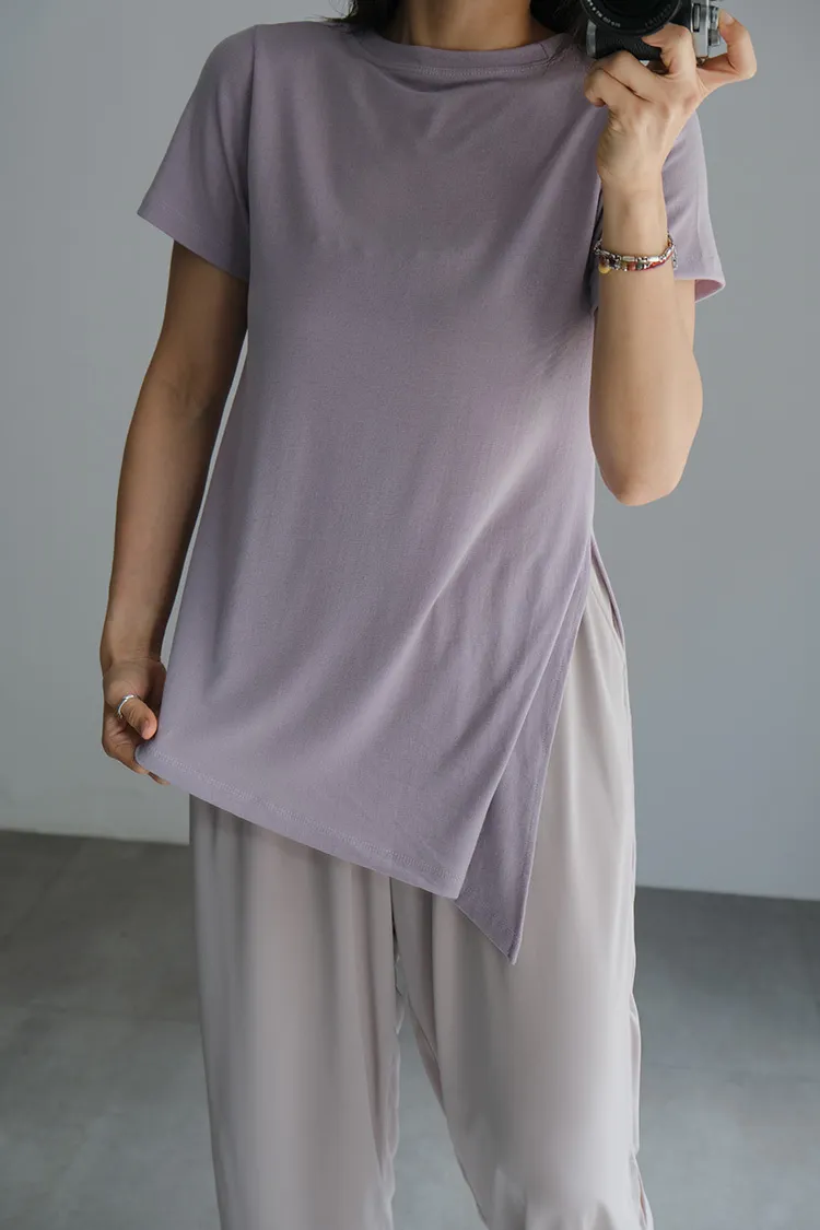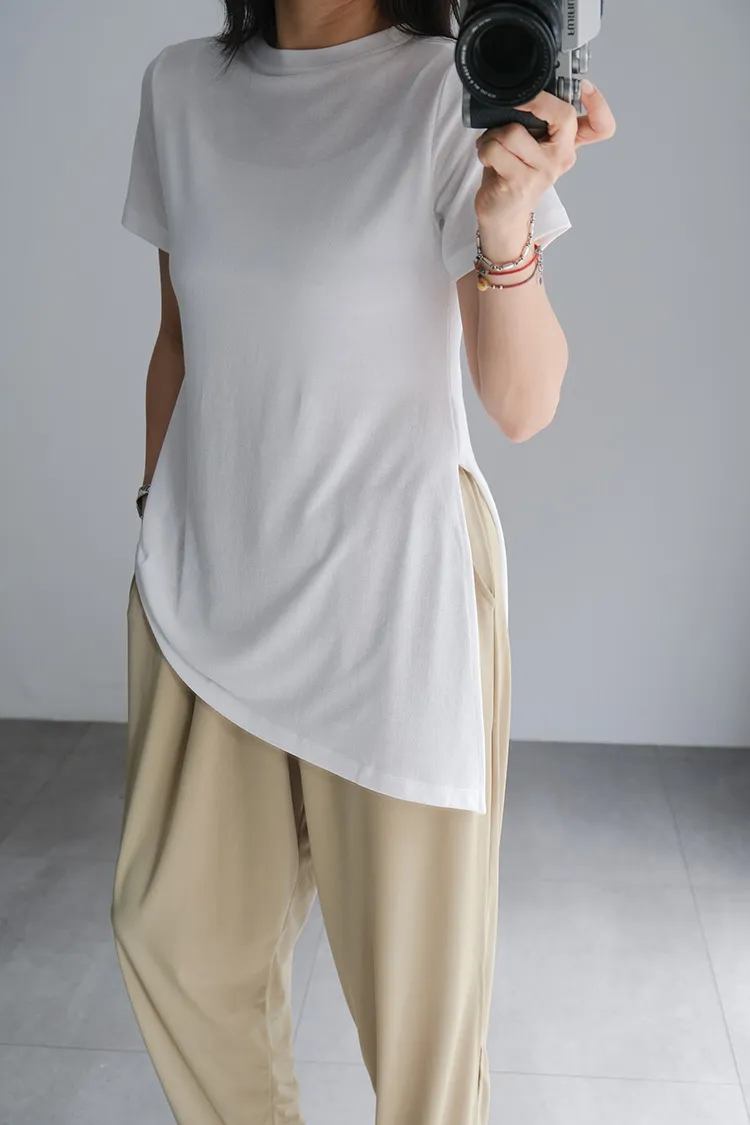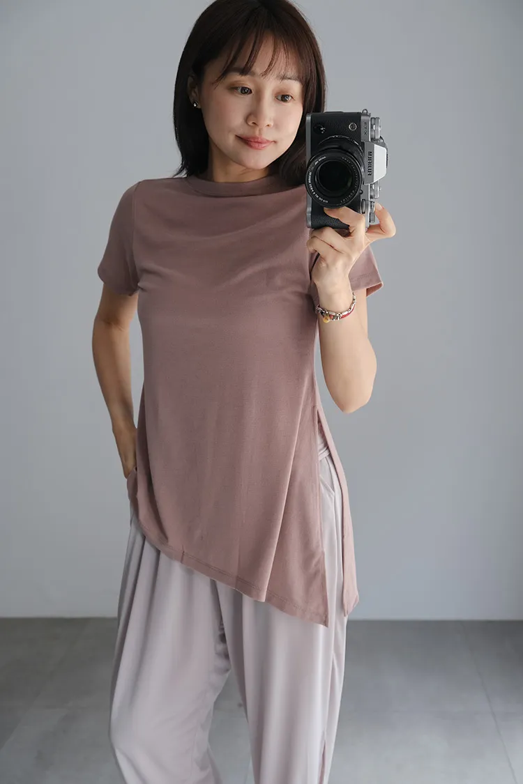 [特點] 面料親膚彈力佳,長版斜切剪裁、側開衩設計