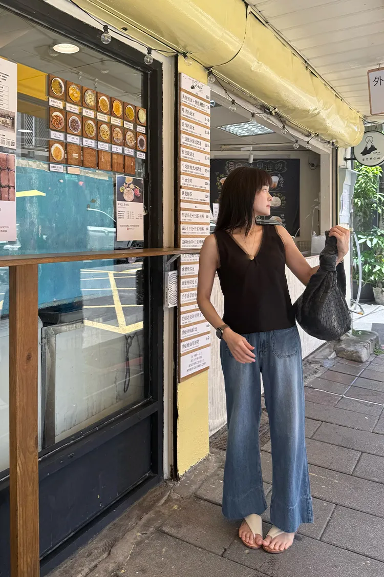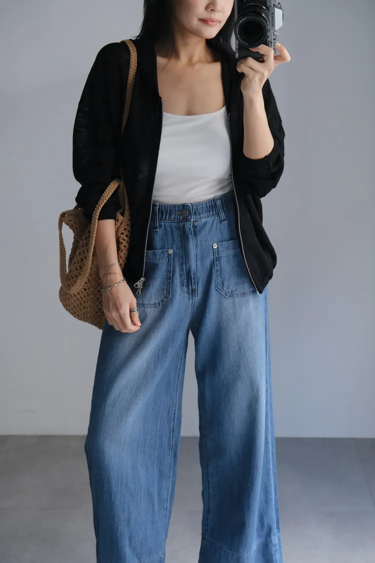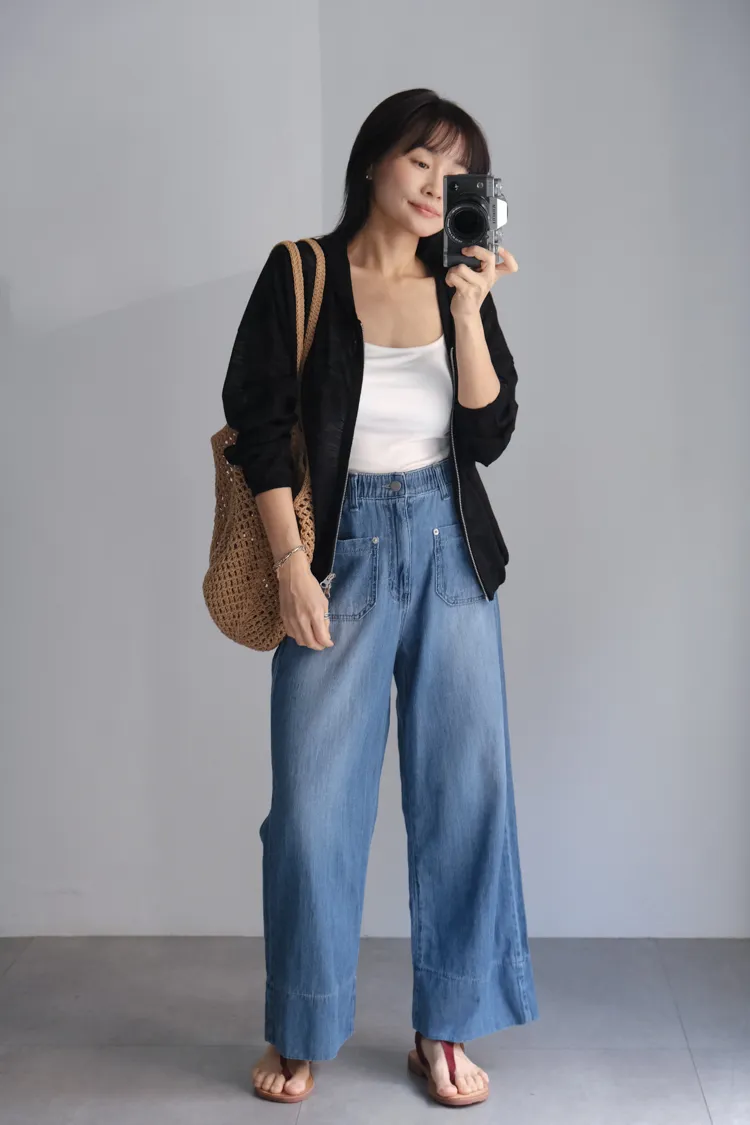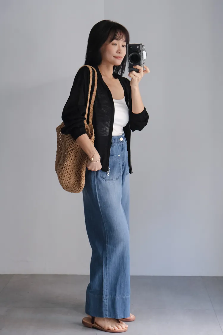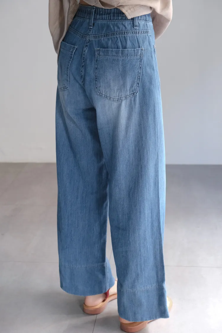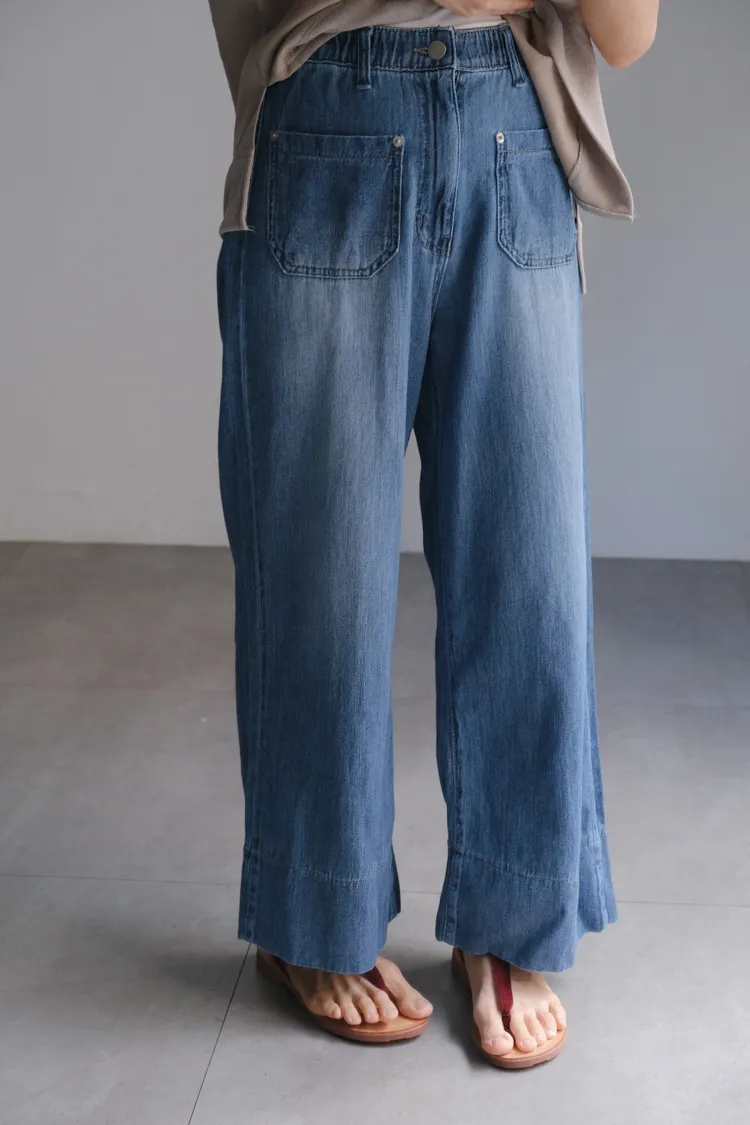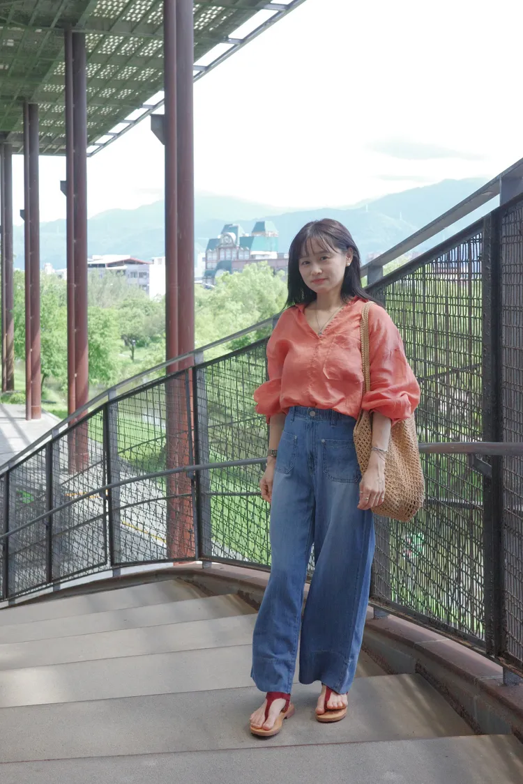雙口袋設計,薄料丹寧適合夏天穿、柔軟中帶一點挺度、無彈性。