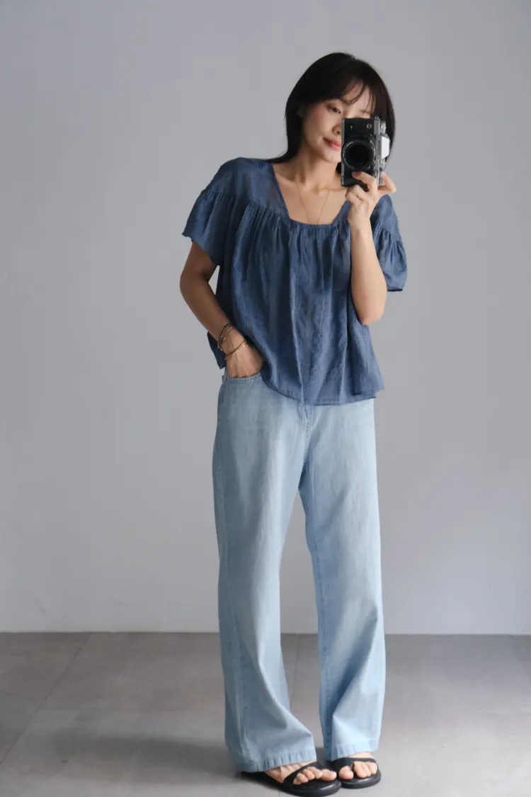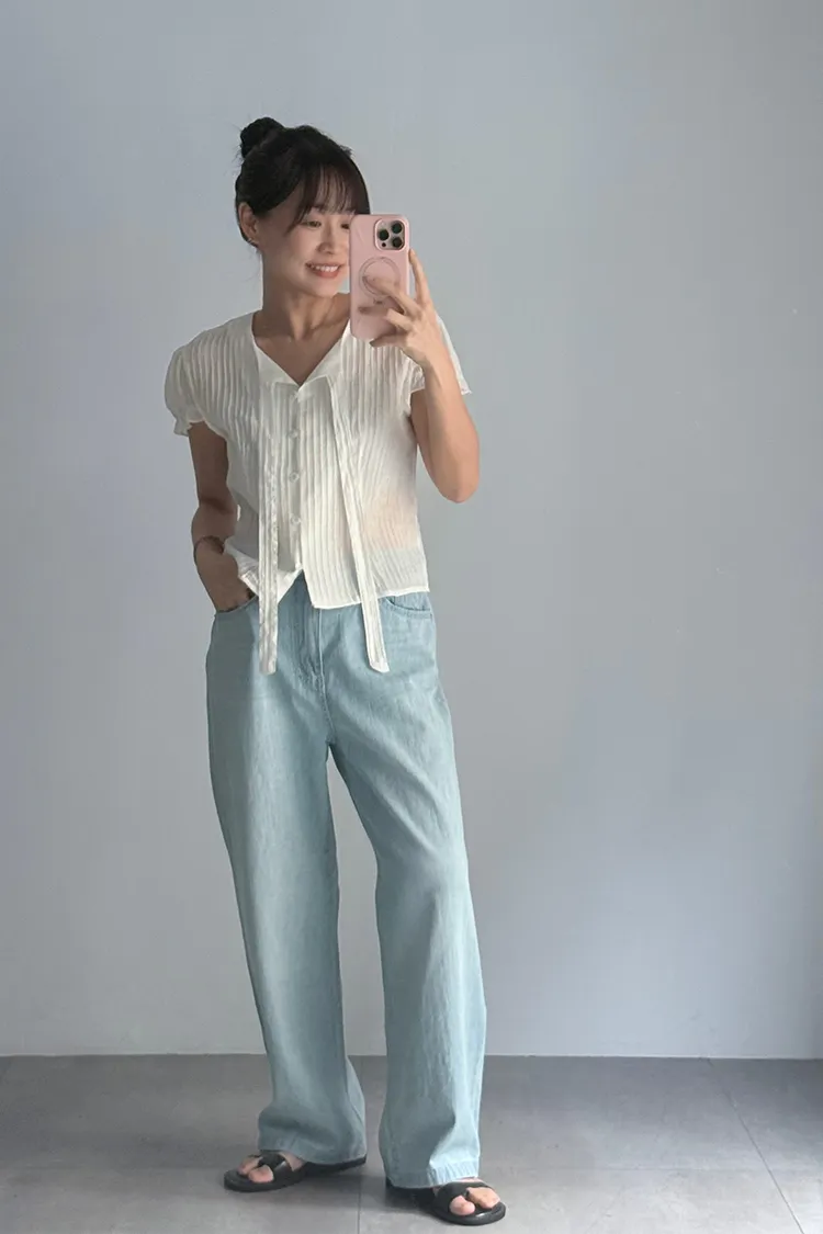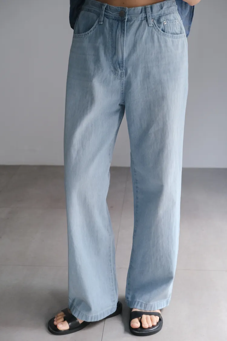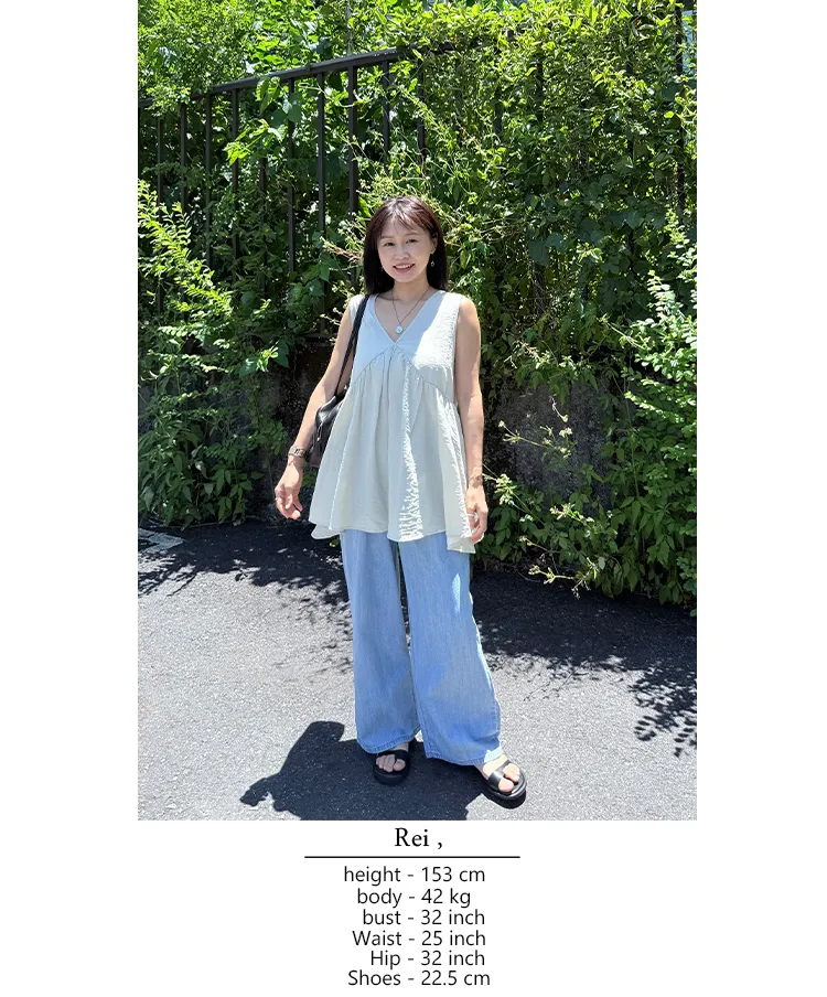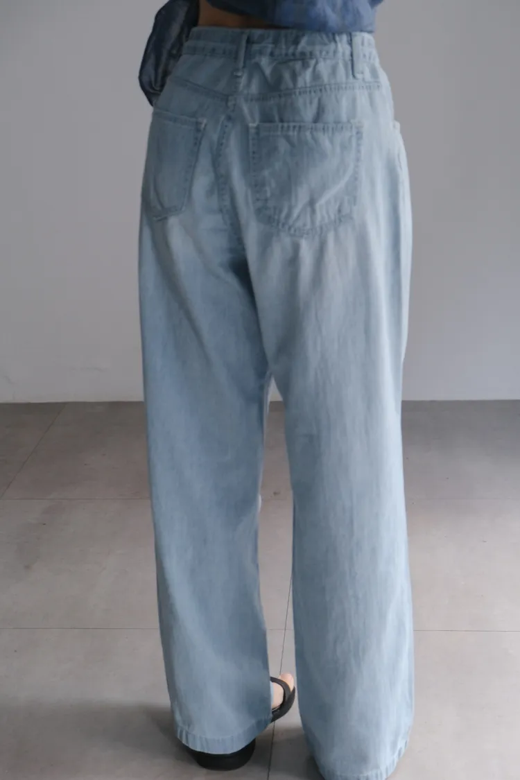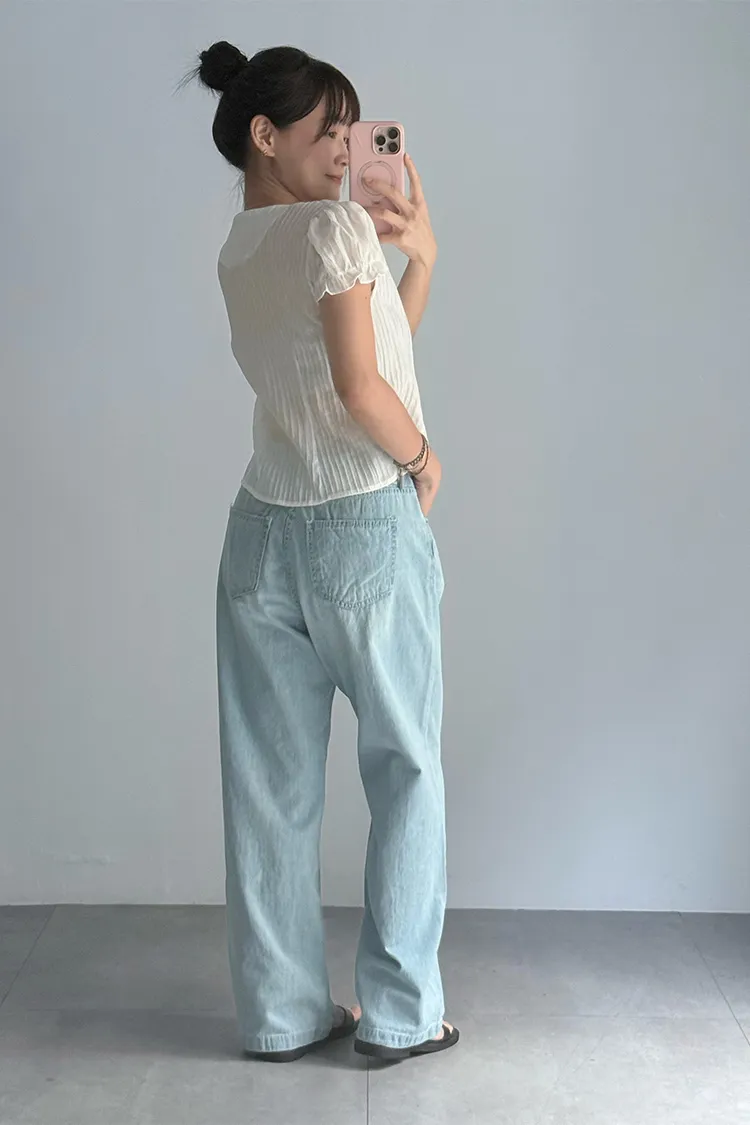 [特點] 丹寧布料無彈性,鬆緊彈性腰圍,淺藍刷色,厚薄度適合夏天。