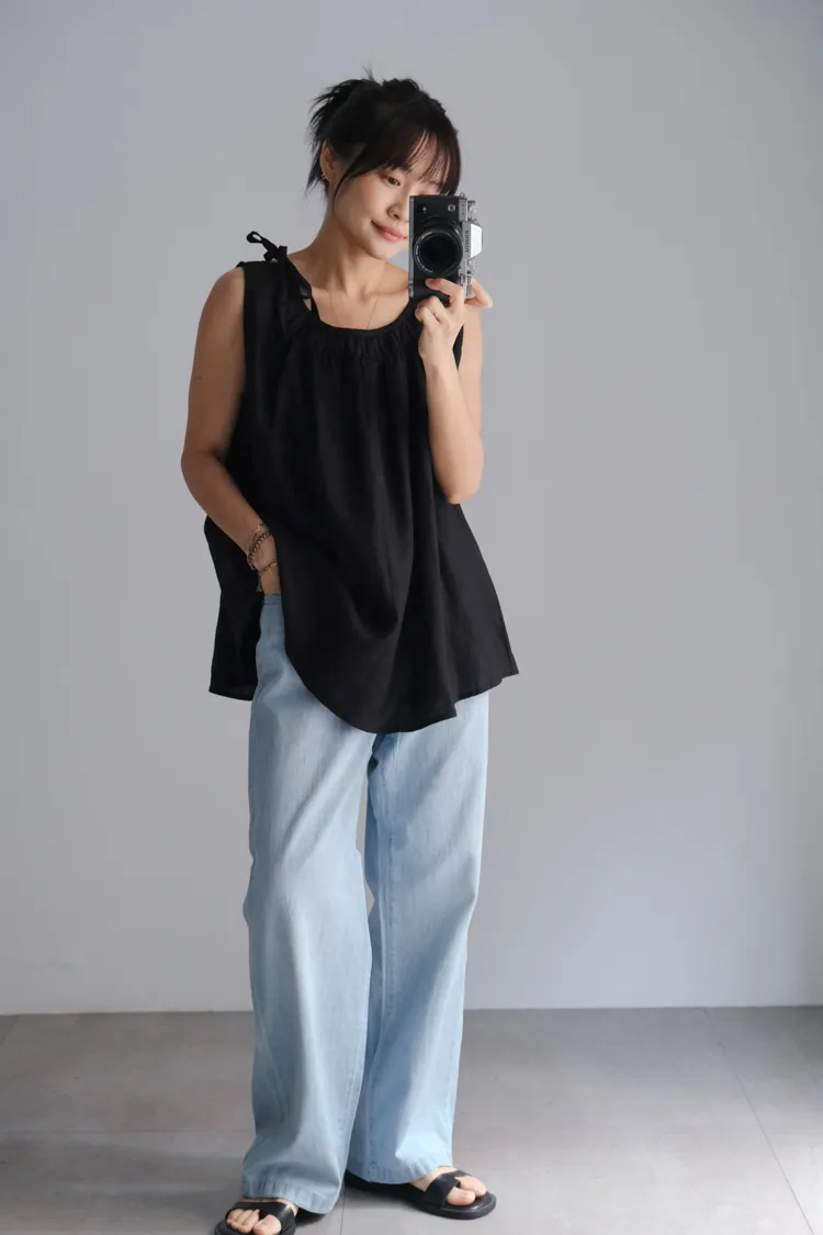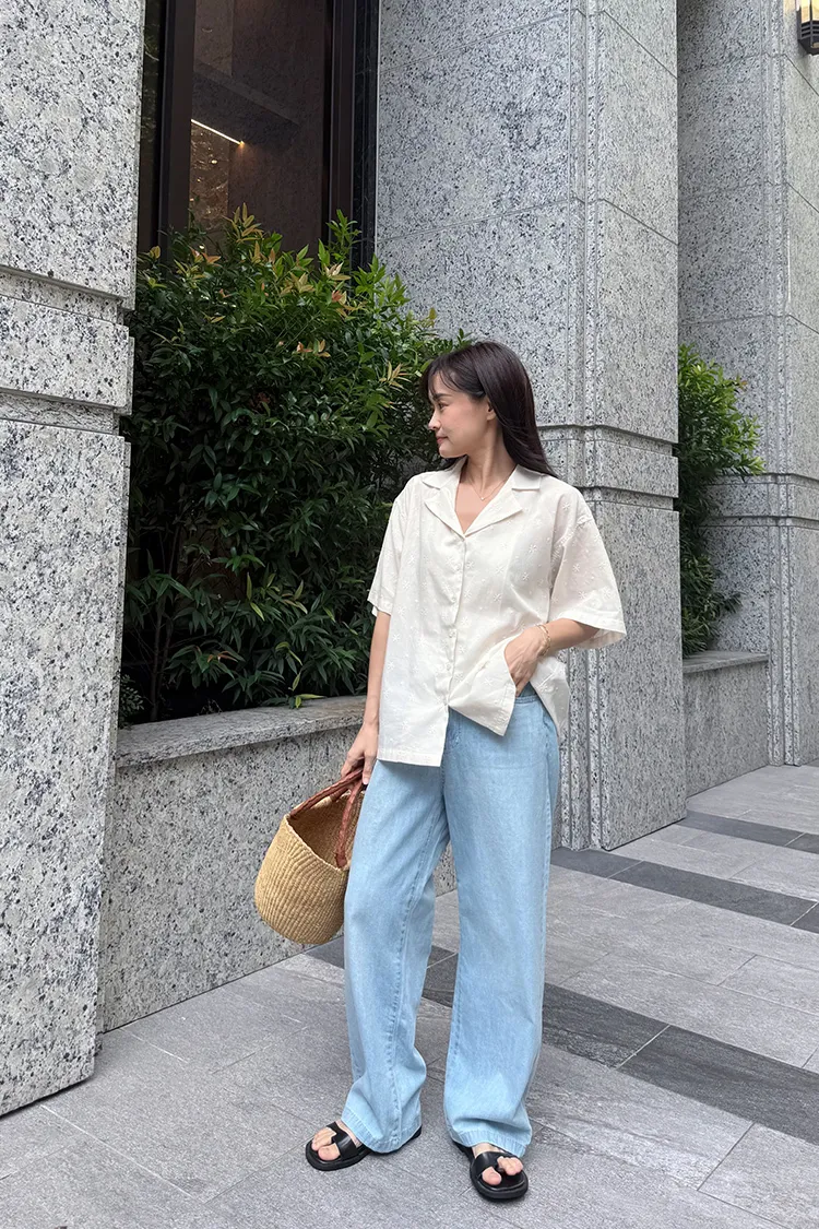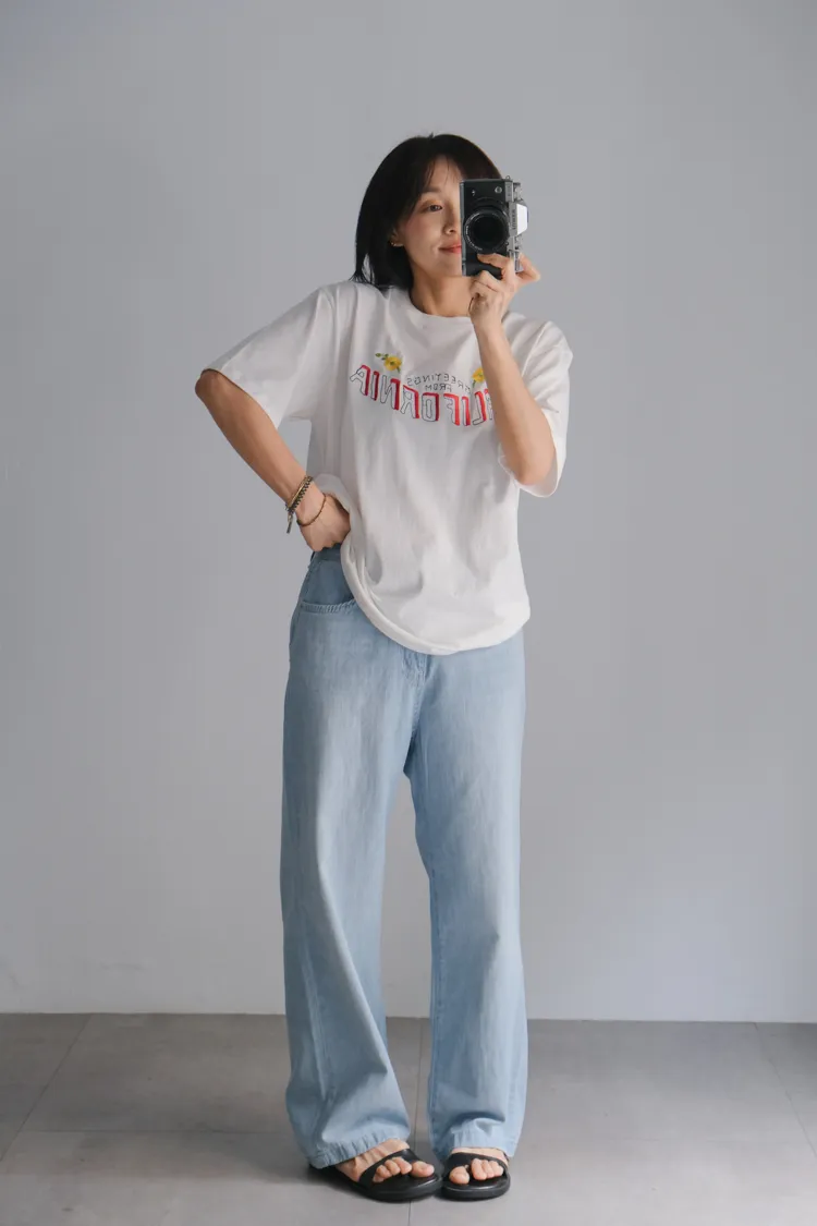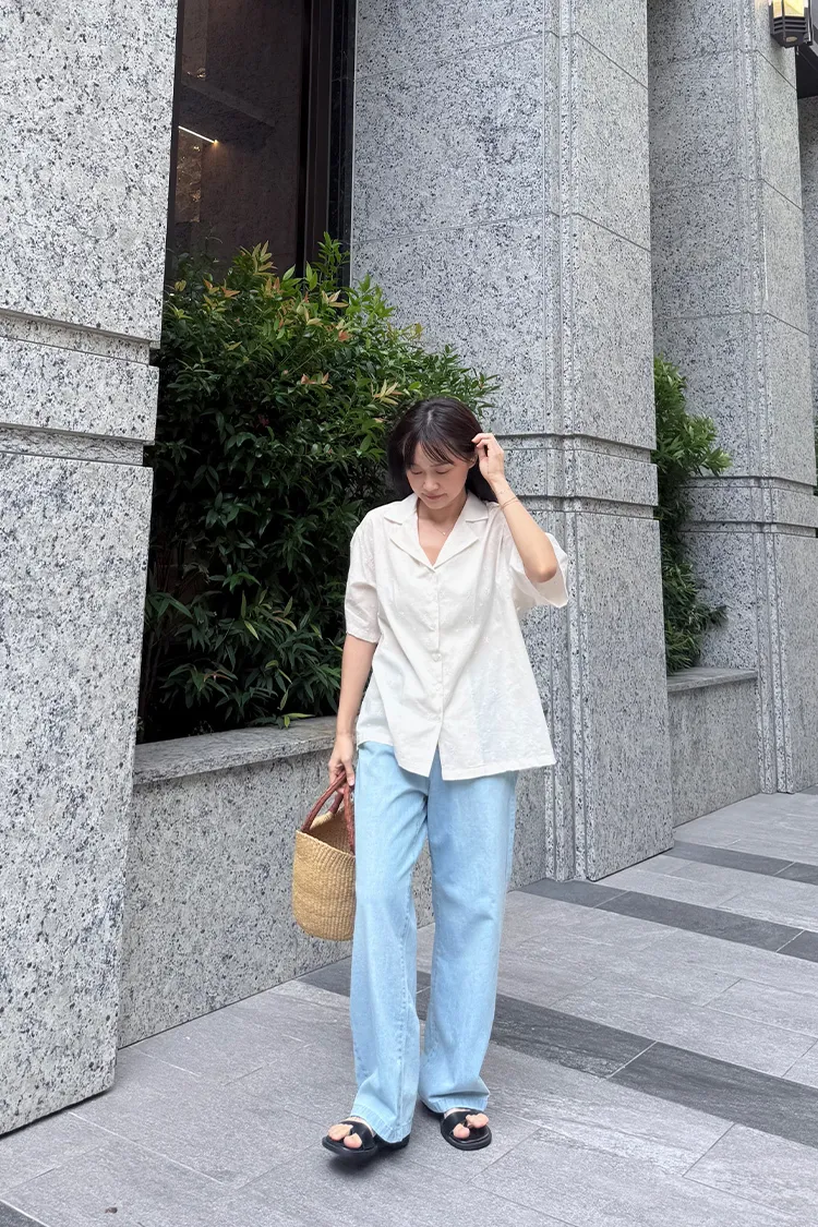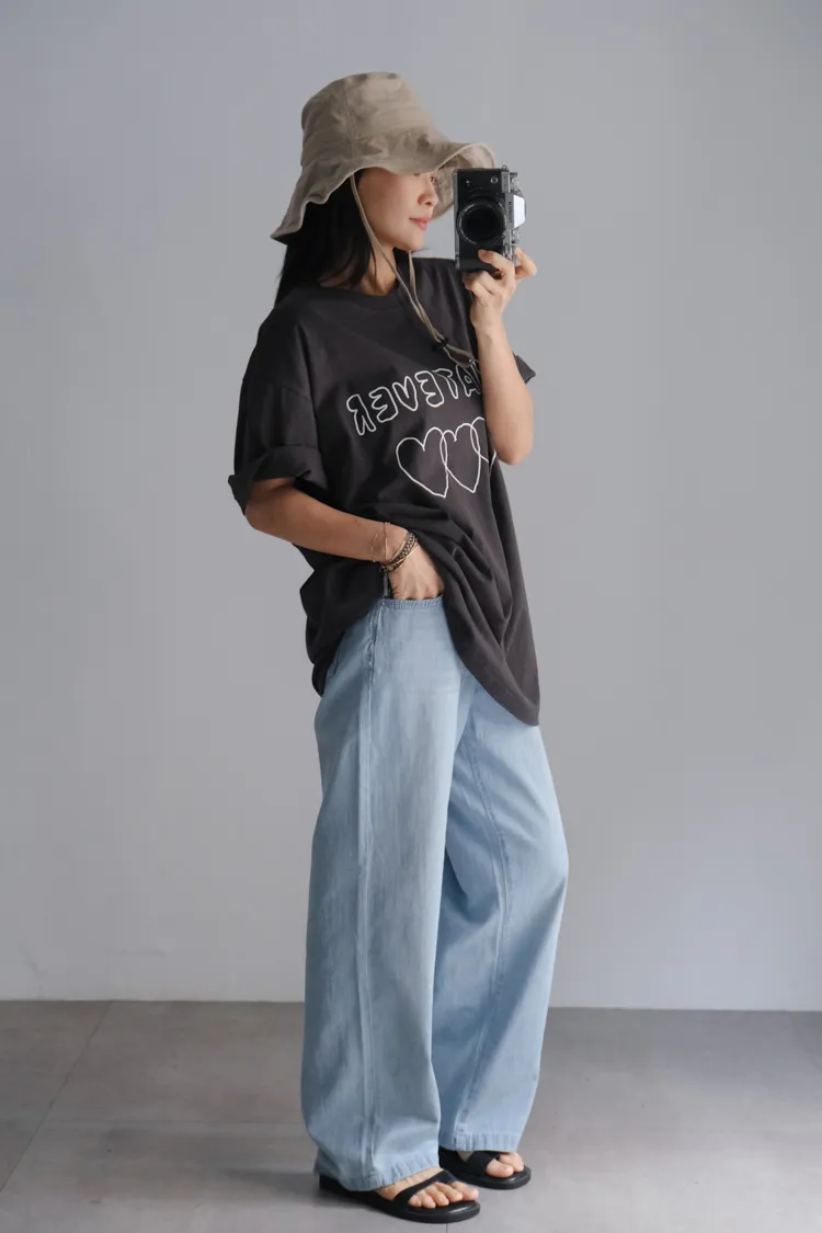 [特點] 丹寧布料無彈性,鬆緊彈性腰圍,淺藍刷色,厚薄度適合夏天。