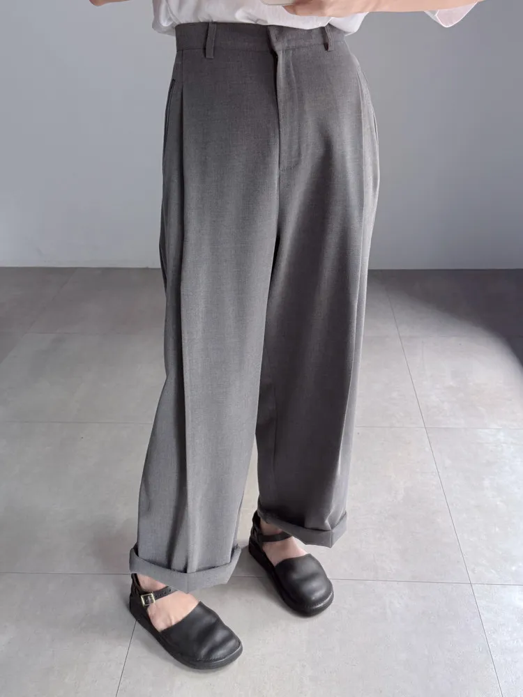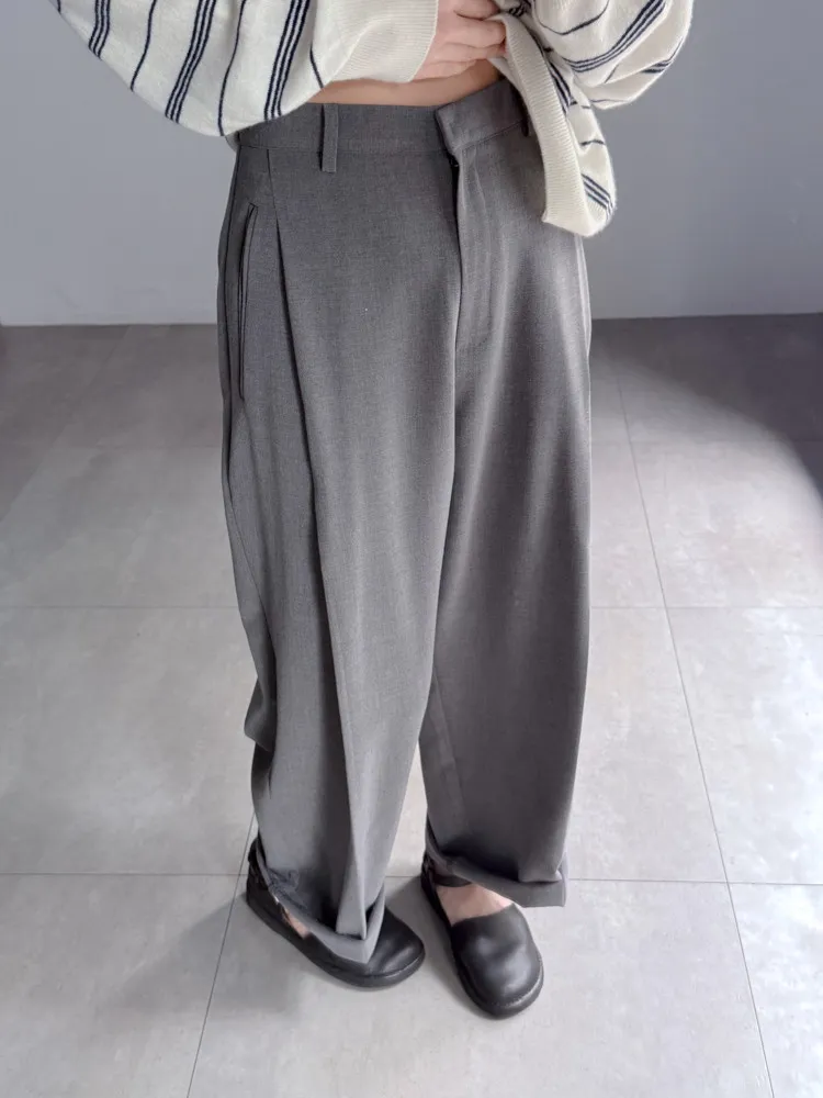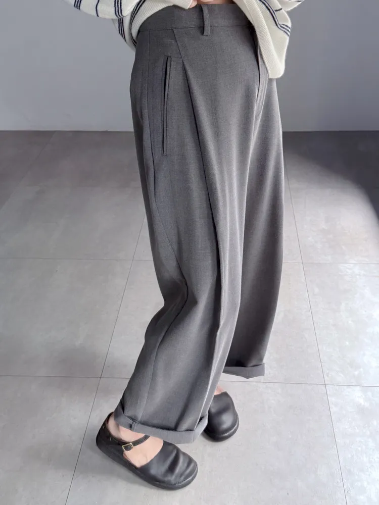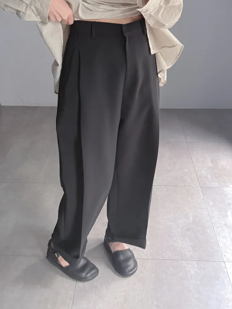 [成份] 聚酯纖維65%、嫘縈30%、彈性纖維5% [特點] 前打摺設計,寬老爺褲型,面料柔軟親膚,布料帶有然垂墜感,兩色布料摸起來手感略有不同。 [洗滌建議] 衣料含嫘縈成份,該材質在水中強度會變弱,為避免縮水,建議乾洗。
