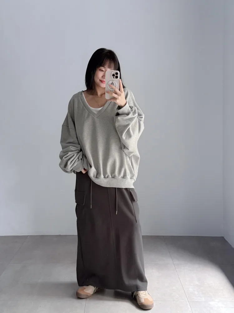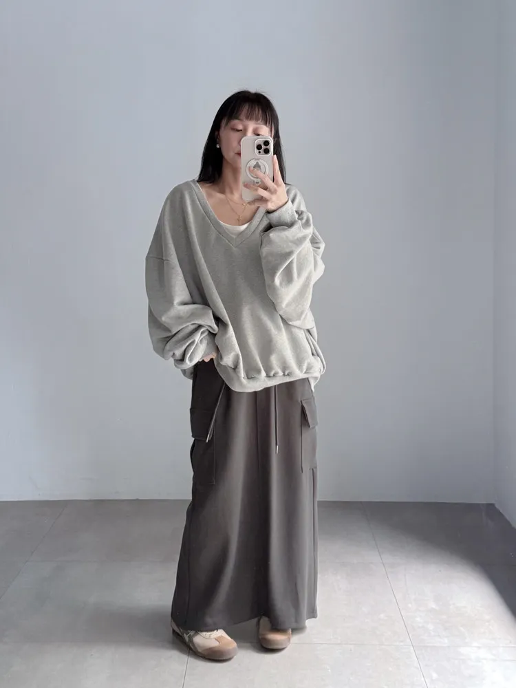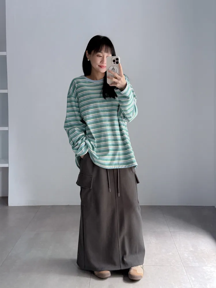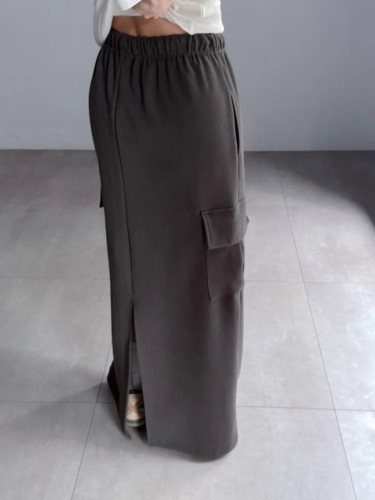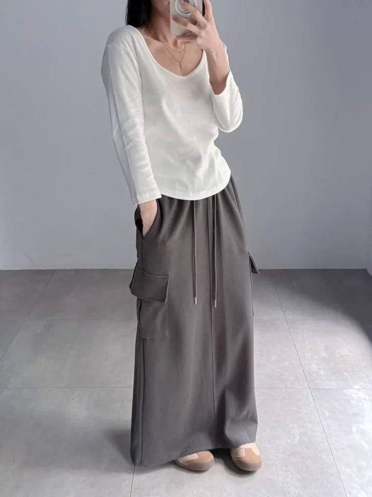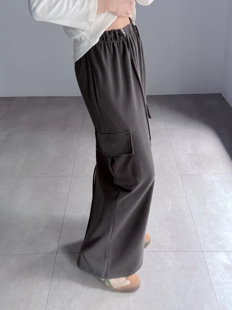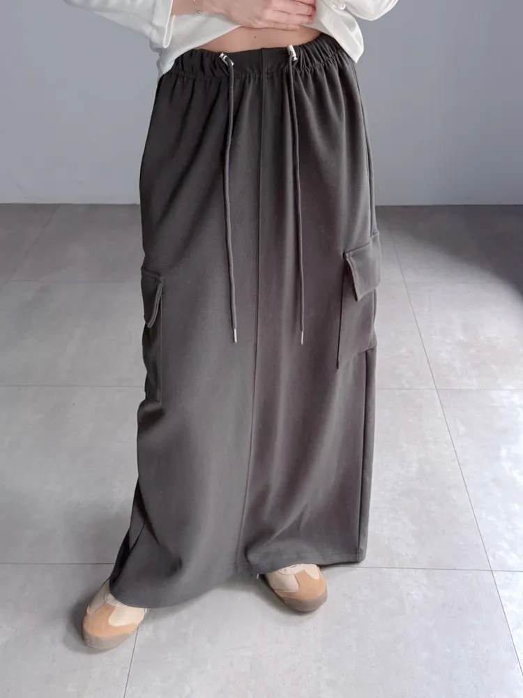 [特點] 鬆緊彈性腰圍,抽繩調節,工裝口袋、直筒長裙版型。